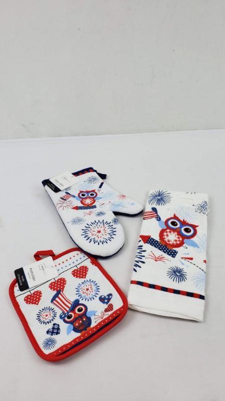 4th of July Owl Towel Set, Oven Mitt/Potholder/Kitchen Towel - New