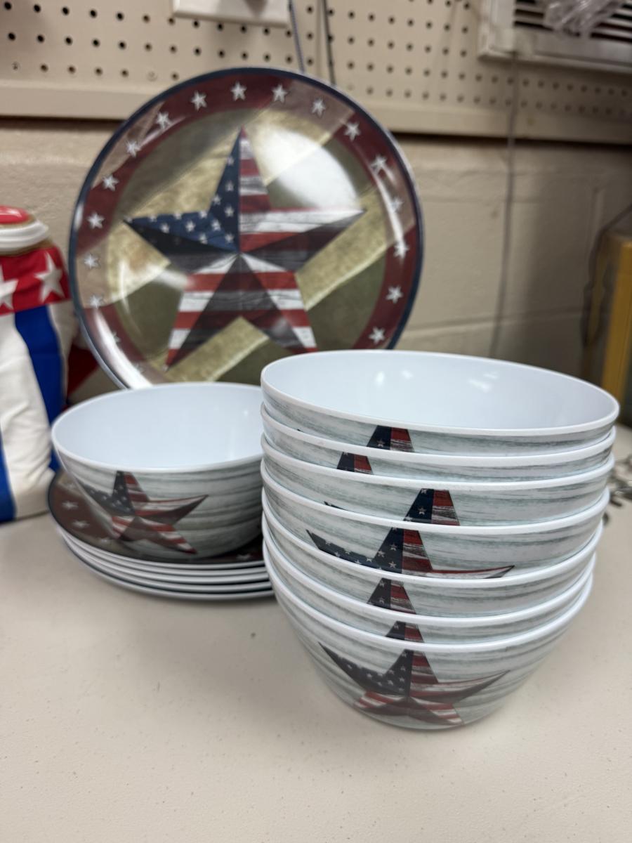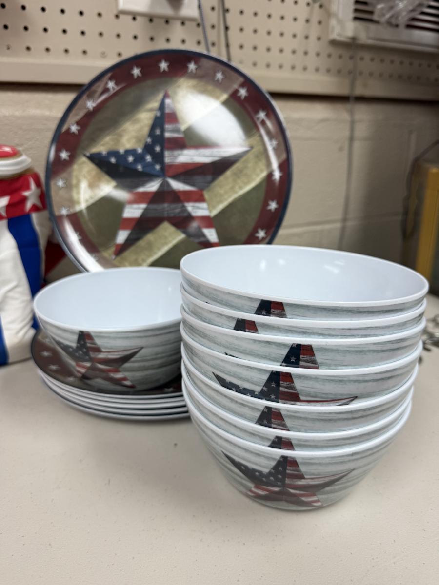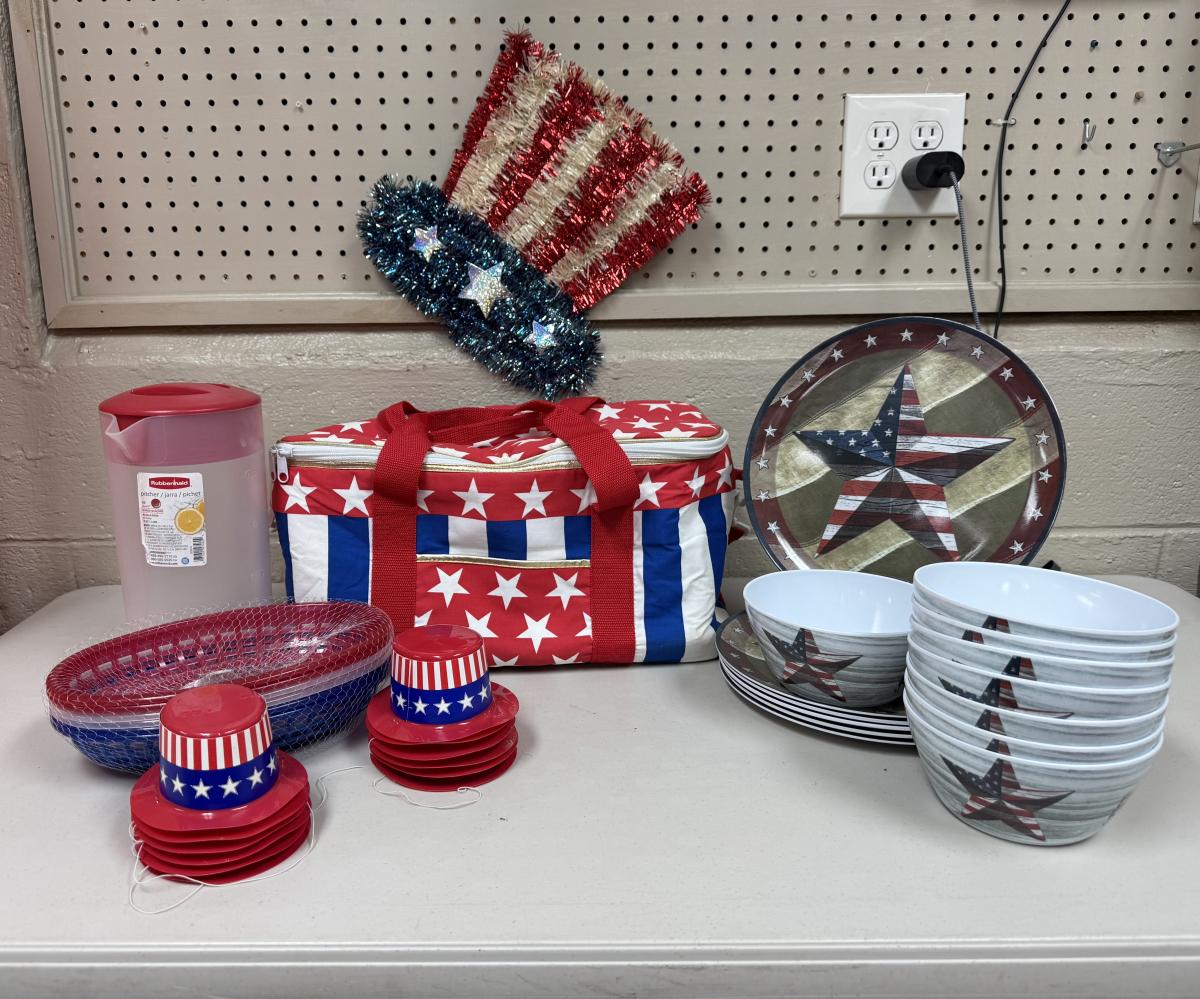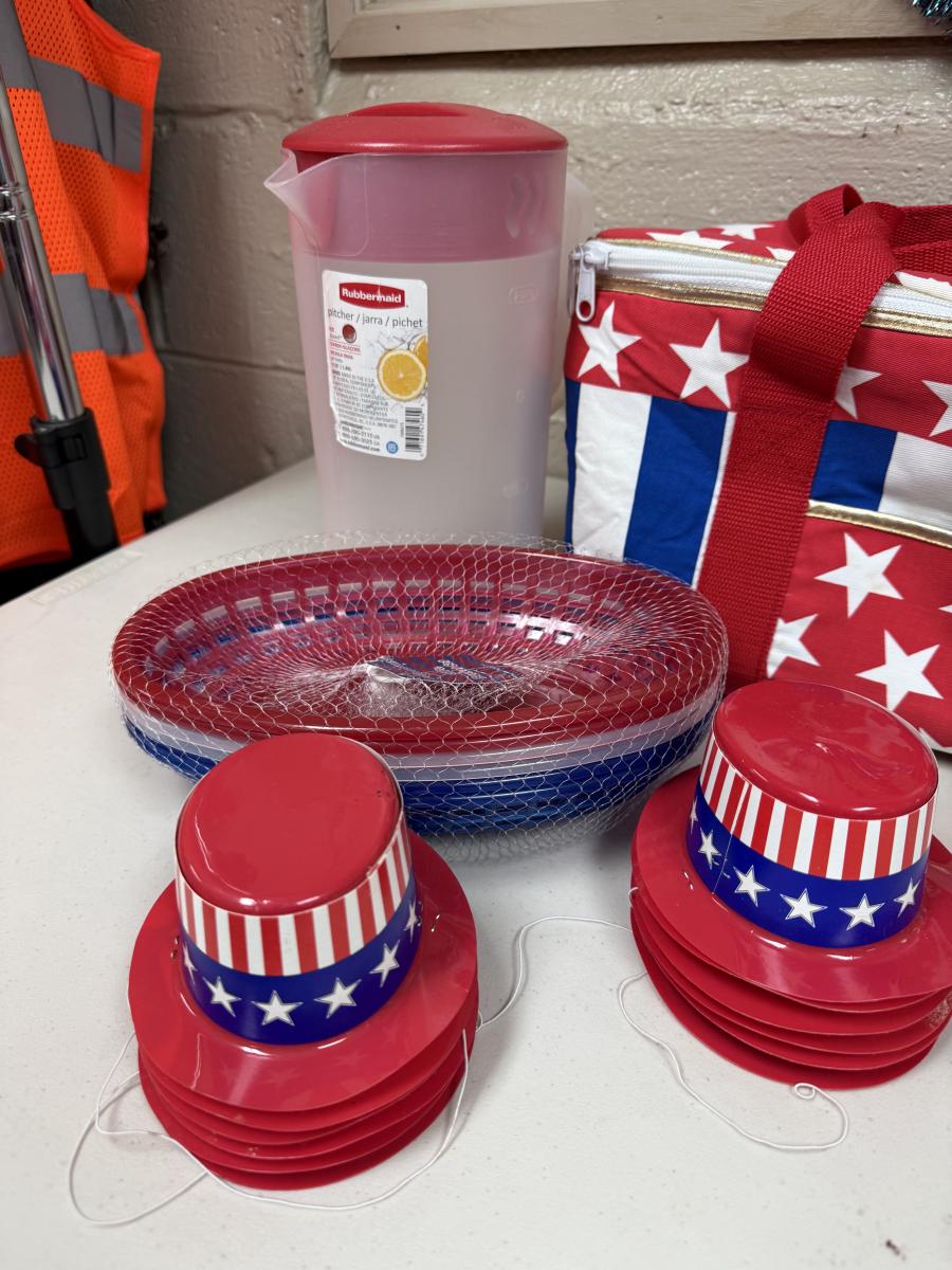 Pitcher, 6 plates, 8 bowls, 6 baskets, 12 party favors hats, frilly flag, insulated bag