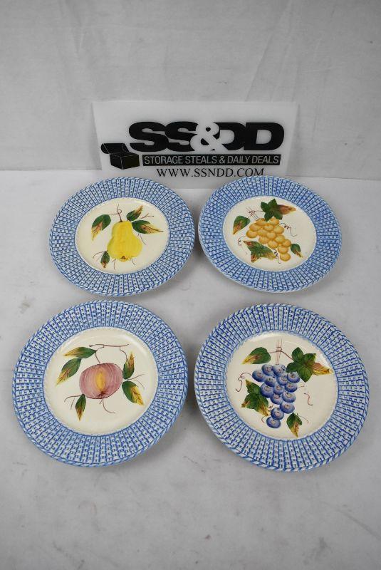 4x Jay Wilfred Decorative Plates. Blue Basketweave Design with Fruit. Portugal