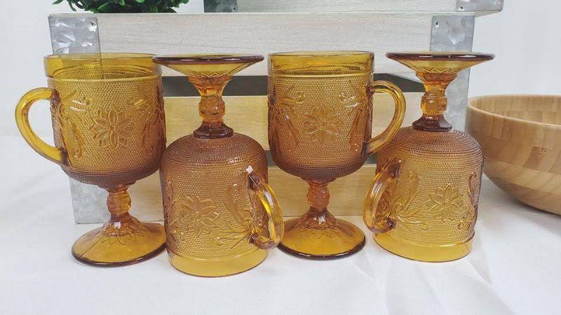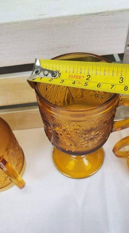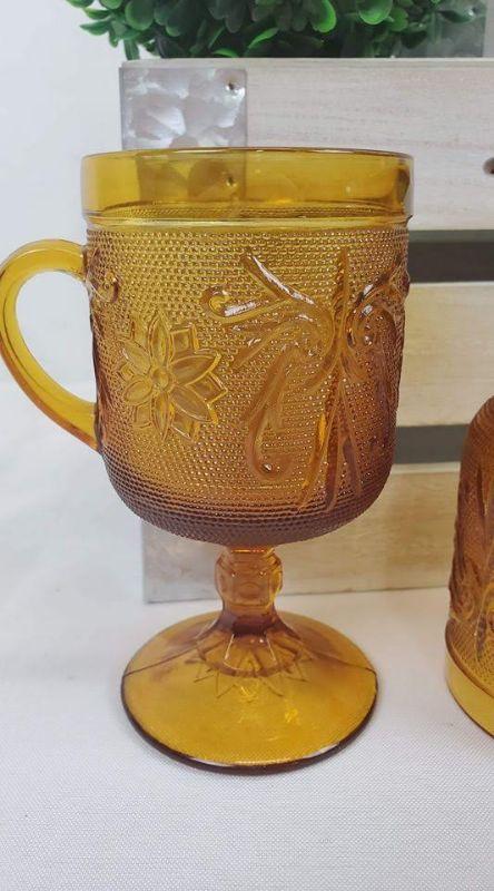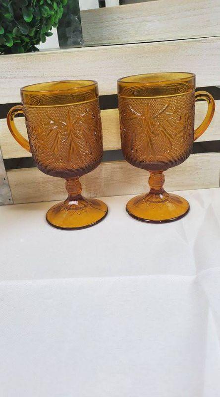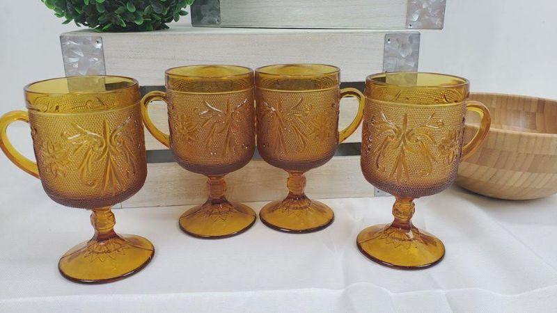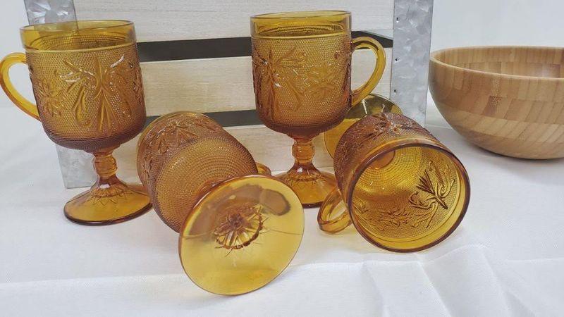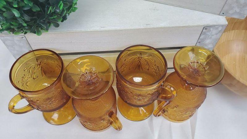4x Vintage Tiara Indiana Amber Footed Glasses w/ Handles, Daisy Sandwich Pattern