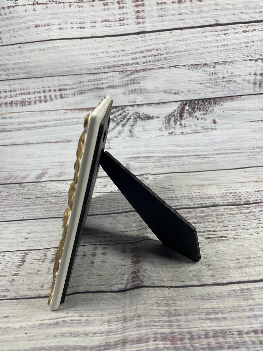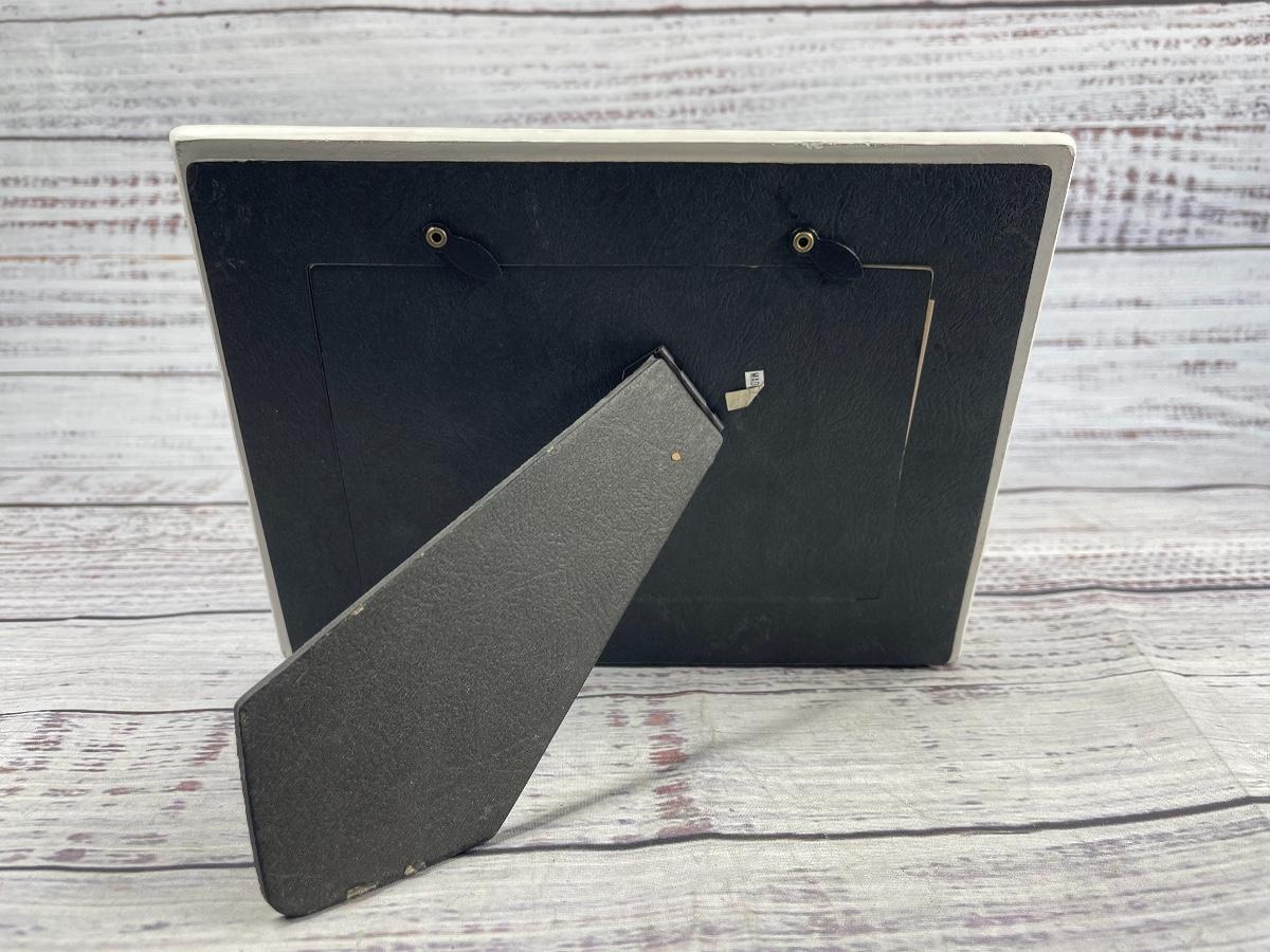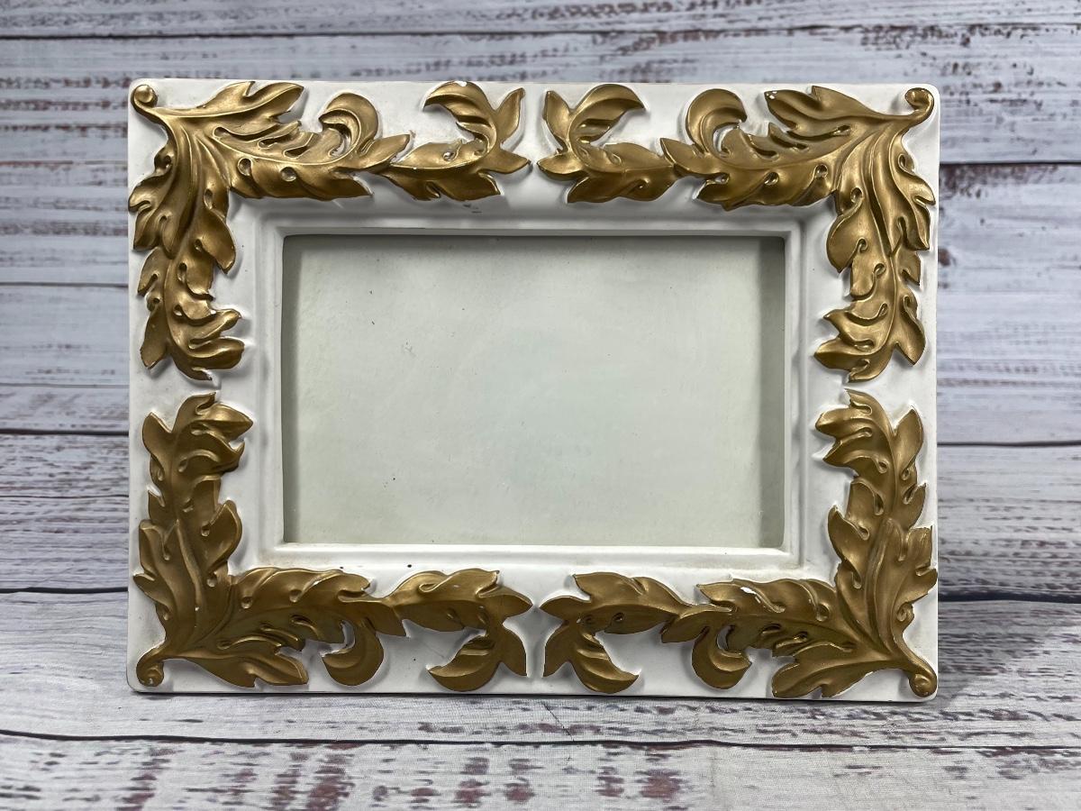 4x6 White and Gold Leaflet Picture Frame, there are no significant chips or cracks to the frame and is in good condition. There is little to no discoloration, the frame is made in Taiwan. Check pictures for more details.