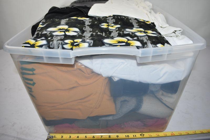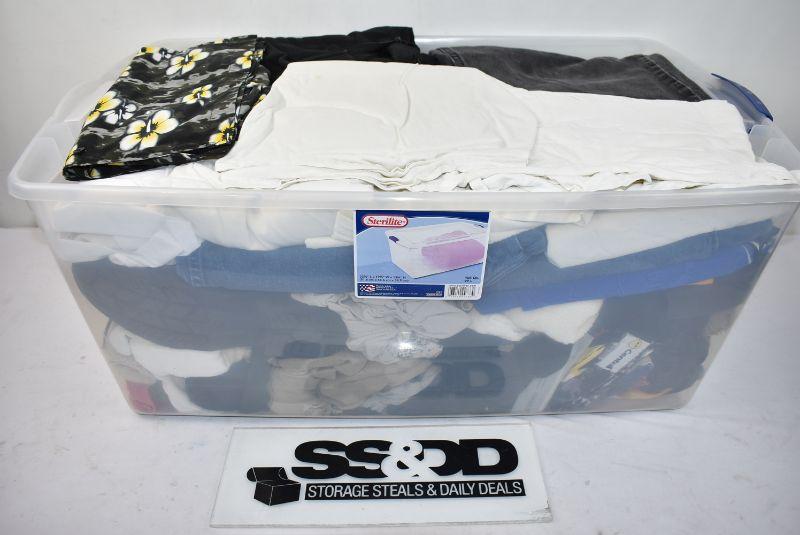 #5 105 Quart Clear Bin (with Clear Lid) Full of Men's Clothing: Shirts, Pants, Socks, and More