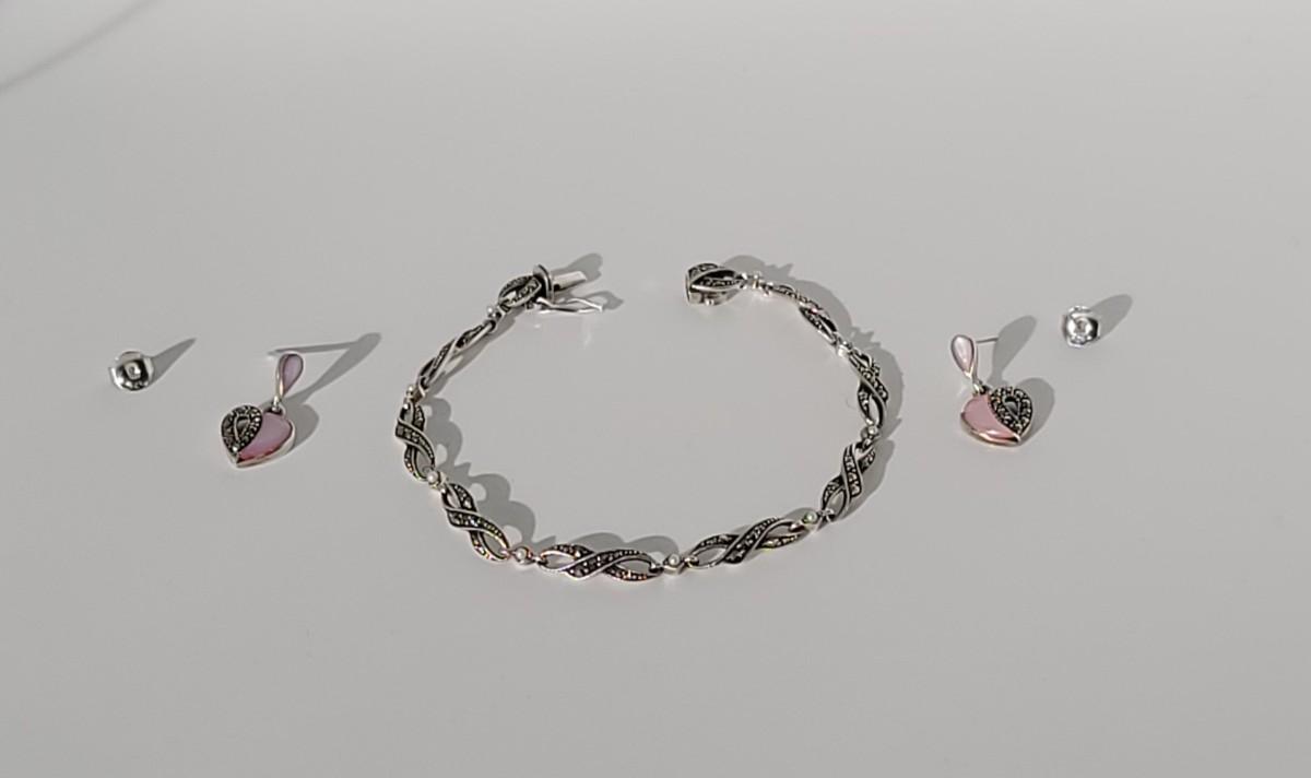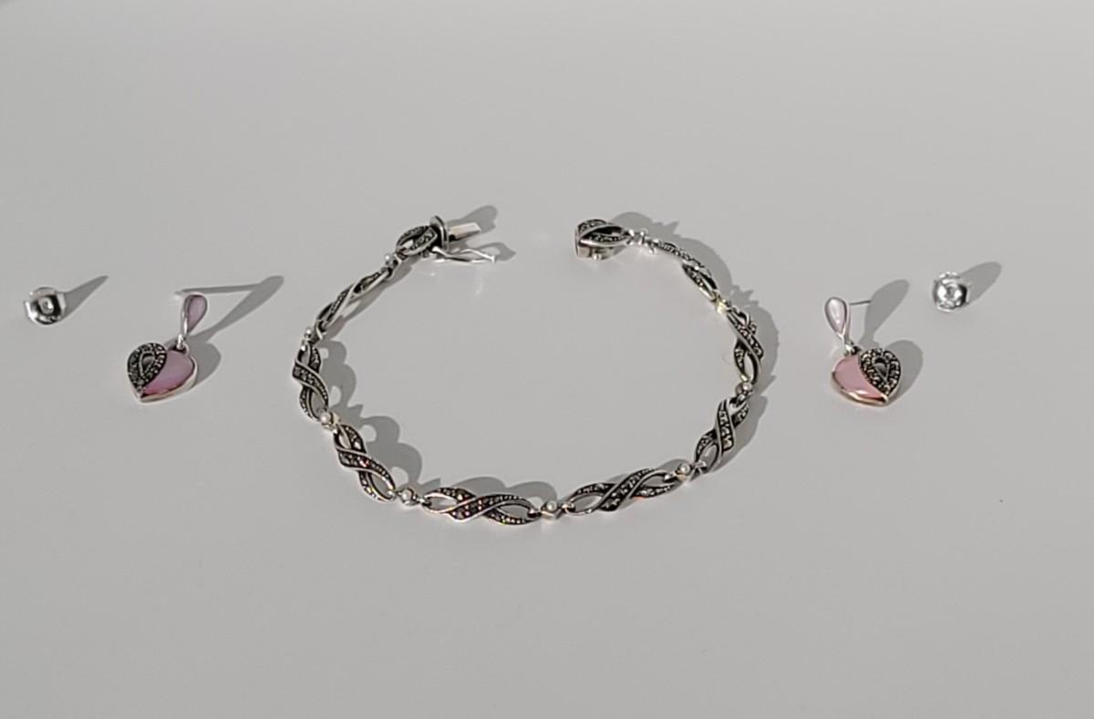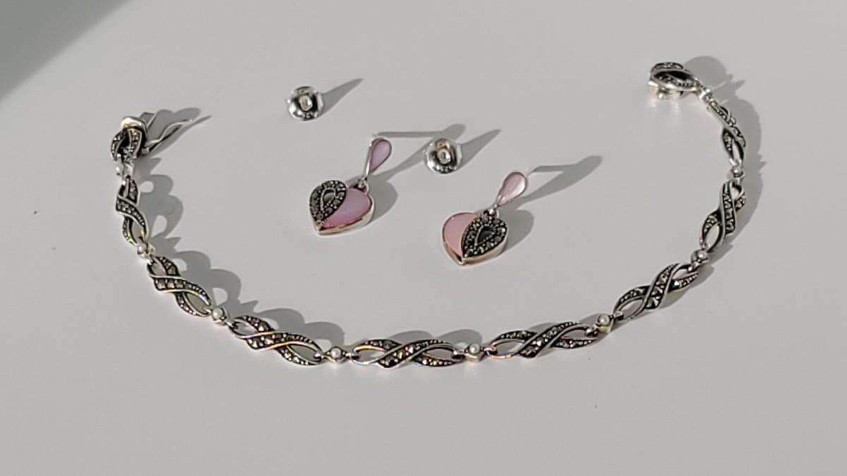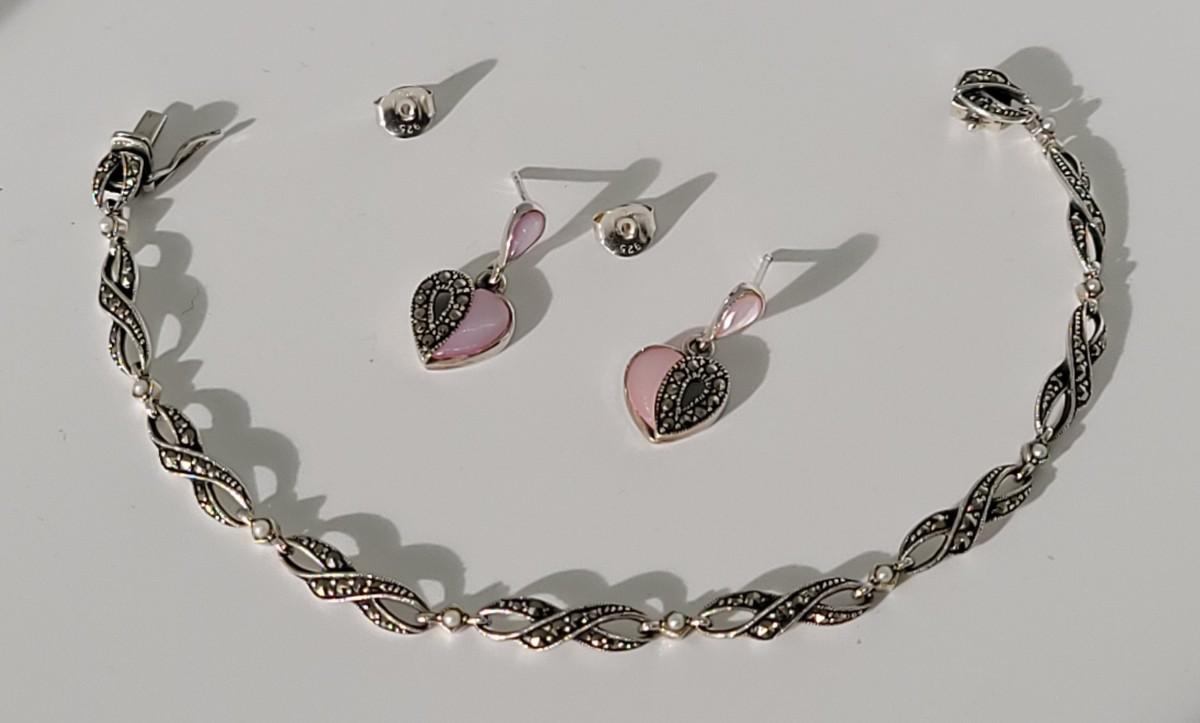 Heart shaped pink and marcasite pierced earrings along with a Sterling & Marcasite bracelet with seed pearls. Preowned - Great condition.