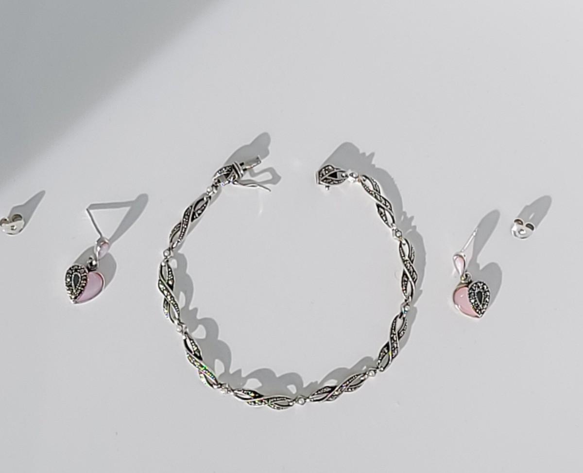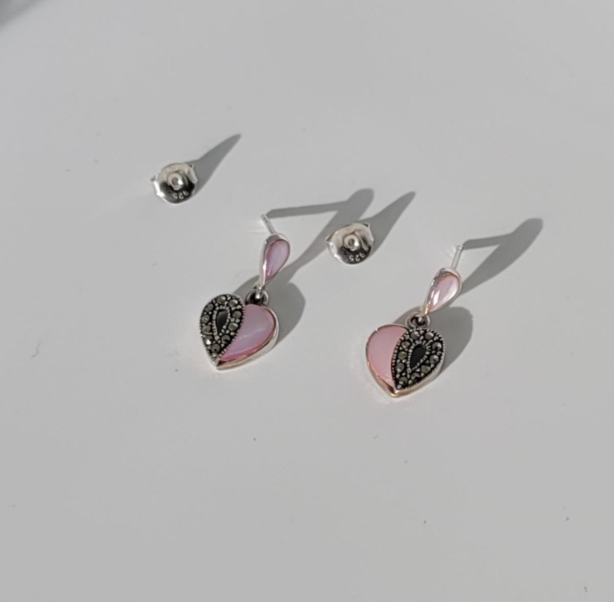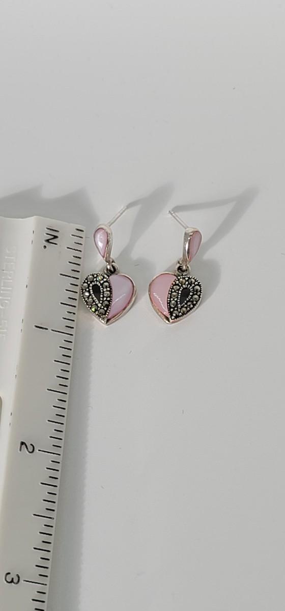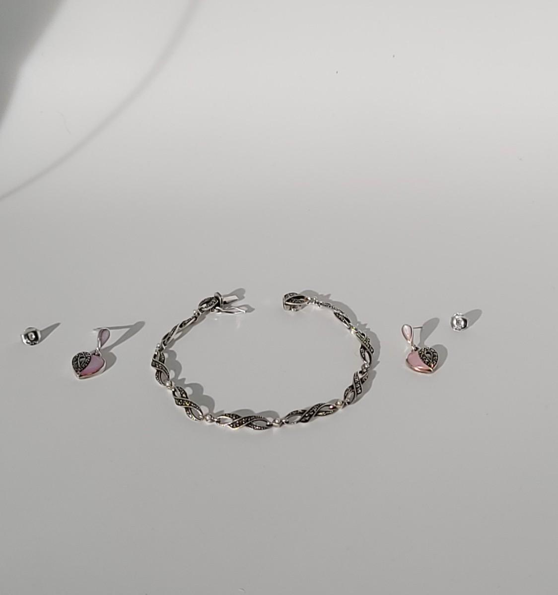 Heart shaped pink and marcasite pierced earrings along with a Sterling & Marcasite bracelet with seed pearls. Preowned - Great condition.