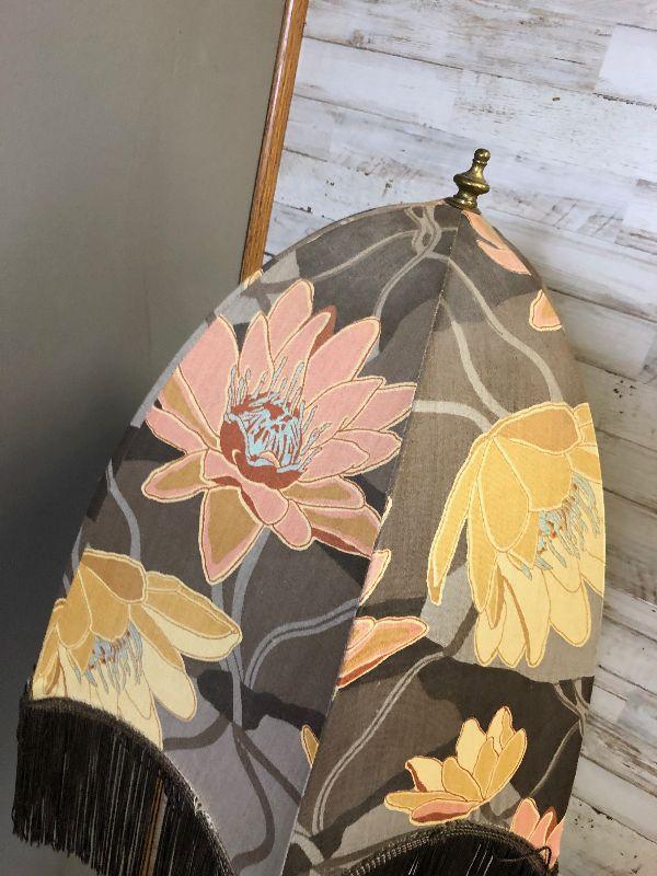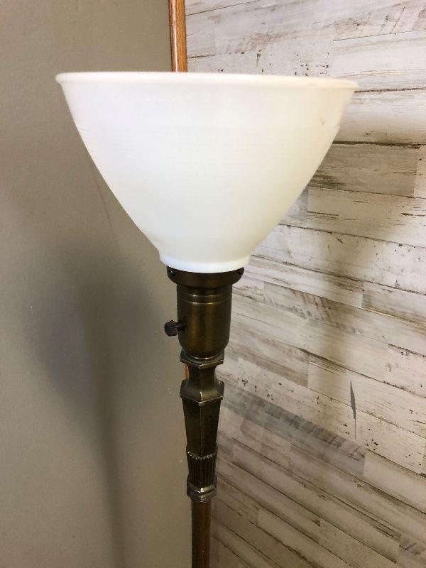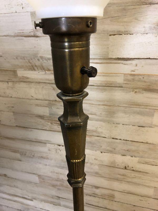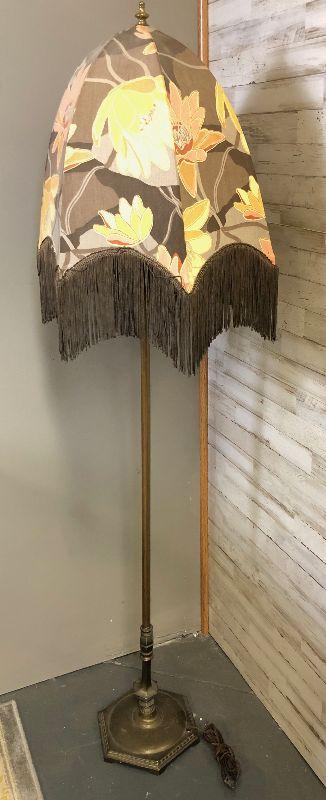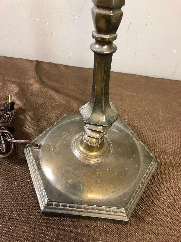 Not tested. Complete. Switch turns, cord is a bit brittle but not broken. Wonderful Art Nouveau Shade in antique Brass Metal