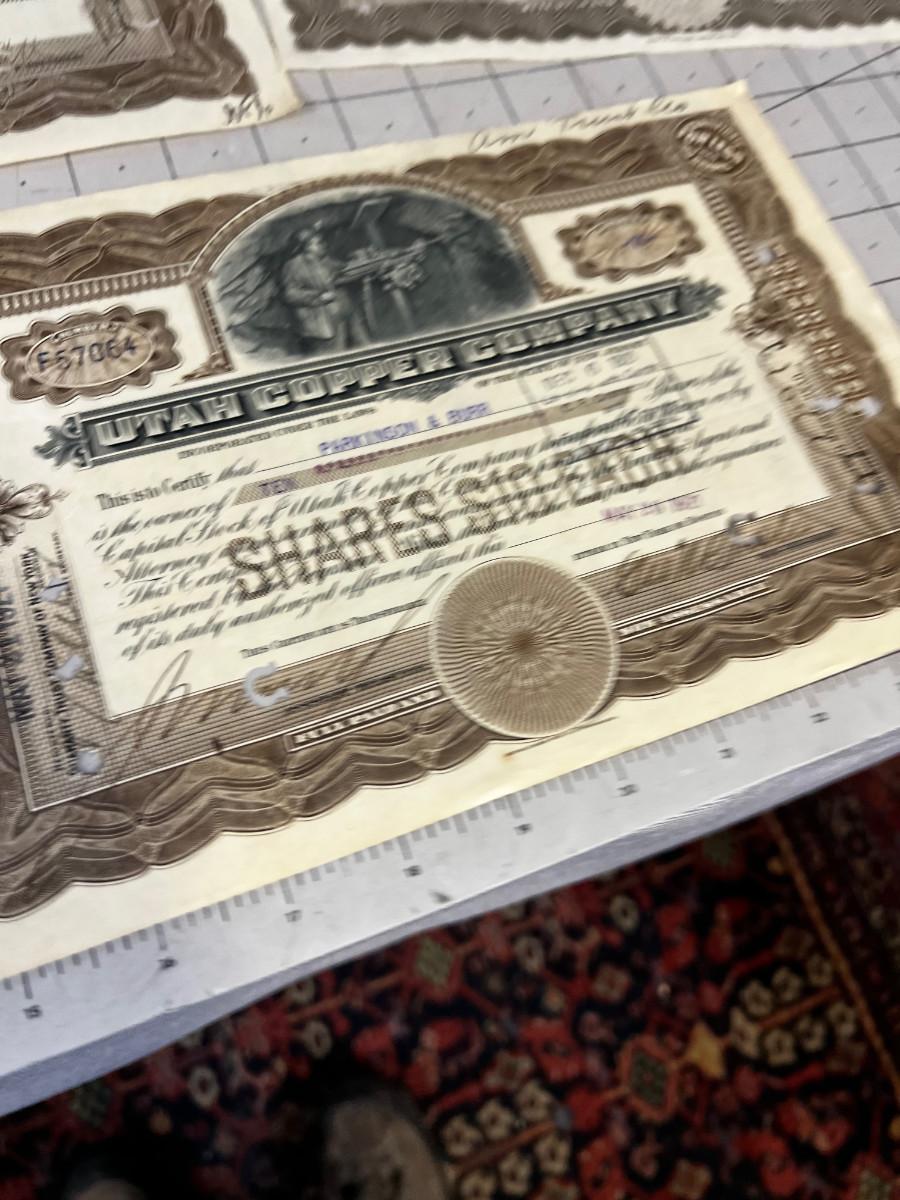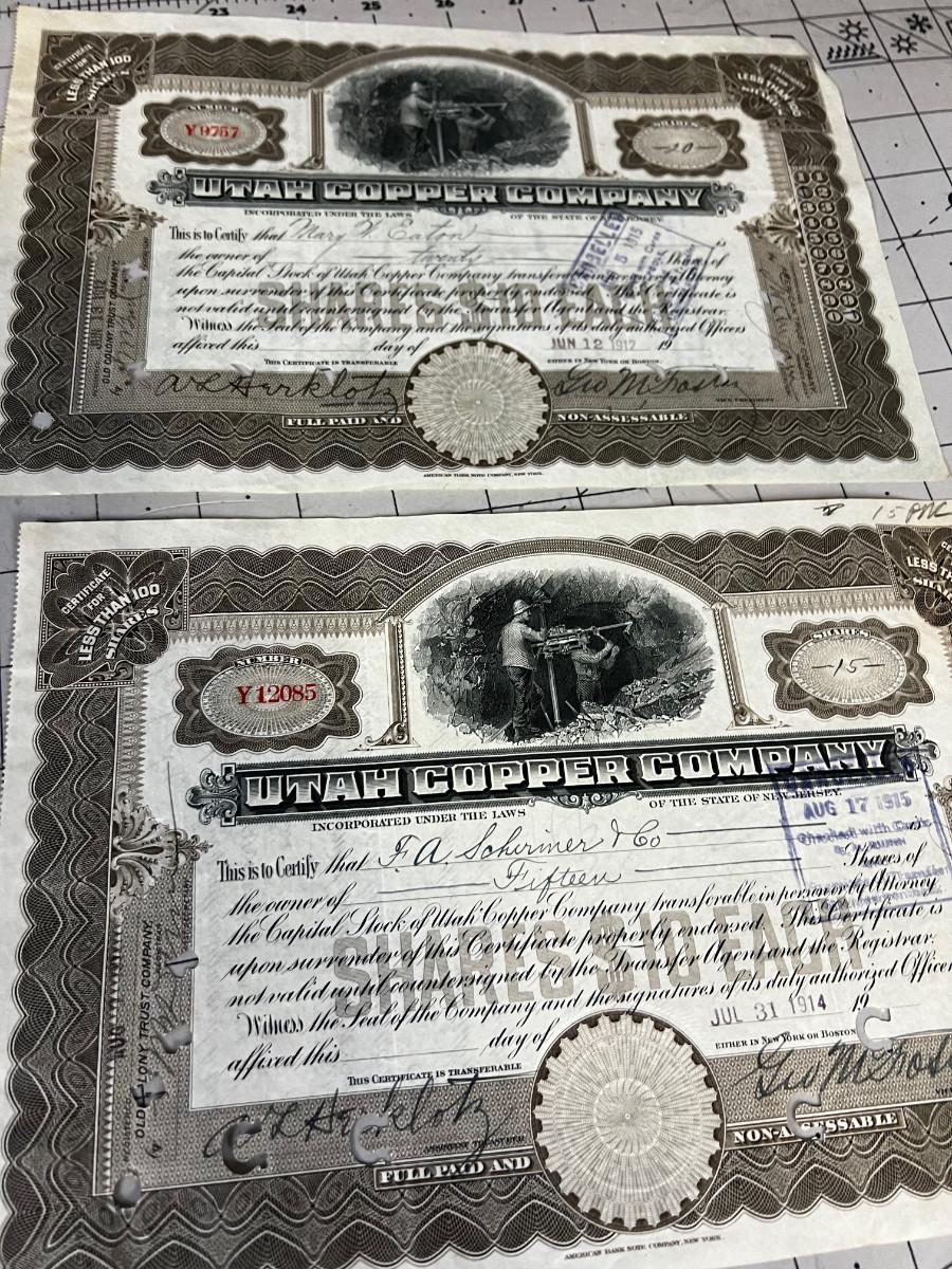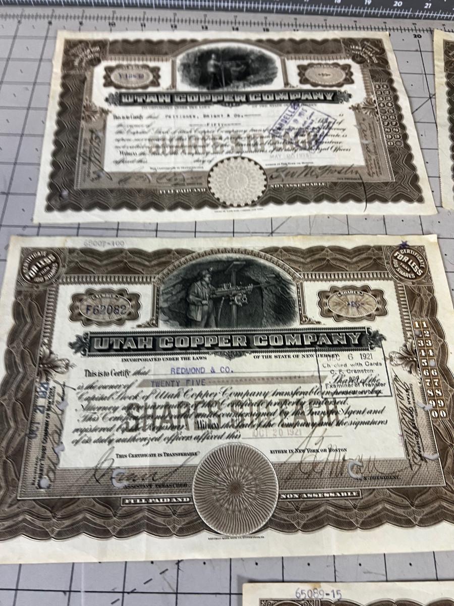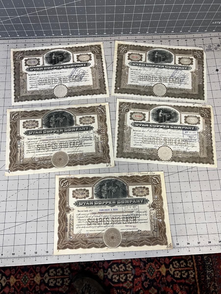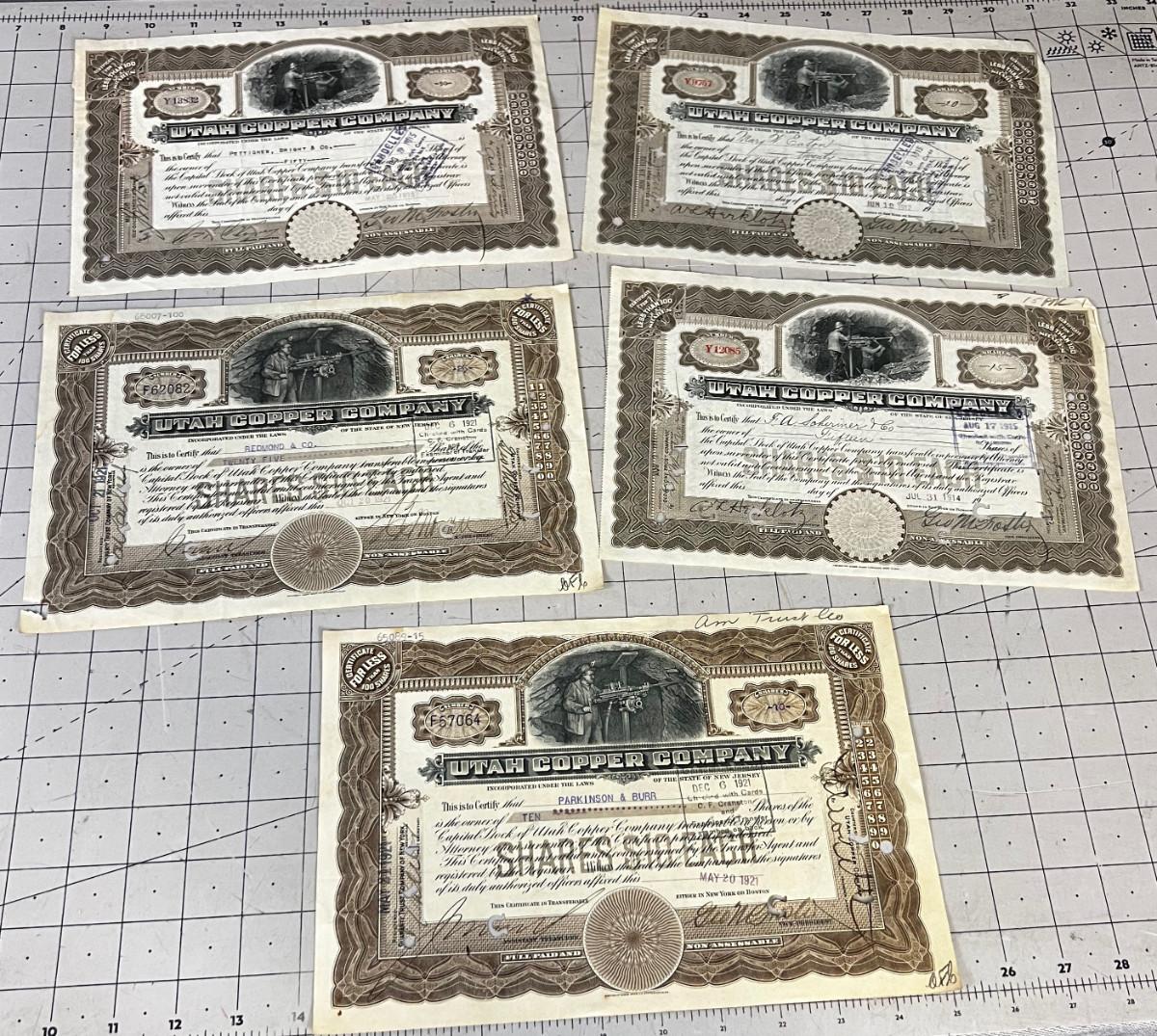 5 Antique Utah Copper Company 1915 and 1921 Stock Certificates