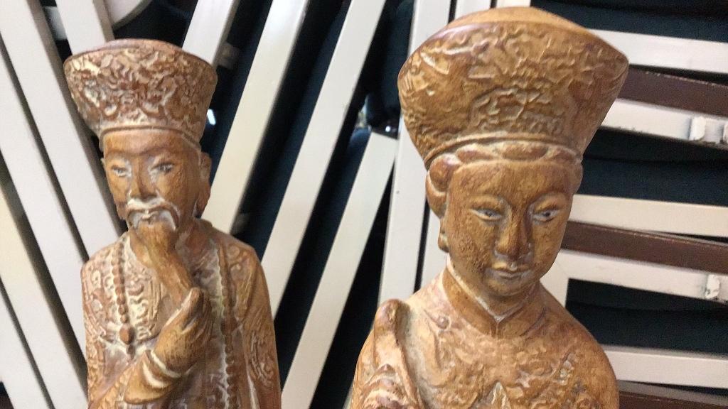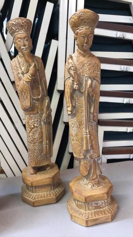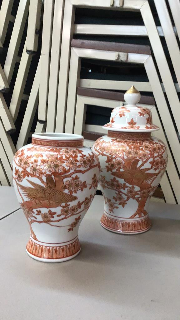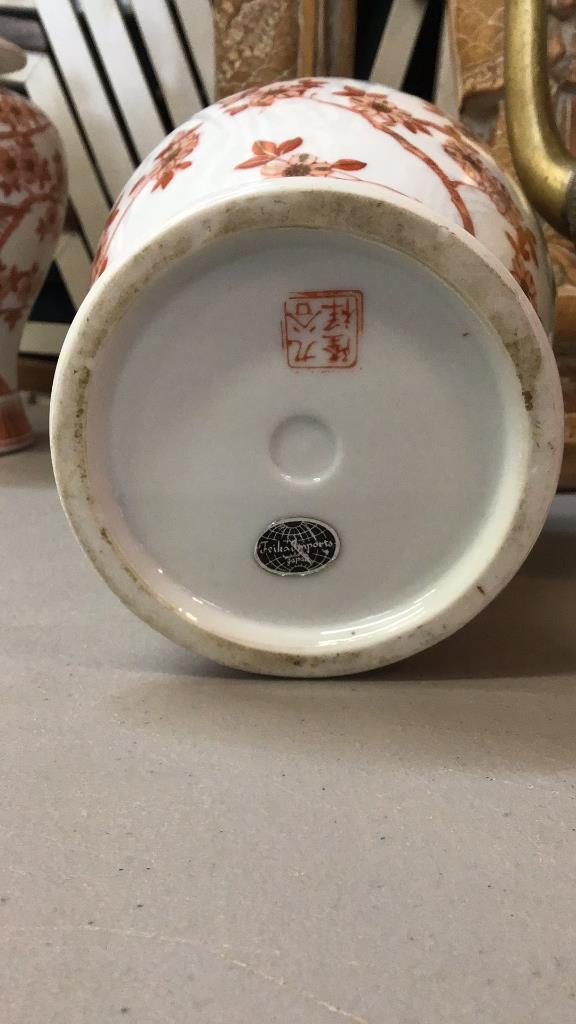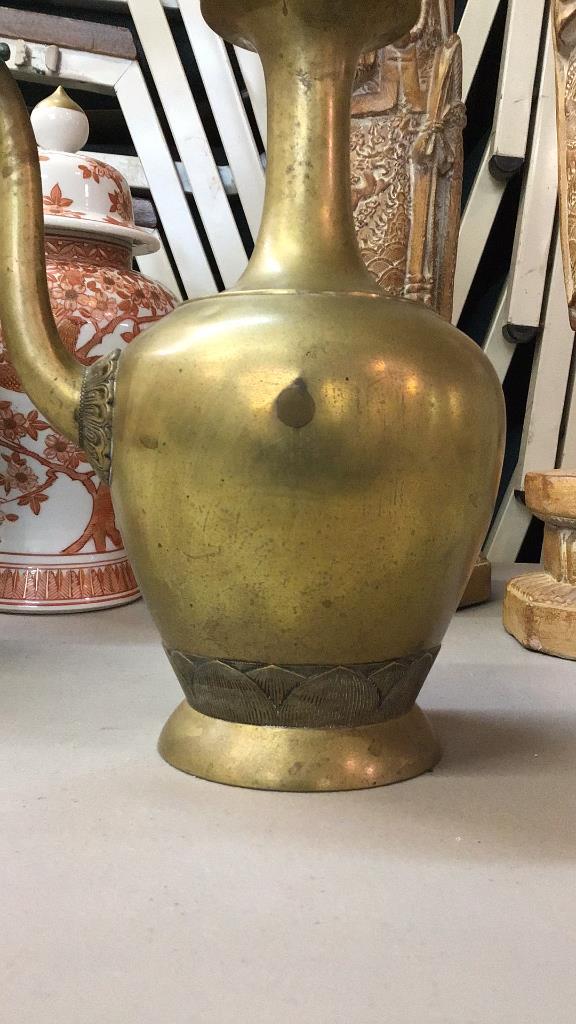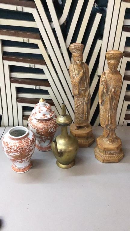 Brass pot with skinny spout, lotus flower trim at base..pair orange painted jars, 1 lidded, Chop mark on bottom with Feika Imports sticker, made in Japan..pair porcelain statues, 22 inch height, sticker on