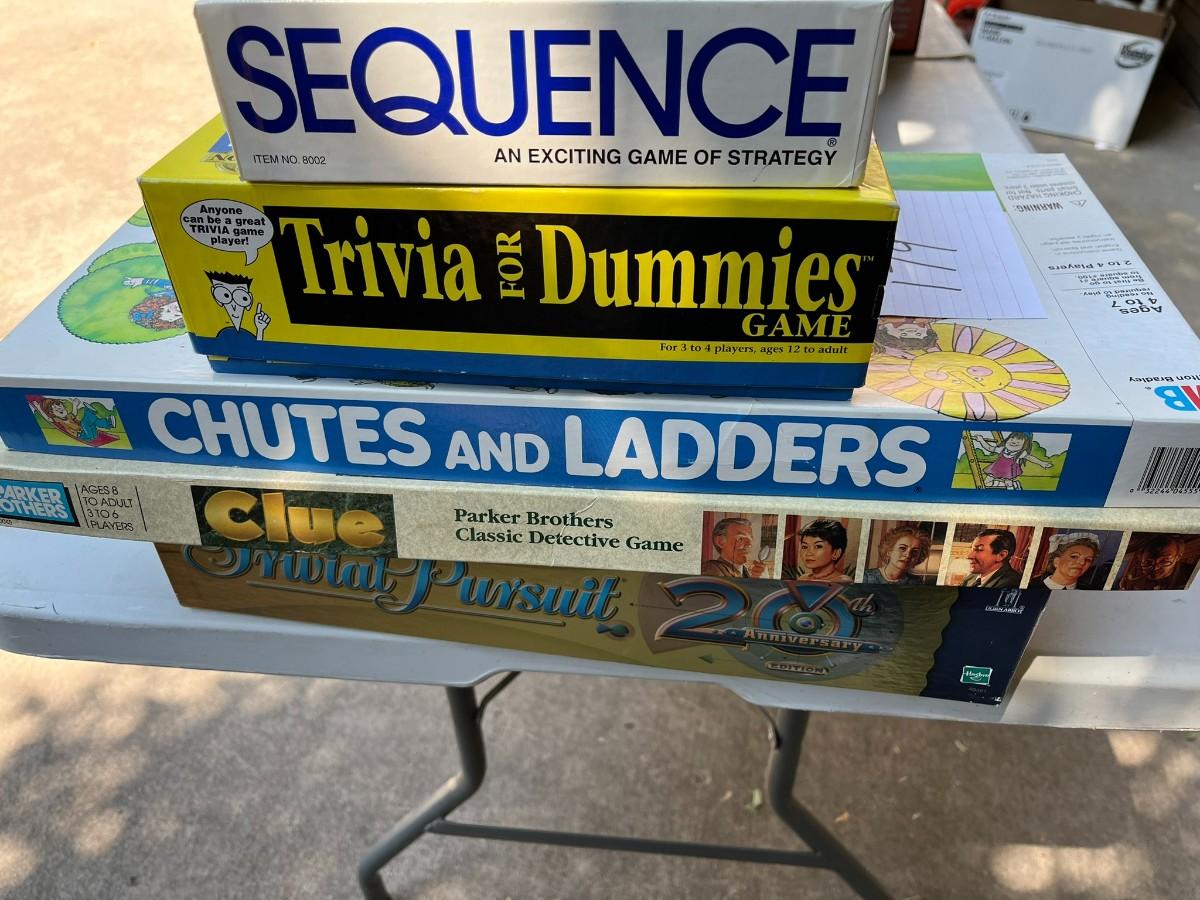 5 Assorted Board Games: Clue, Chutes and Ladders, Trivial Pursuit, Trivia for Dummies, Sequence