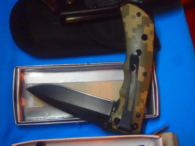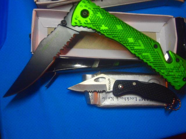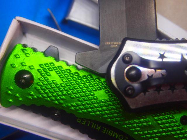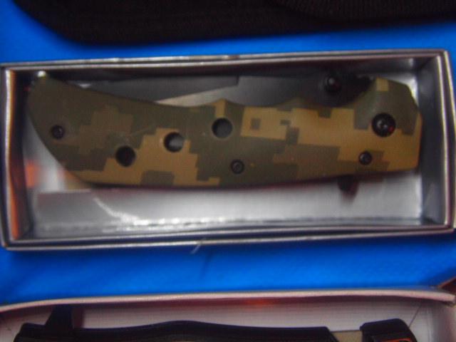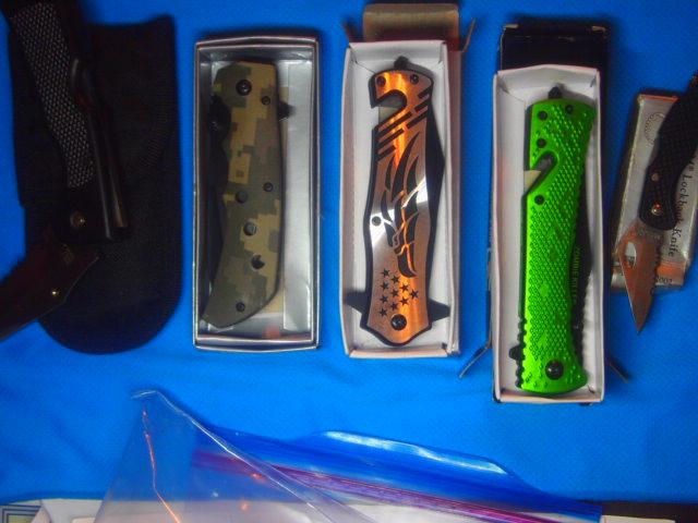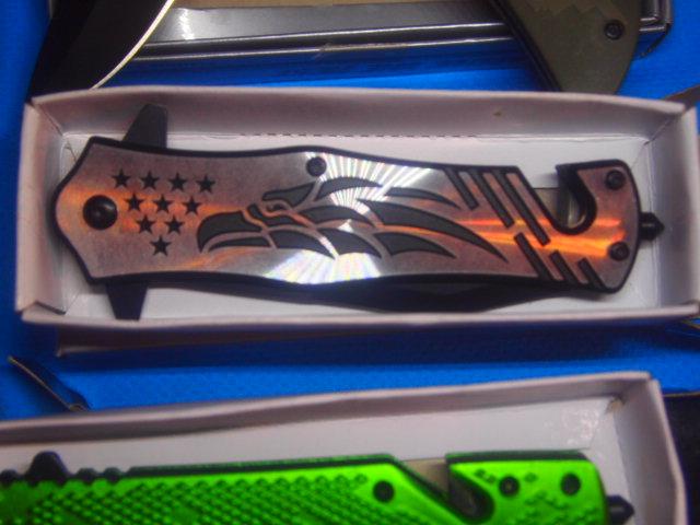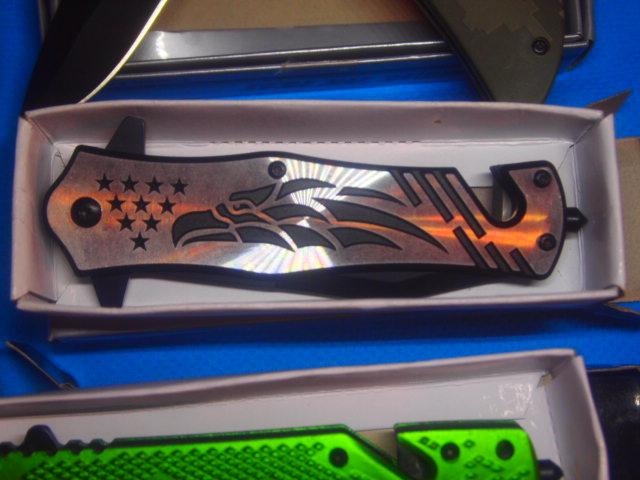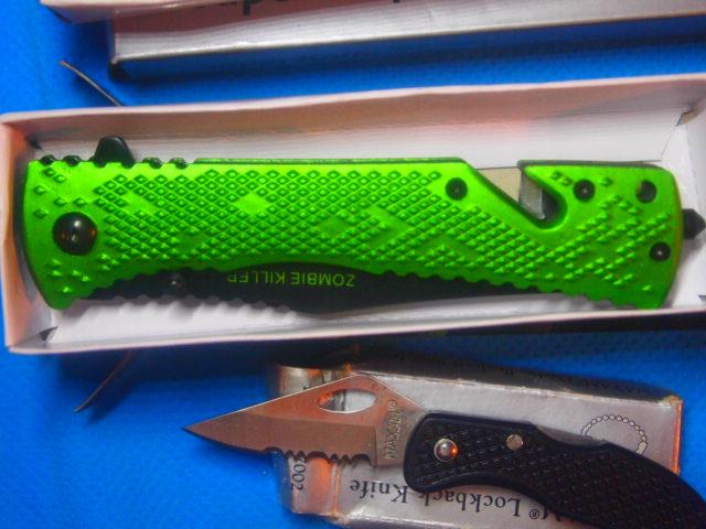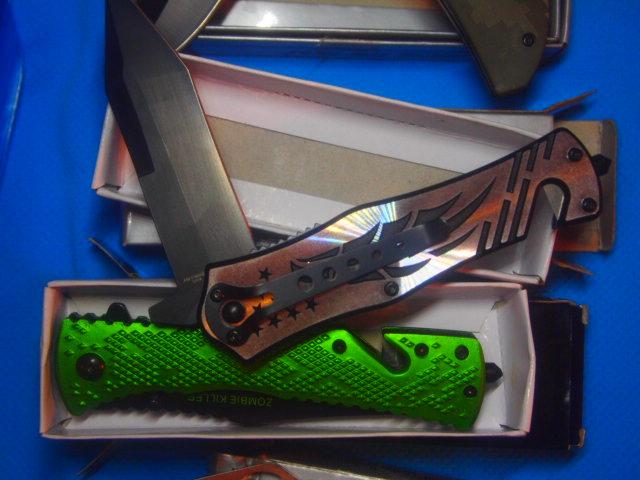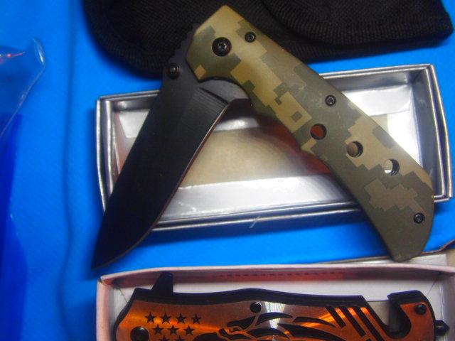 5 assorted New knives all are Stainless Steel blades included is One utility knife w/Sheath. One Digital Camo Knife with Belt Clip, One Screamin Eagle With Glass Break button and Seat Belt Cutter. One Zombie Killer Also with Glass Break button and Seat Belt cutter. One small key ring knife 1 inch blade