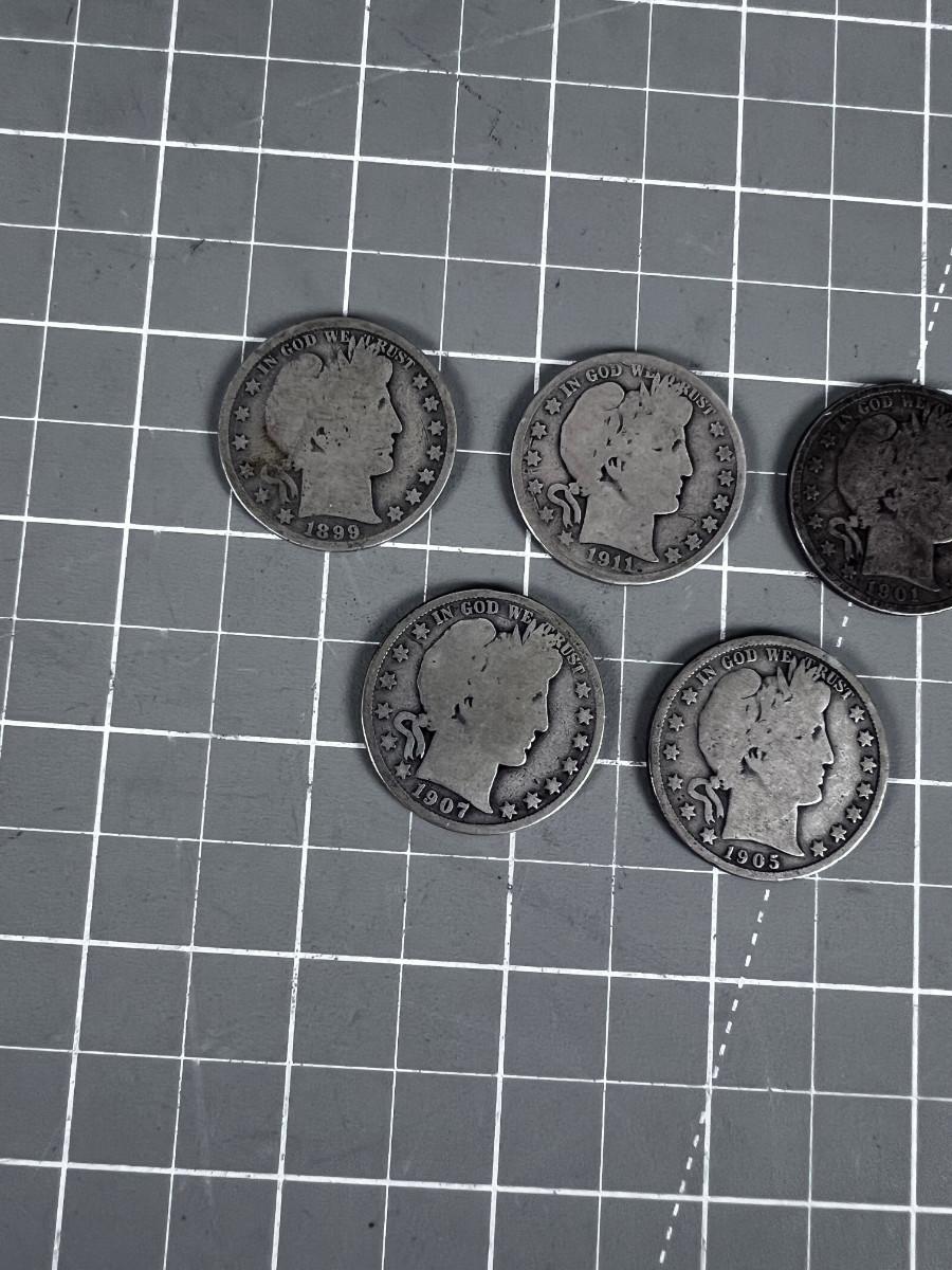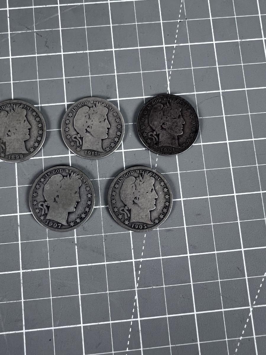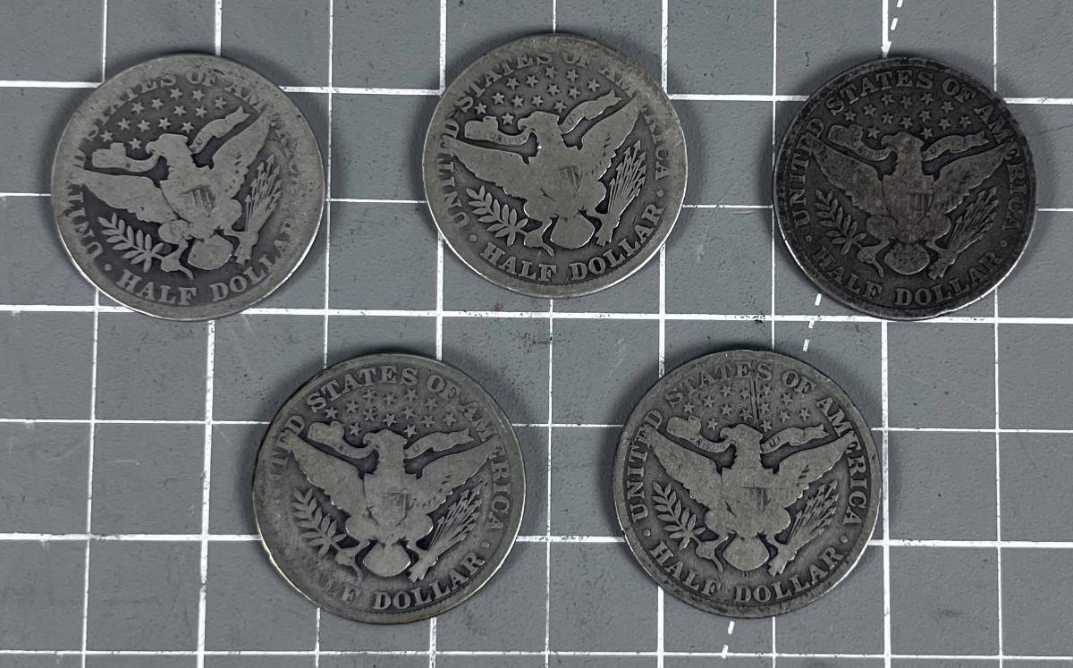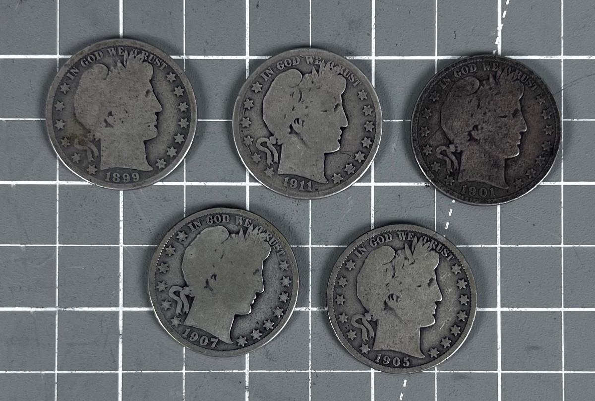 (5) Barber 90% Silver Half Dollars 1899 - 1911