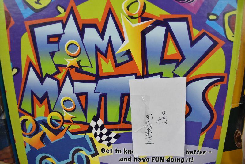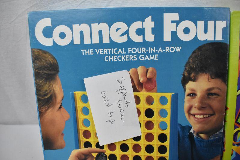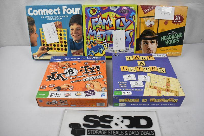 5 Board Games: Connect 4 (Supports broken, could be taped) Family Matters (missing die) Headband Hoops (missing 16 balls), Nab-It, & Take A Letter