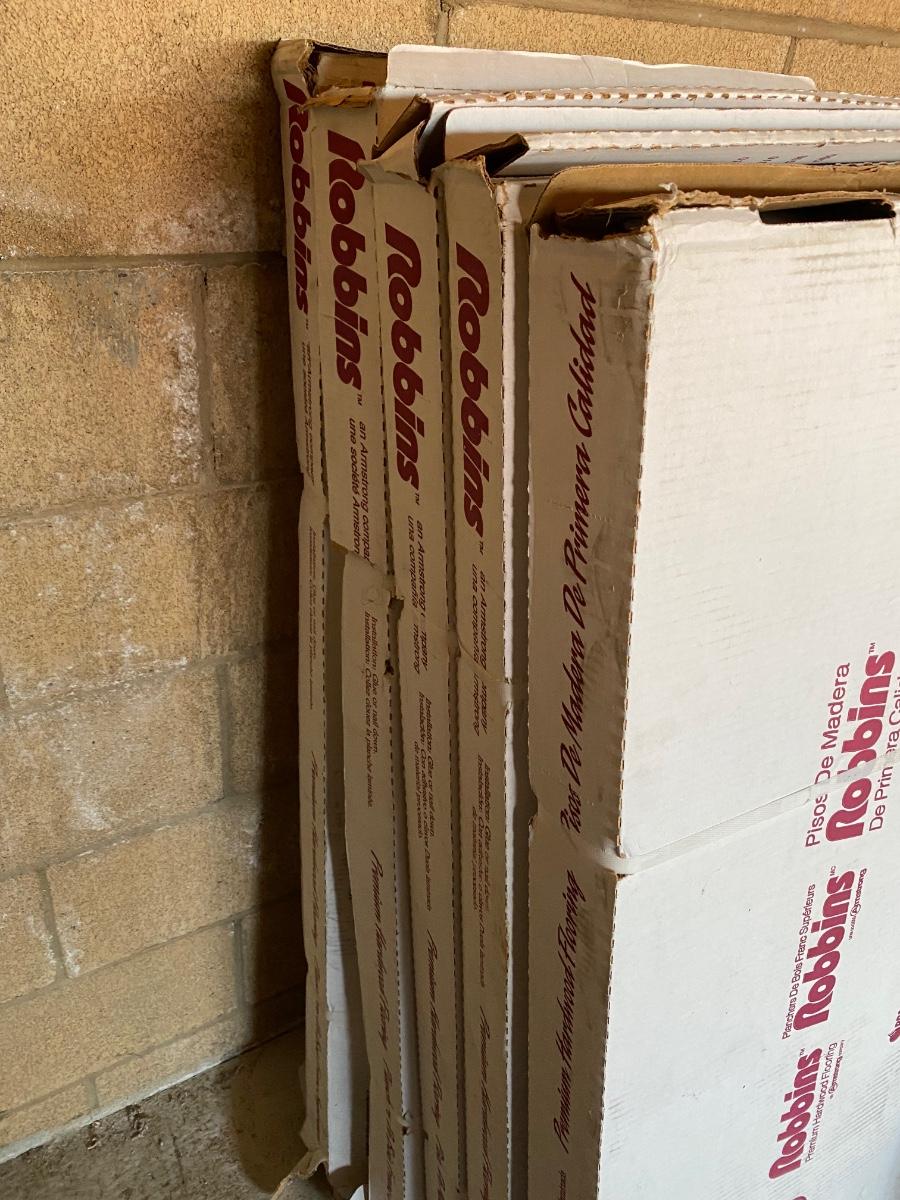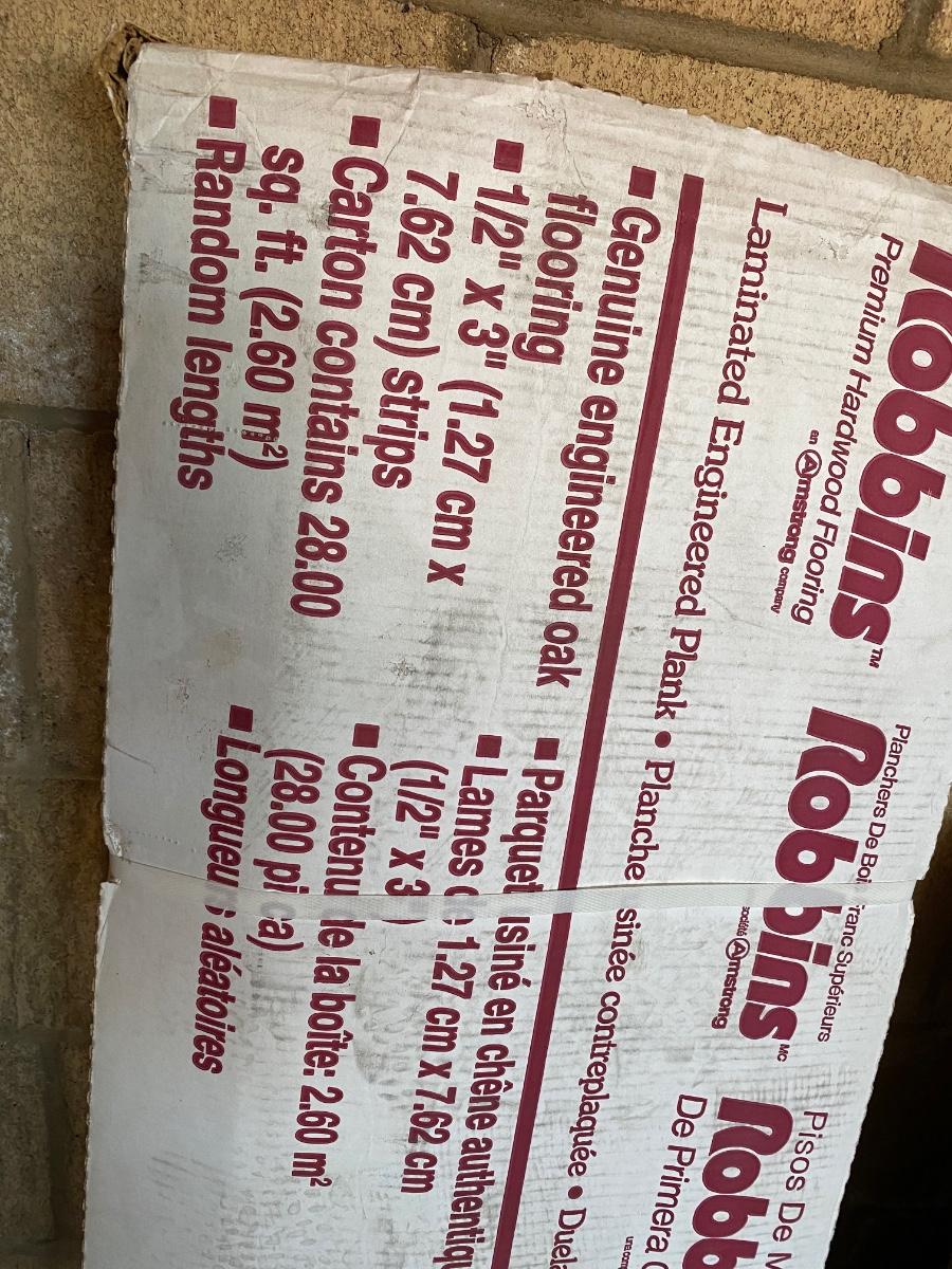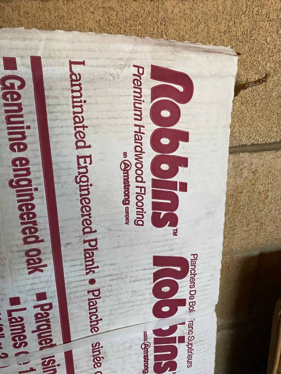 5 Boxes of Robbins New Traditional Laminated Plank Flooring Engineered Oak Light Finish. A couple boxes are open at the end but may still be complete, look full. Each box contains 28 sq. ft according to box. As is. May be discontinued flooring, unsure of age.