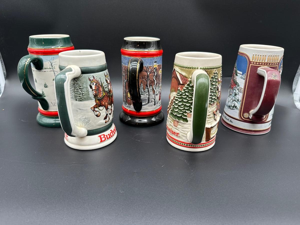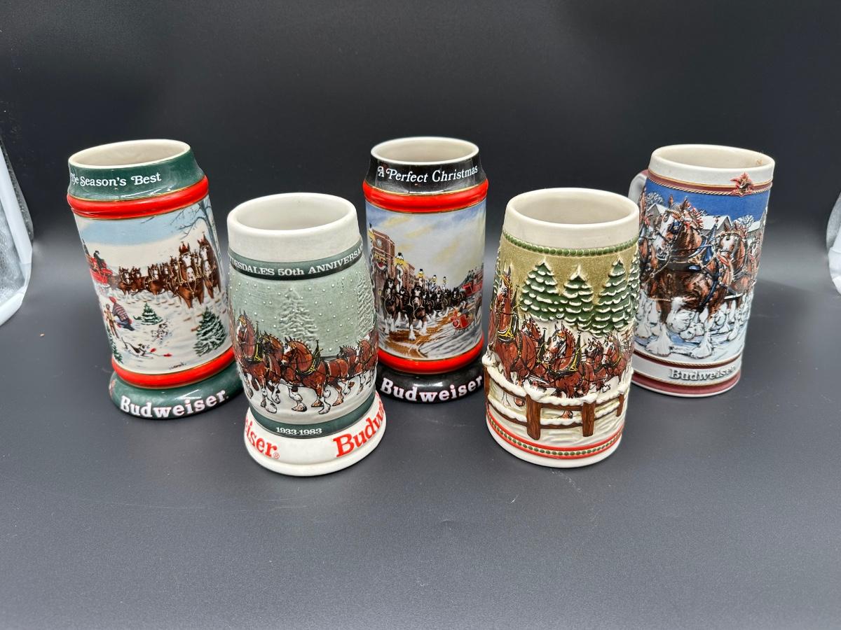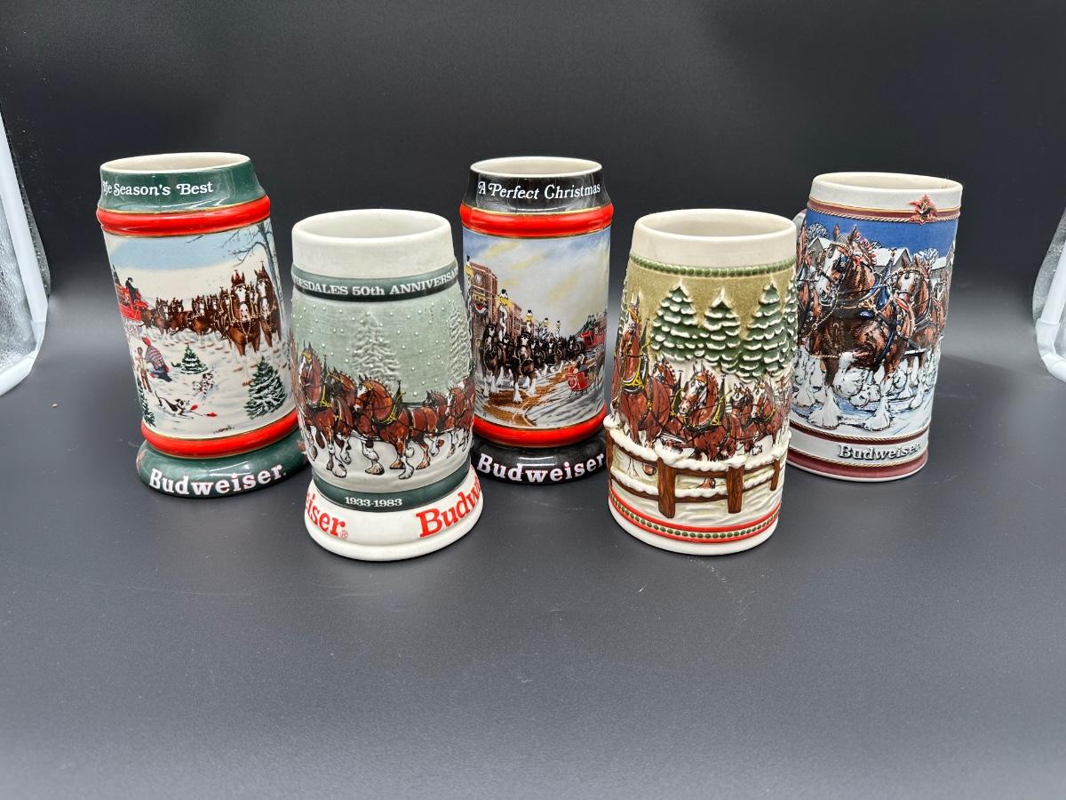 Group lot of five (5) Budweiser ceramic beer steins featuring the iconic Budweiser Clydesdales in winter and holiday scenes. These are official Anheuser-Busch steins, each with detailed artwork, raised textures, and classic Budweiser branding.
