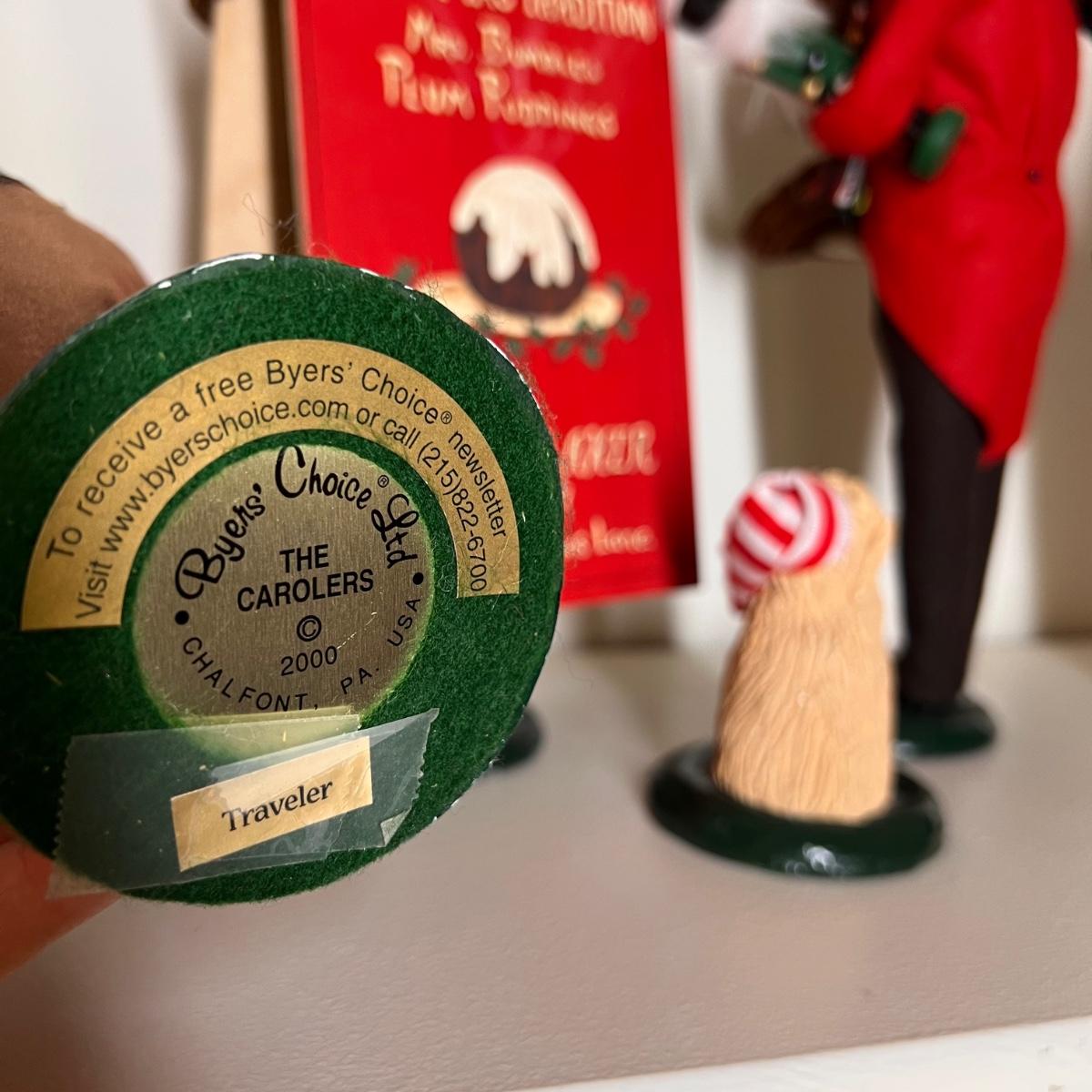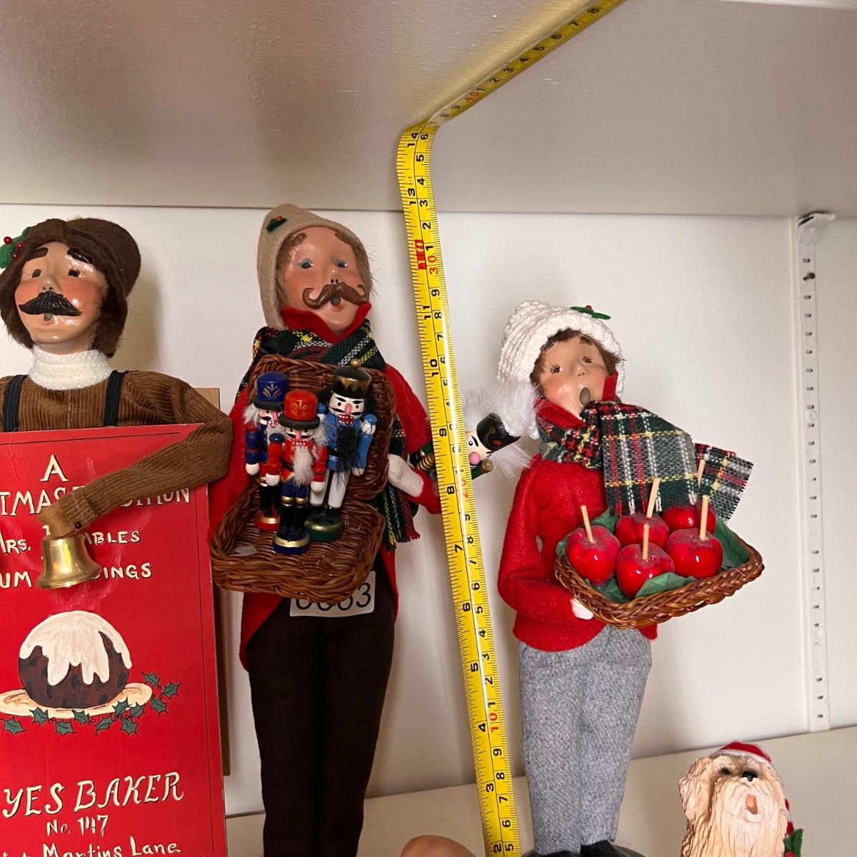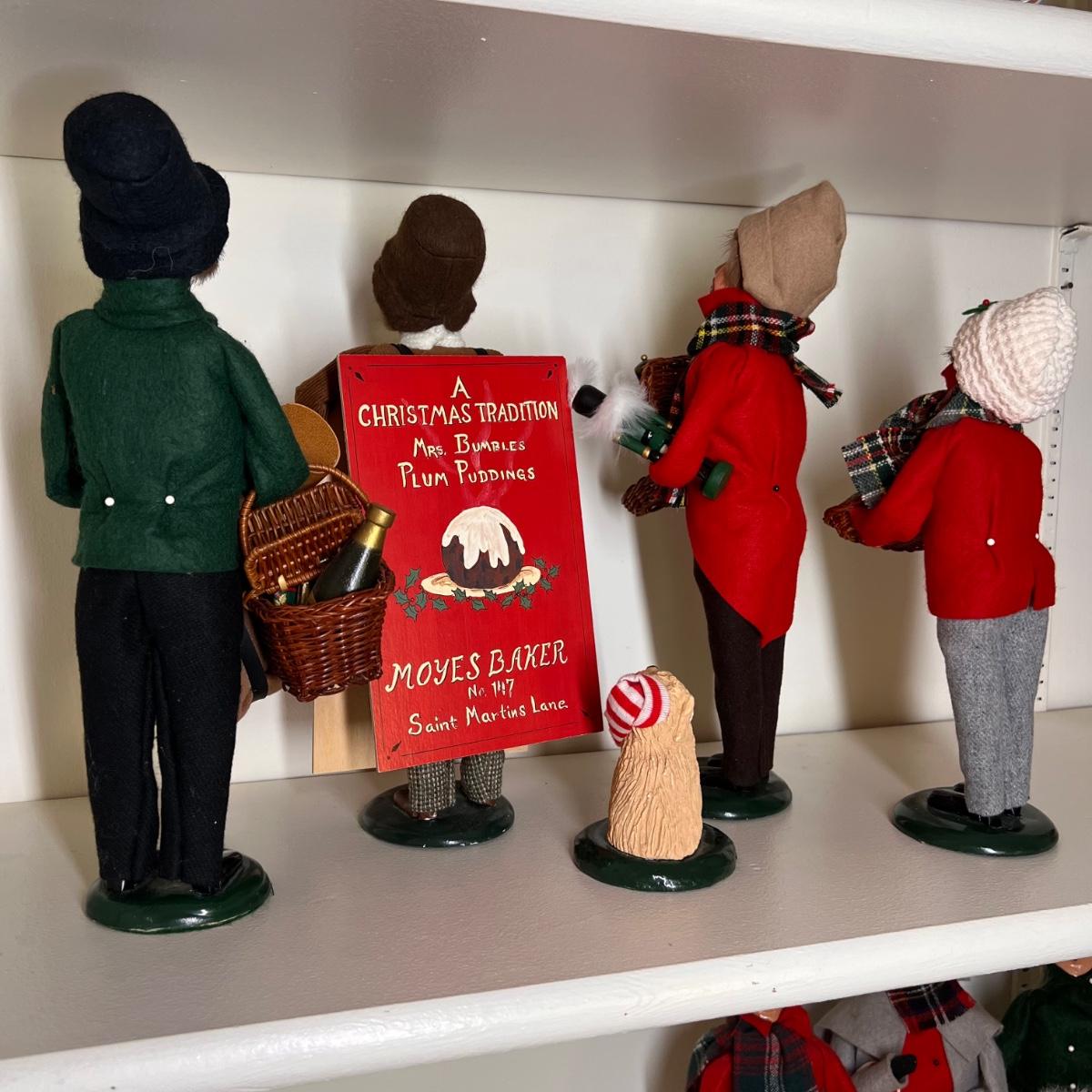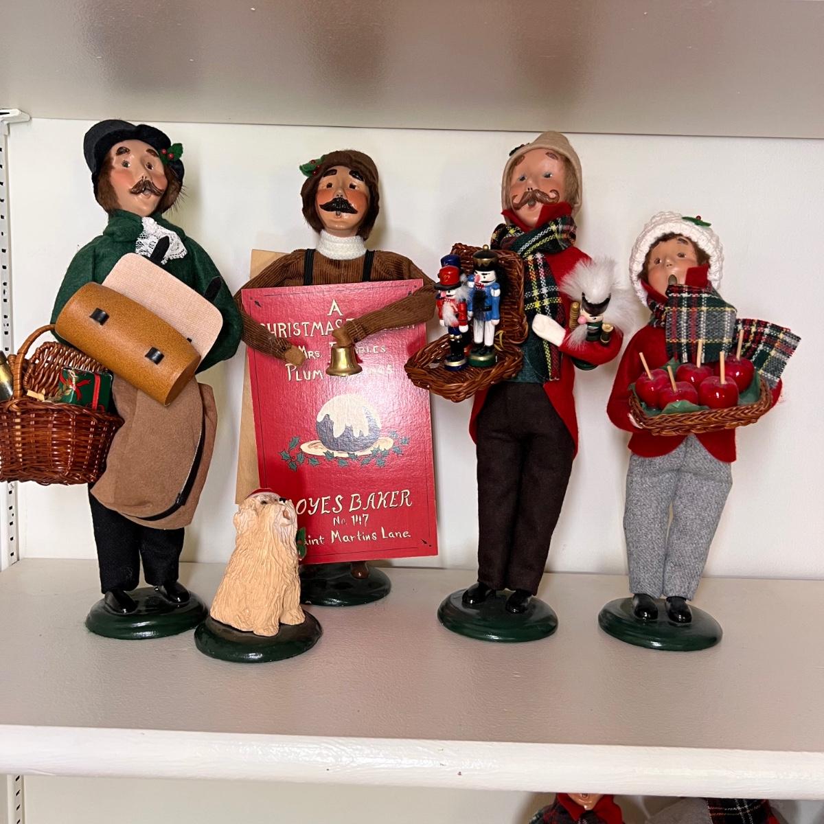 Including Dog, teen boy with apples, MOYES BAKER PLUM PUDDING sandwich board man, man with basket and Nutcracker Vendor Man. Christmas holiday