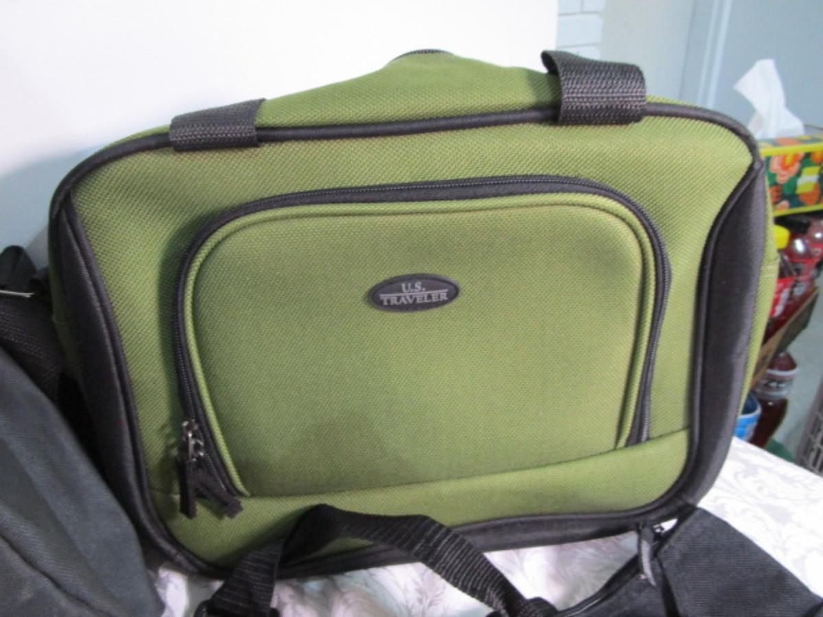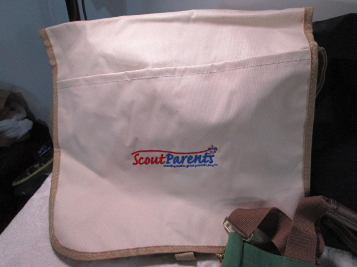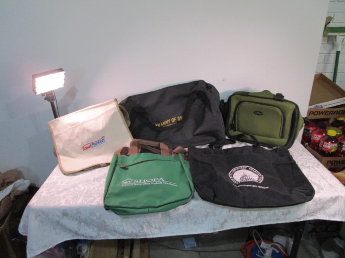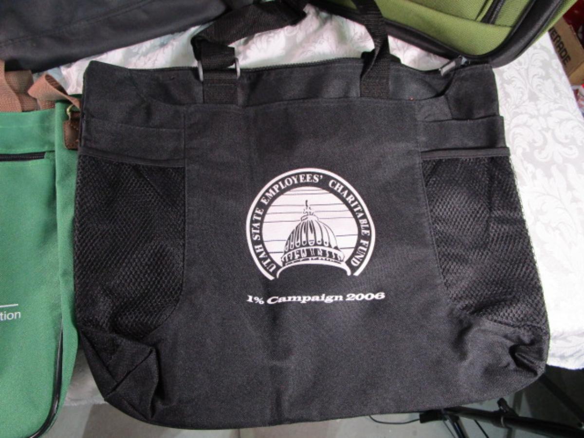 1 is a duffle bag is 11" deep x 22" long x 11" tall ; New Utah State Employees Charitable Fund bag is 15" x 18", New Shopa bag is 12-1/4" x 14" tall x 3-5/8" deep; New Scout Parents courier bag is 14" wide x 13-3/4" tall x 3" deep, US Traveler bag is 13" wide x 9-1/2" tall x 4-1/2" deep & has a strap to attach to a suitcase