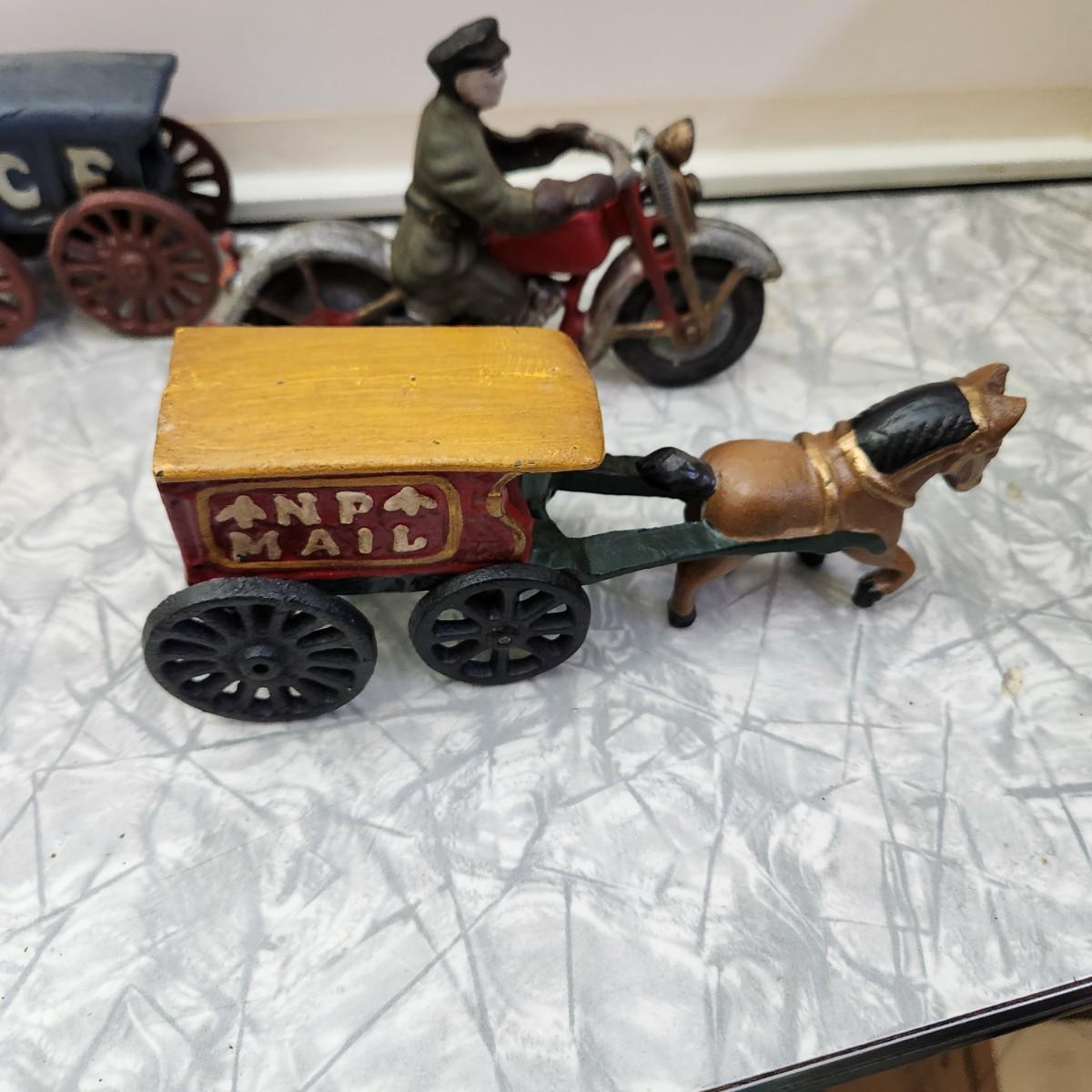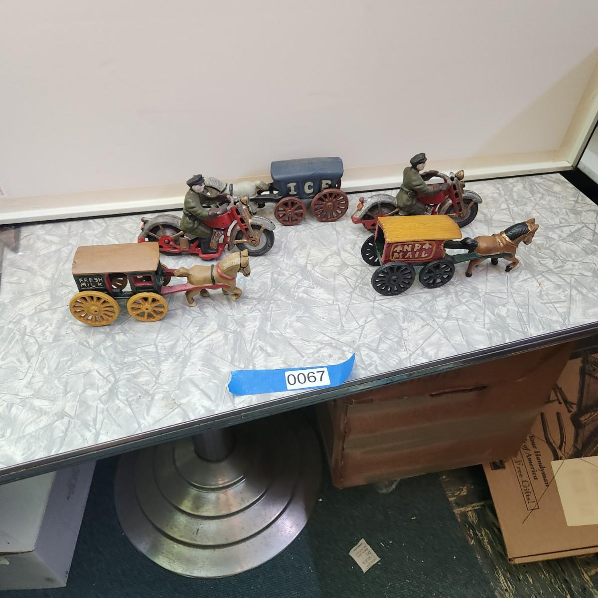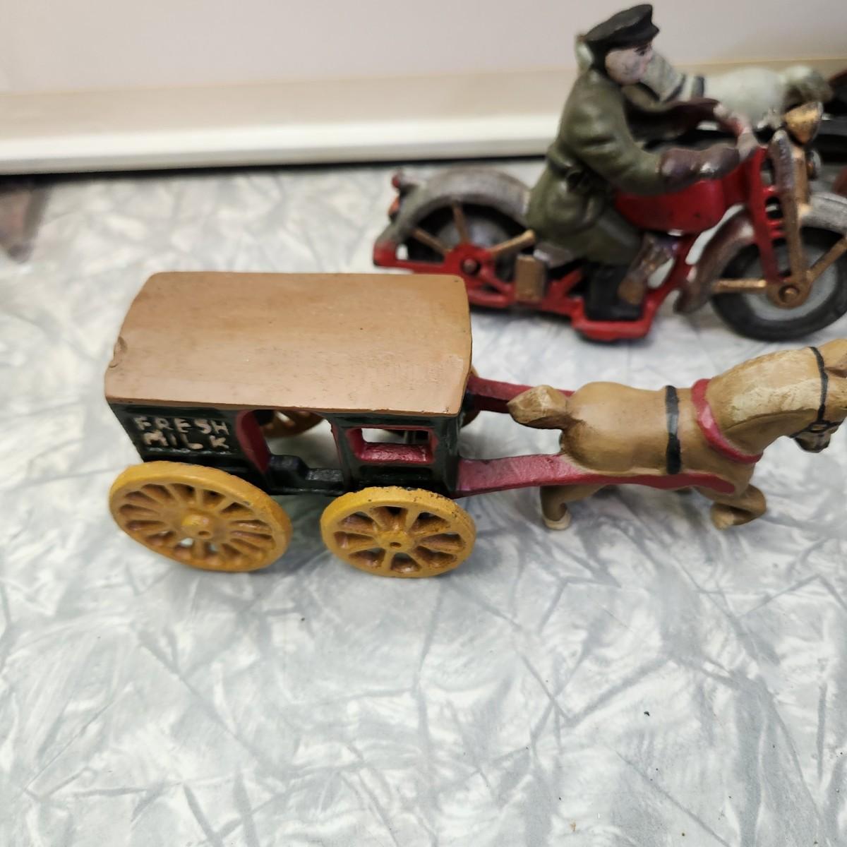 5 Cast Metal Toys Motorcycles Horse and Wagon