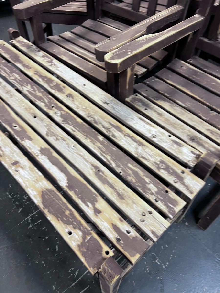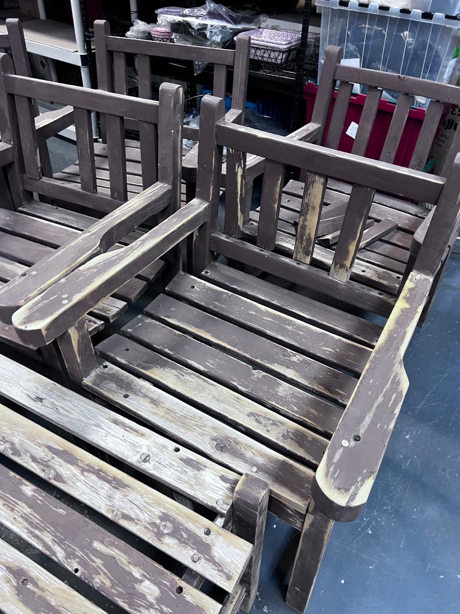 USED. Old. Cool. Fairly Sturdy. At a coat of Paint and your patio is set! They have been sanded. Some Dowels have come out but are there to be glued back in.