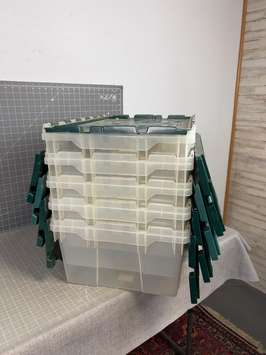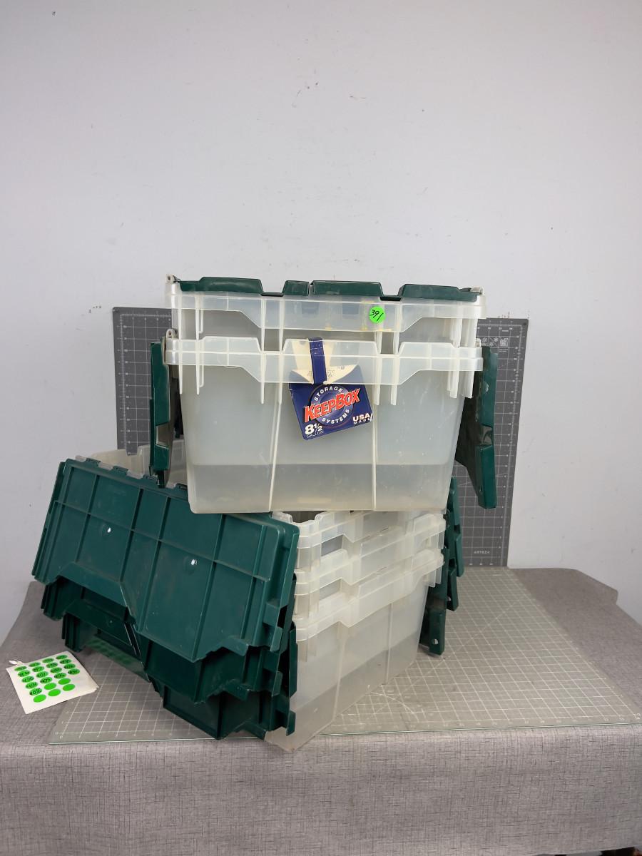 5 Clear Plastic Totes. 8-1/2 Gallon Green / Clear
