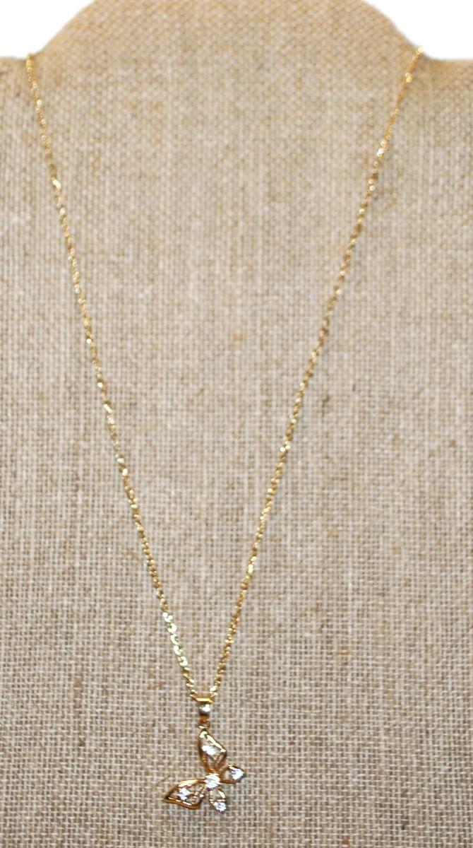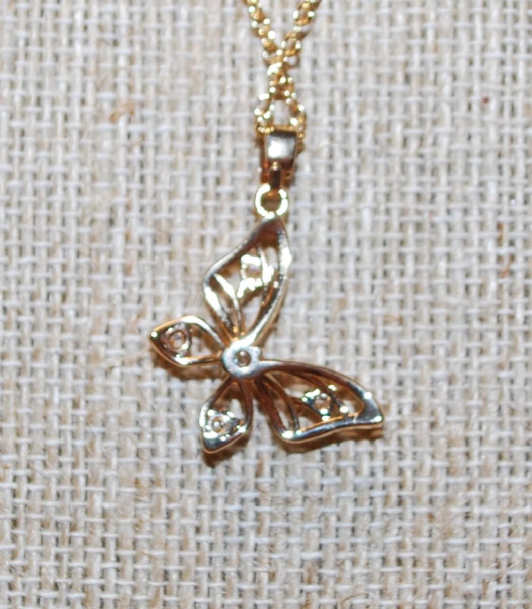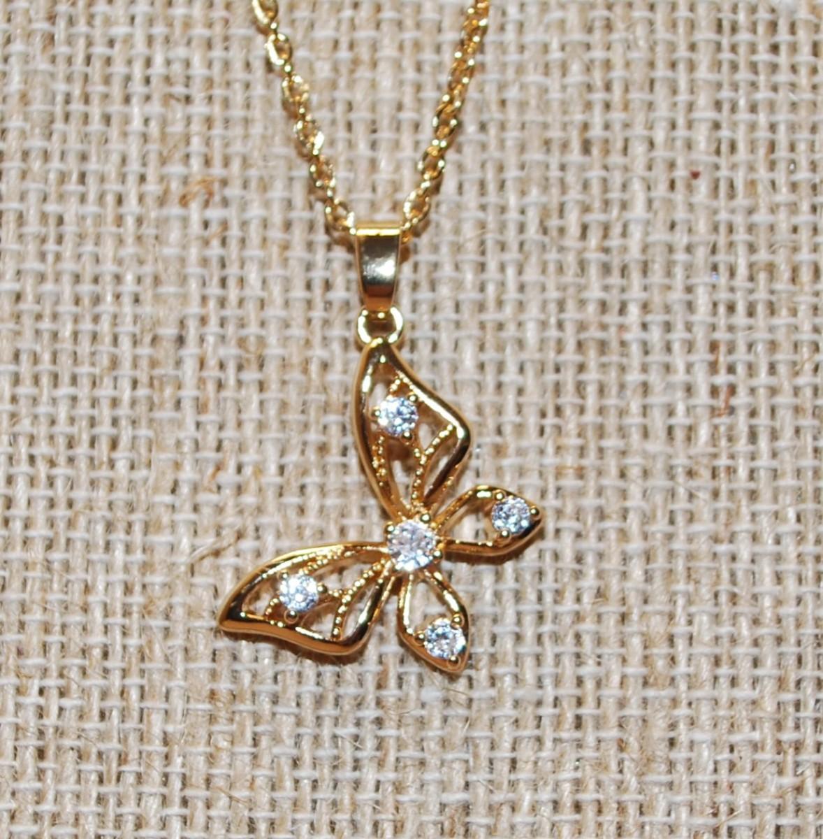 5 Clear Stones Gold Butterfly PENDANT (1" x ¾") on a Gold Tone Necklace Chain 18" L