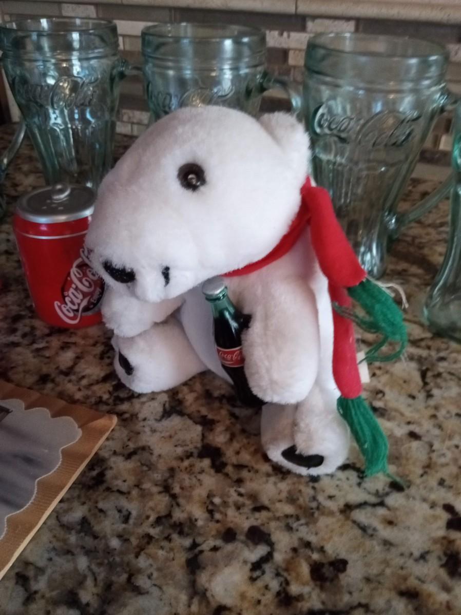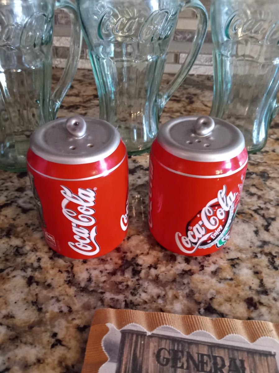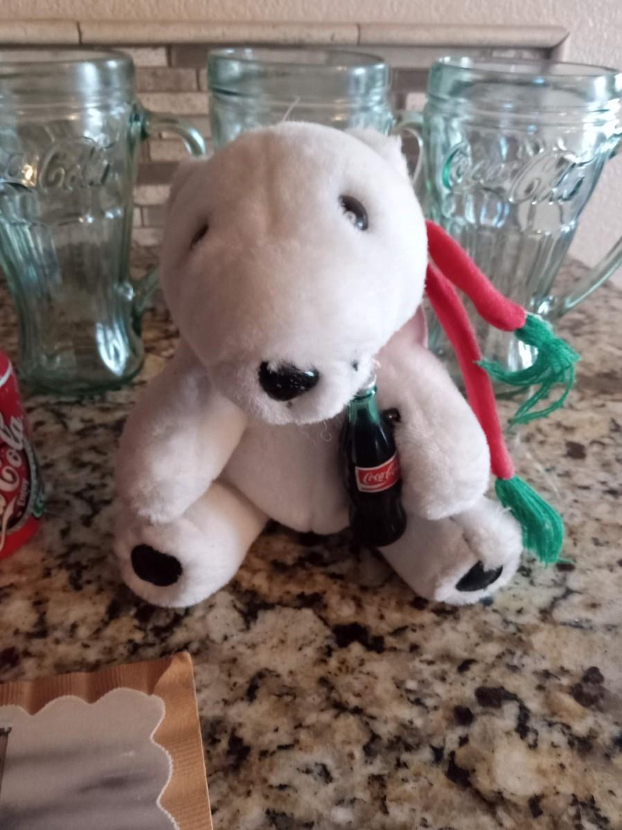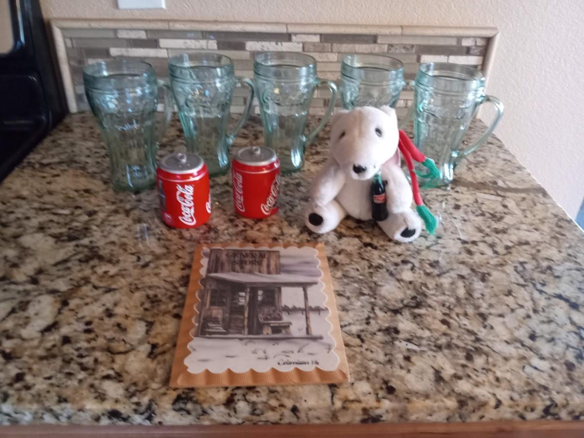 5 COCA-COLA DRINKING GLASSES, SALT/PEPPER SHAKERS, SMALL SIGN AND PLUSH BEAR