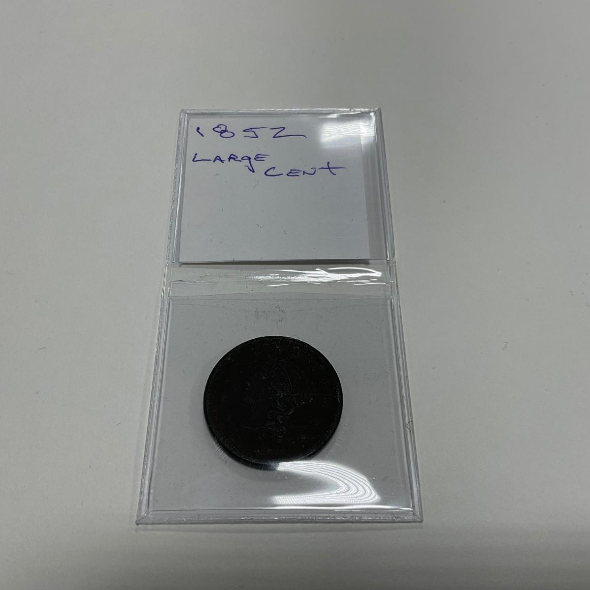 One 1852 large cent coin. Please see photos for details and condition. ::: Shipping is available on this lot. If you require shipping you must let us know at the close of the auction. We will coordinate with you after the item has been won. Shipping fees will include insurance up to or exceeding the value of all items being mailed. If you have any questions regarding this lot please contact the auctioneer either via this website, by direct email or by phone. PICK UP TIMES and other important information can be found in the TERMS and DESCRIPTION of the auction. Please take a look for pertinent information. Thanks!