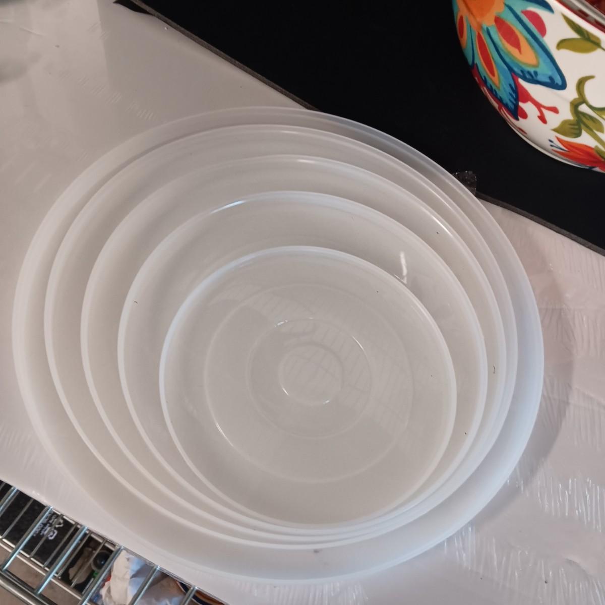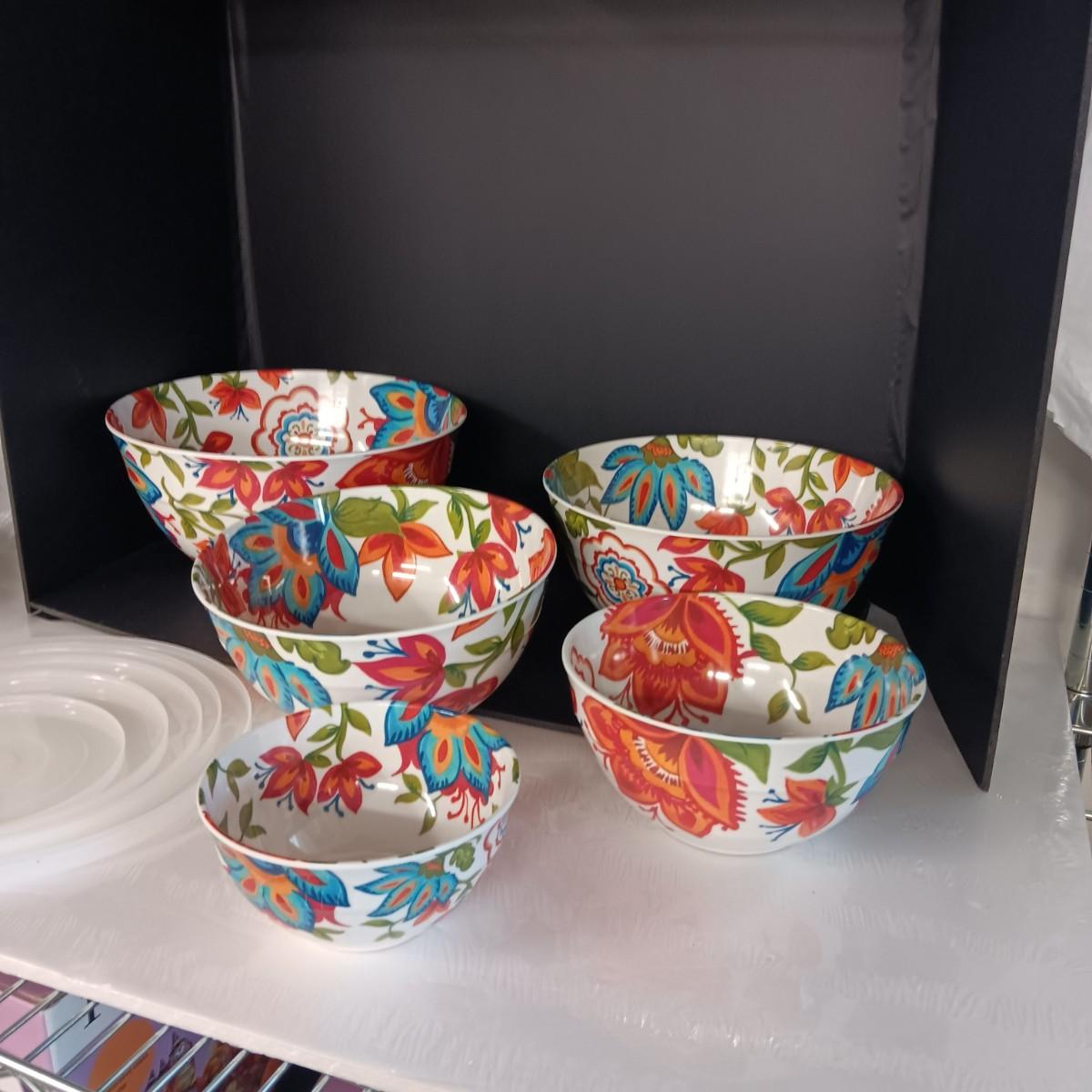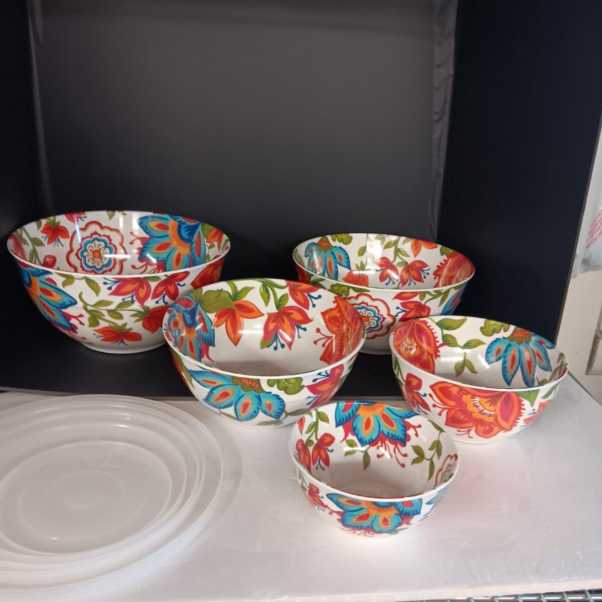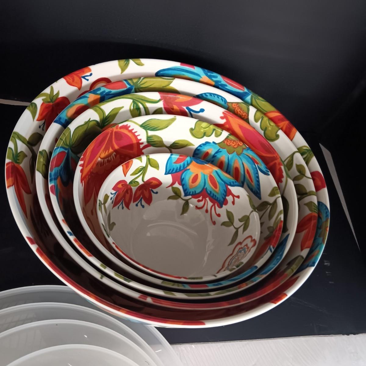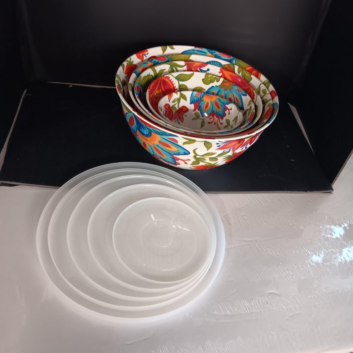 5 COLORFUL HEAVY PLASTIC NESTING BOWLS WITH RUBBER RING BOTTOMS AND LIDS