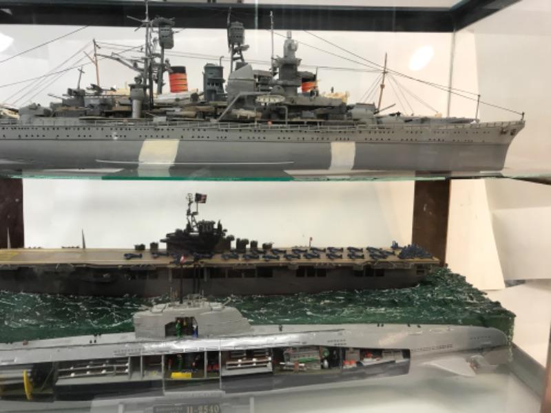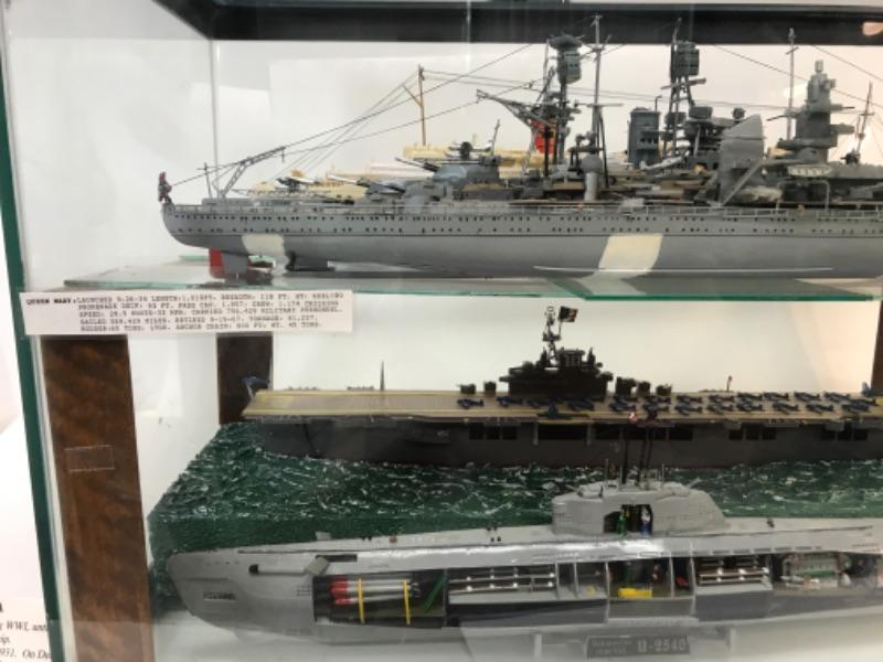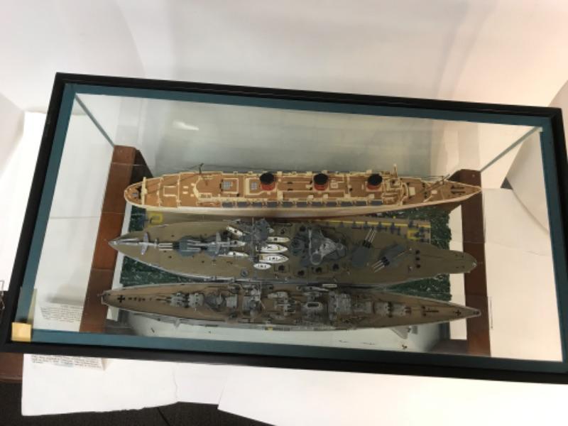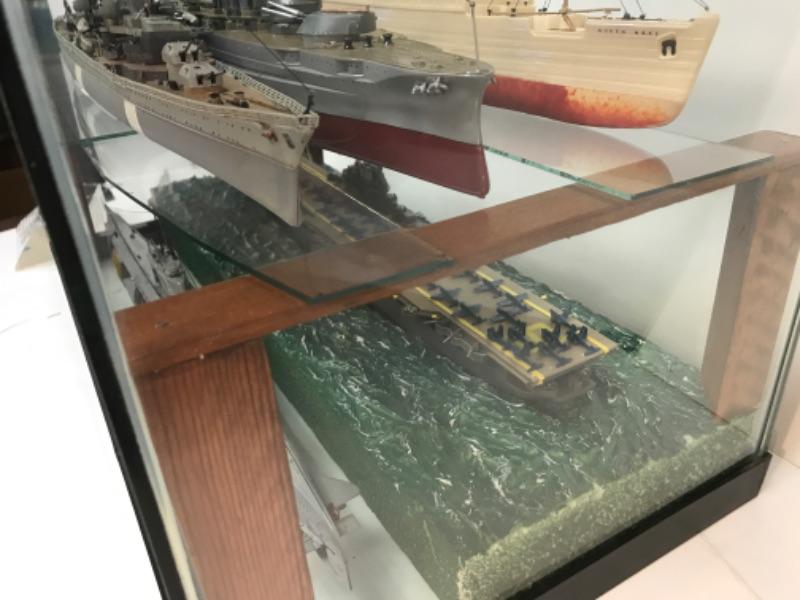 5 Completed ship models inside homemade display case