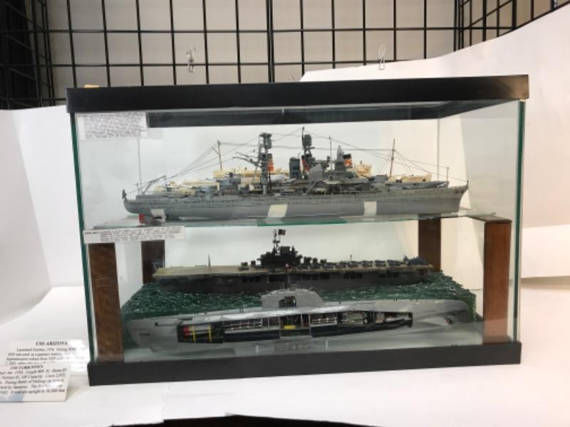 5 intricate models inside a display case customized from an aquarium. Aquarium measures 24” x 16” x 13”