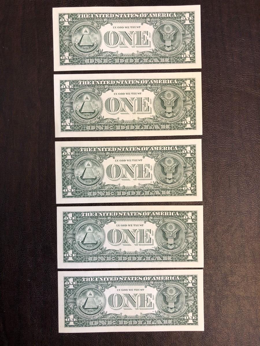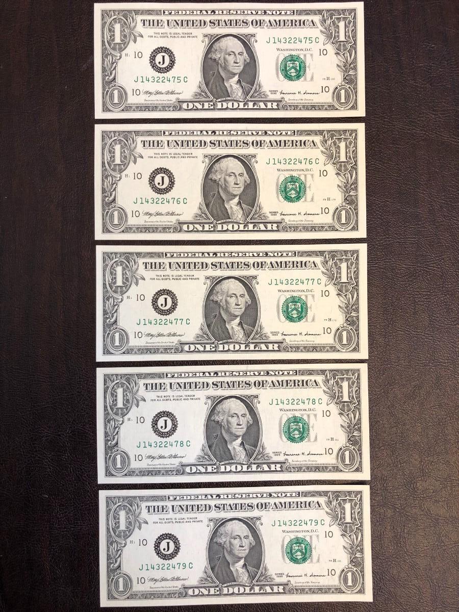 5 CONSECUTIVELY NUMBERED SERIES 1999 $1 BILLS (KANSAS CITY)