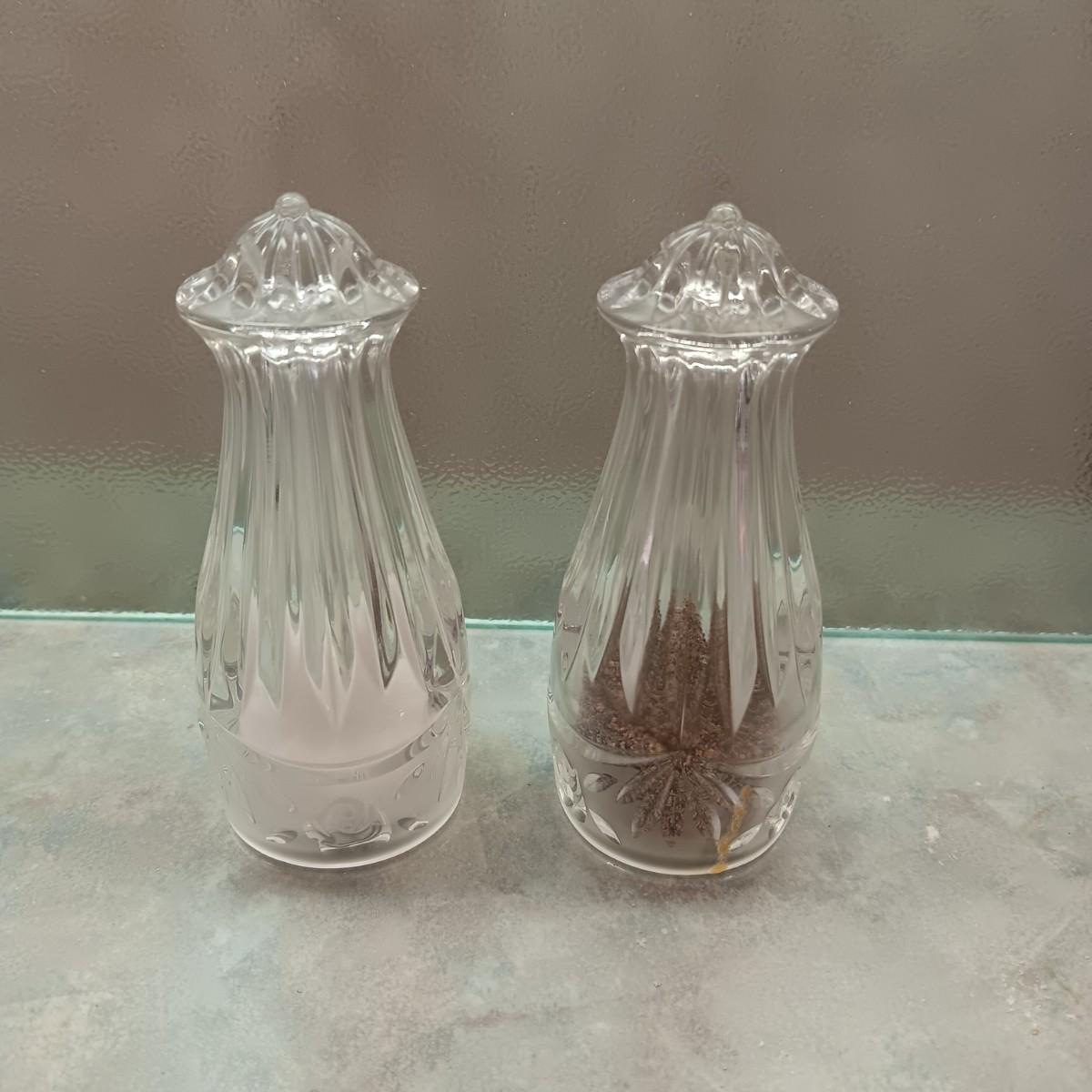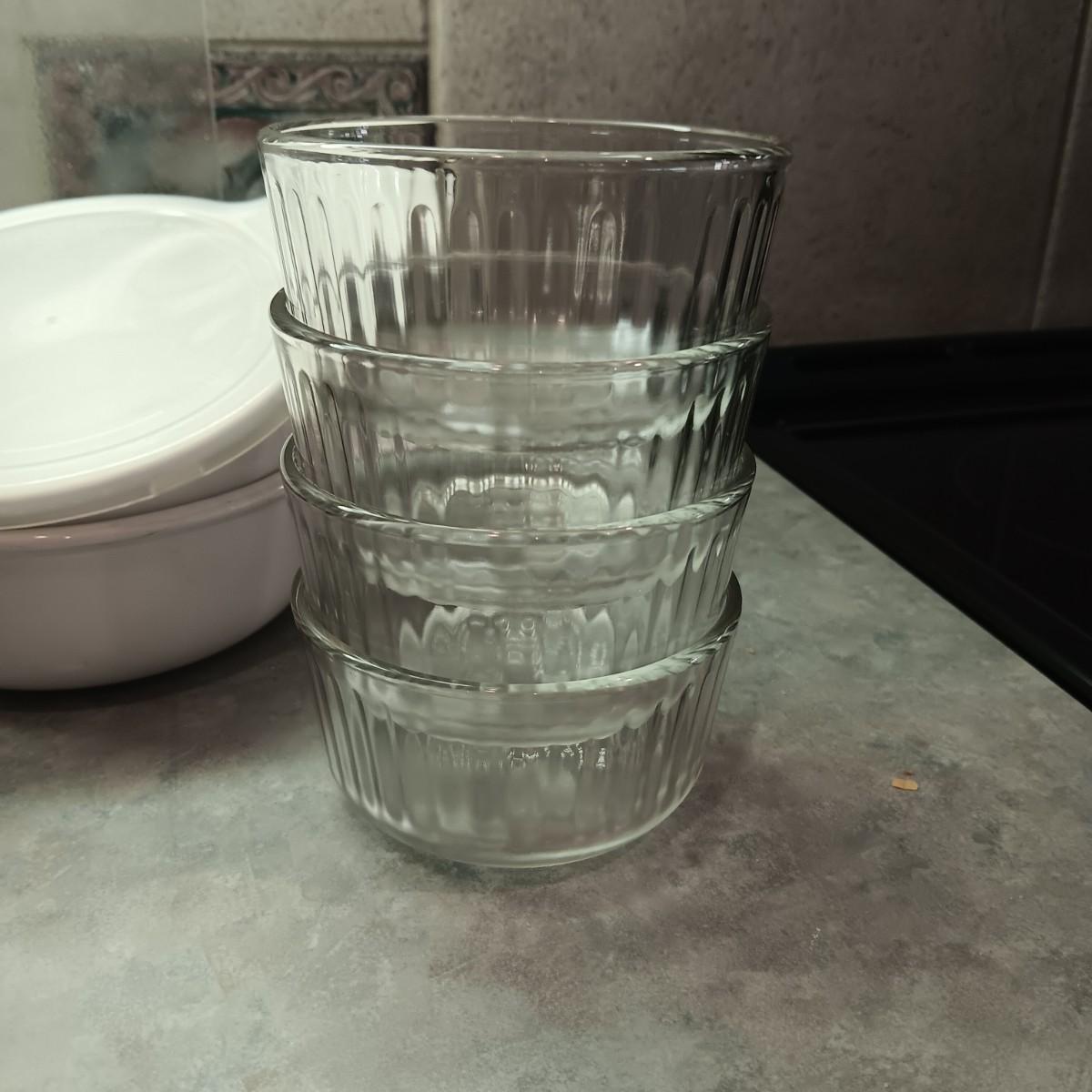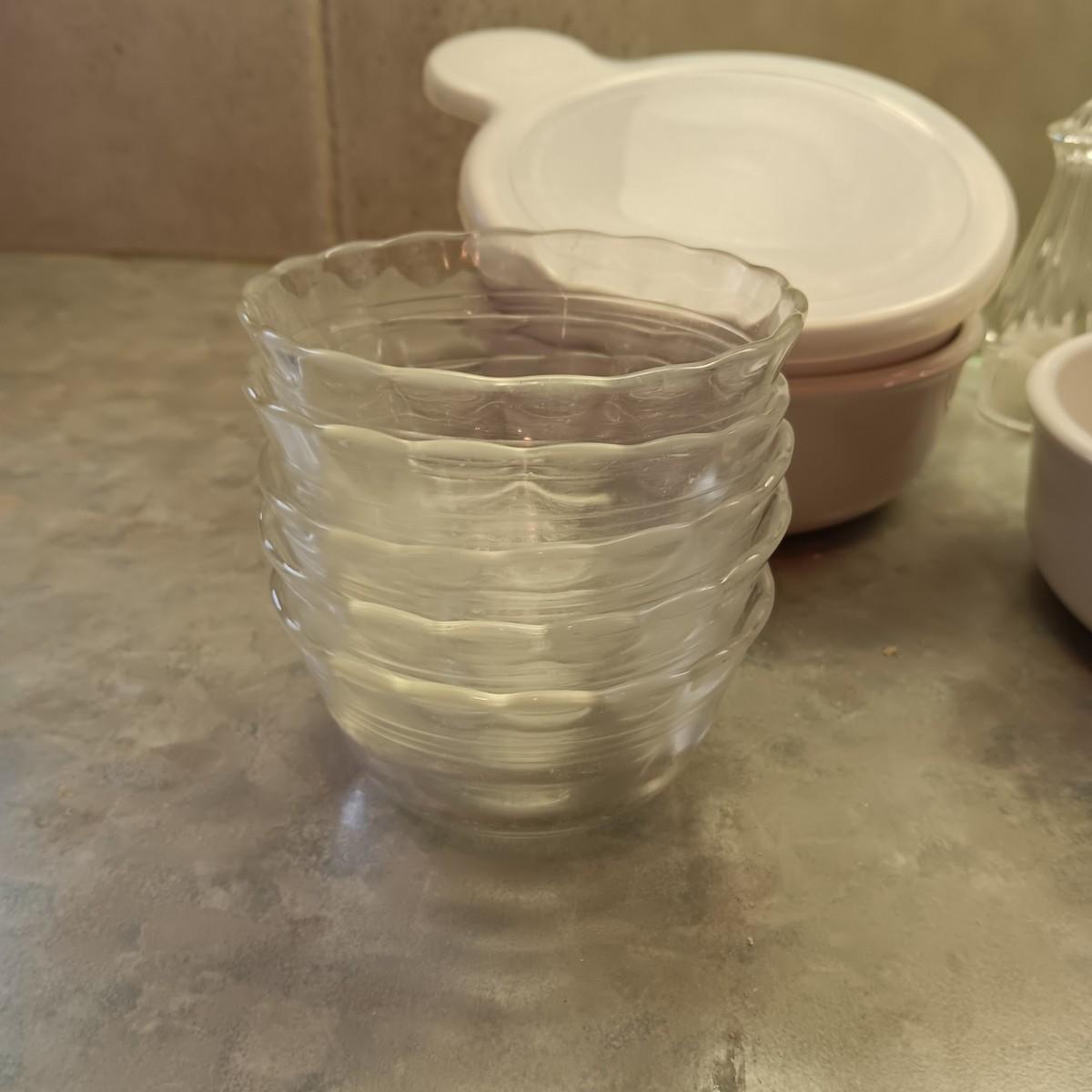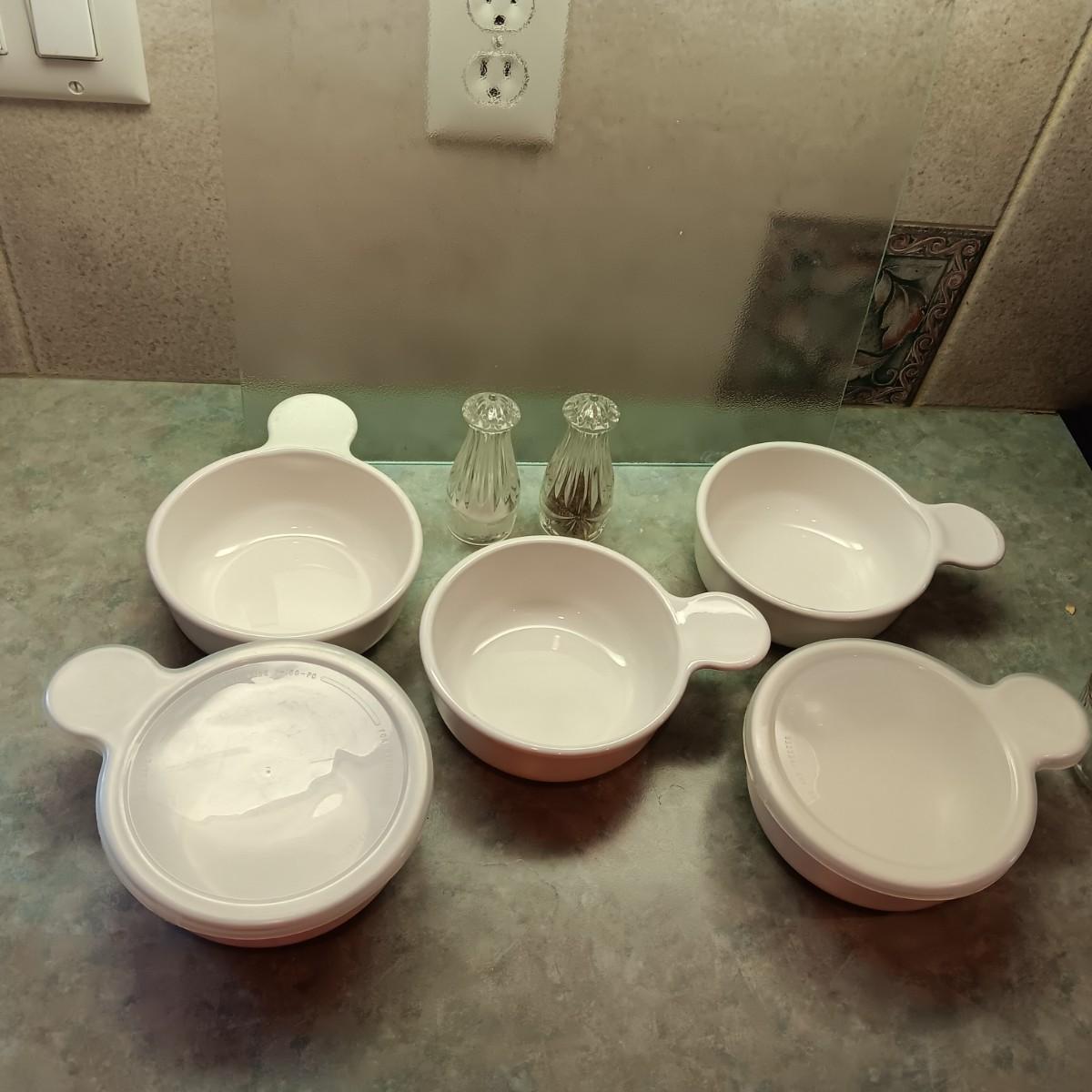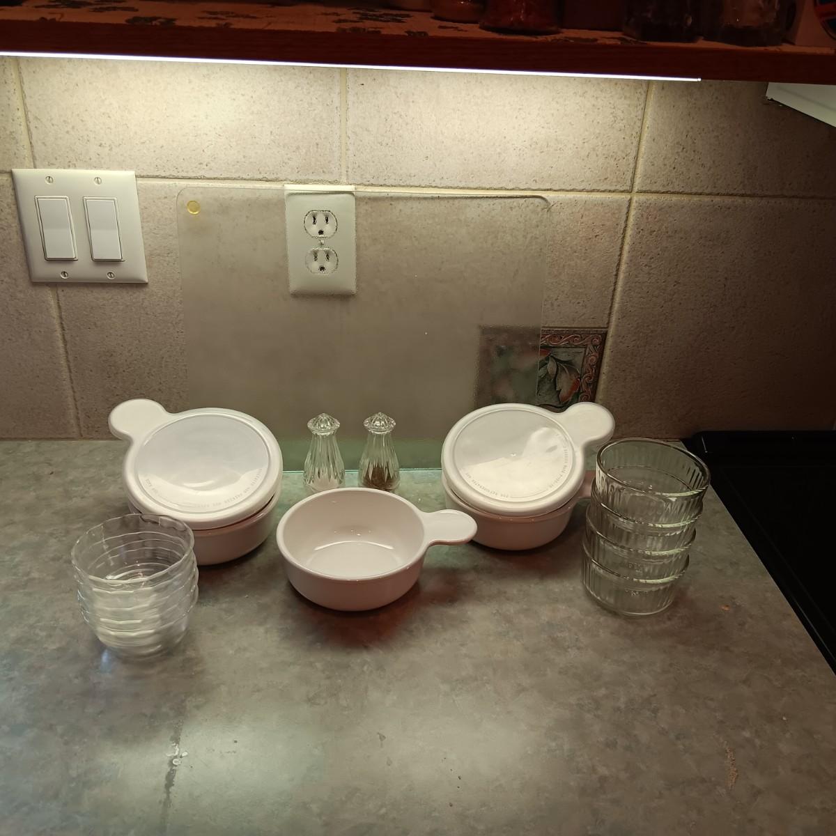 5 CORNING WARE DISHES WITH HANDLES, GLASS SHAKERS, RAMEKINS AND A GLASS CUTTING BOARD