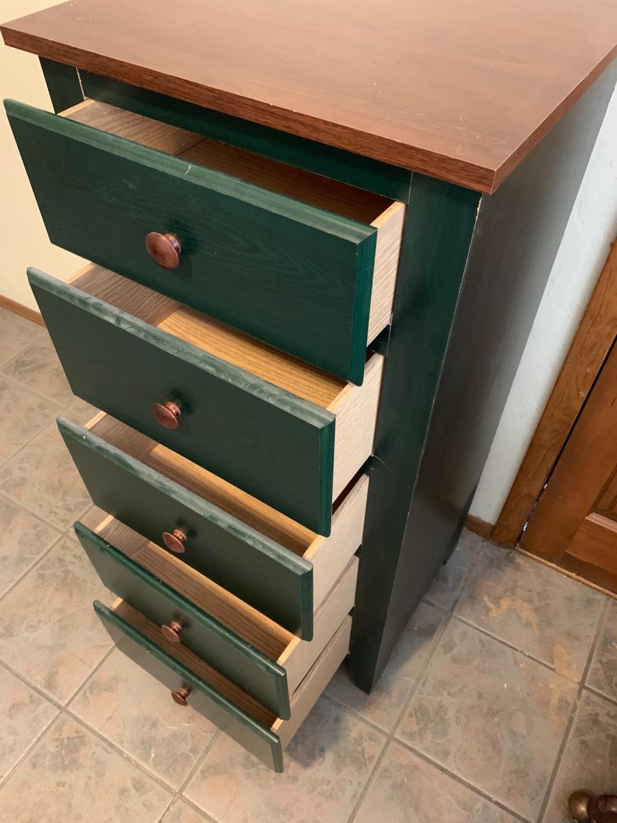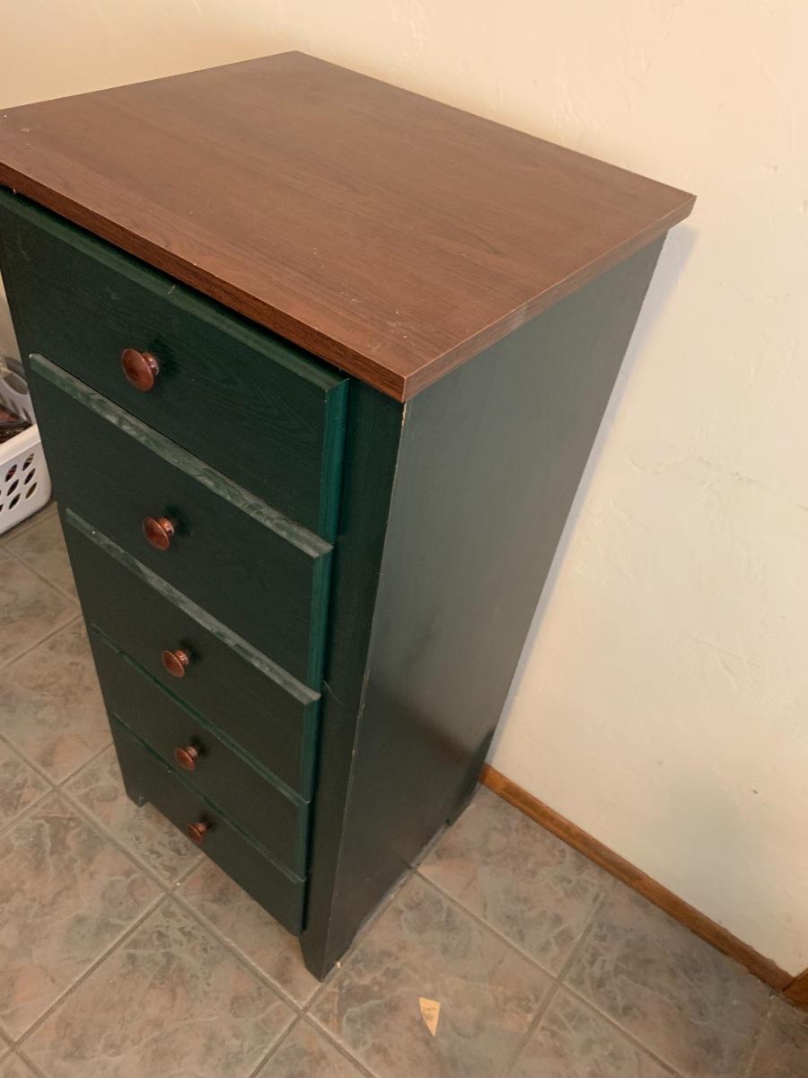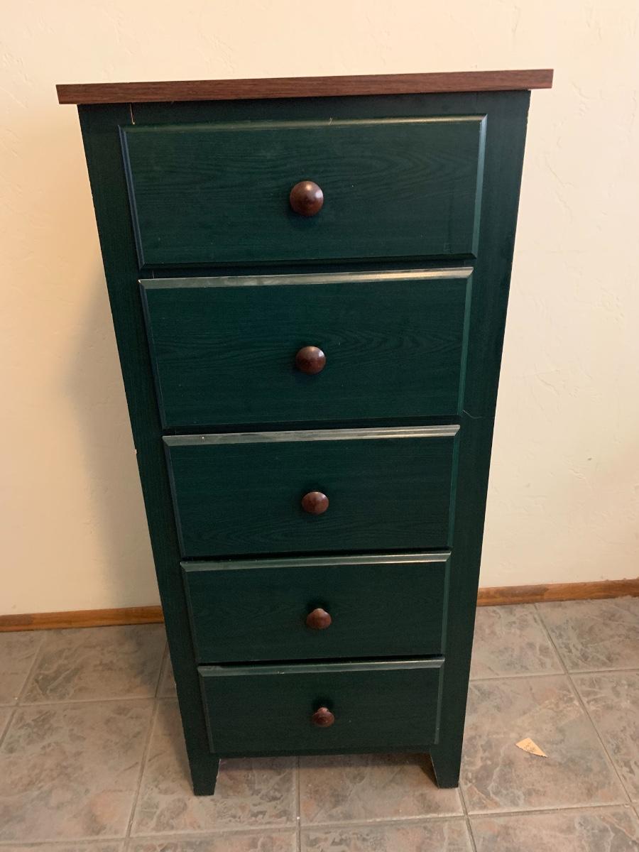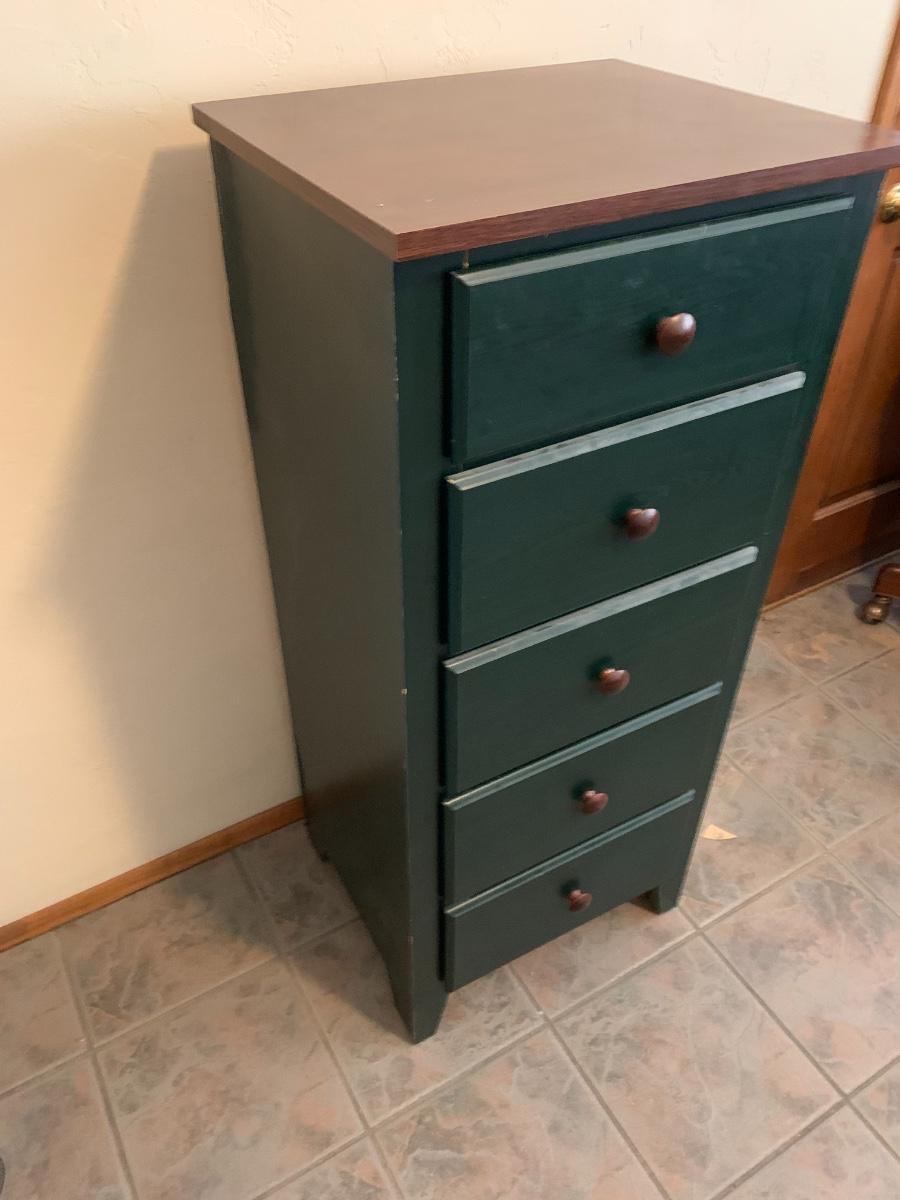 One five drawer cabinet in good condition with some normal wear. (47 inches in height, 21 inches in length, 18 inches in depth)