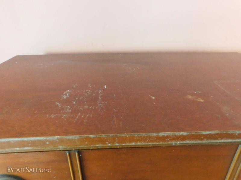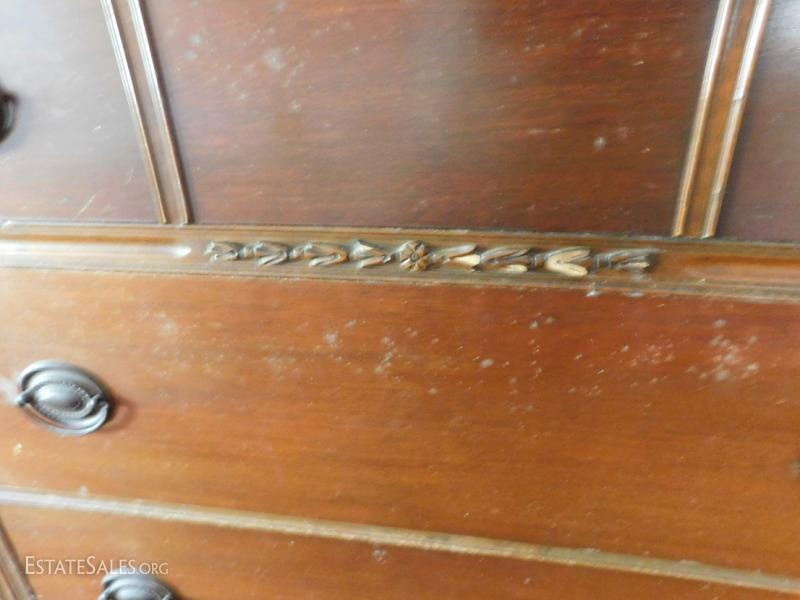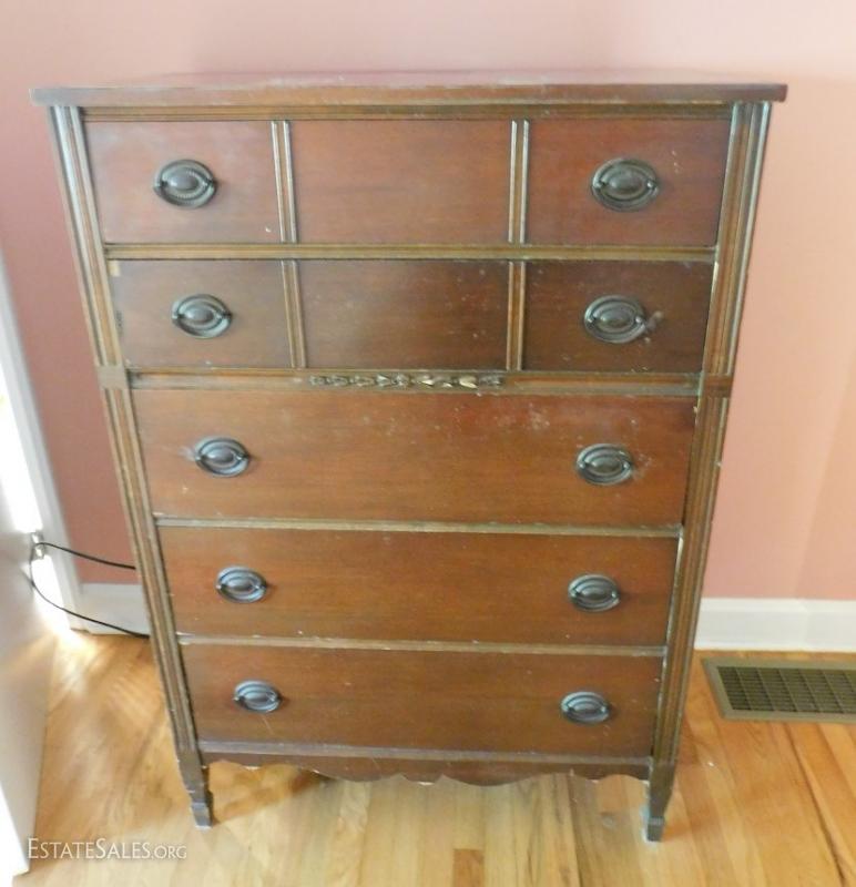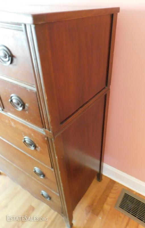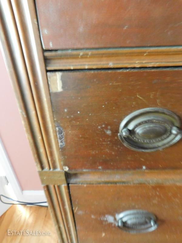 5 Drawer Dresser has scratches and wear. One drawer has very small piece of veneer missing.