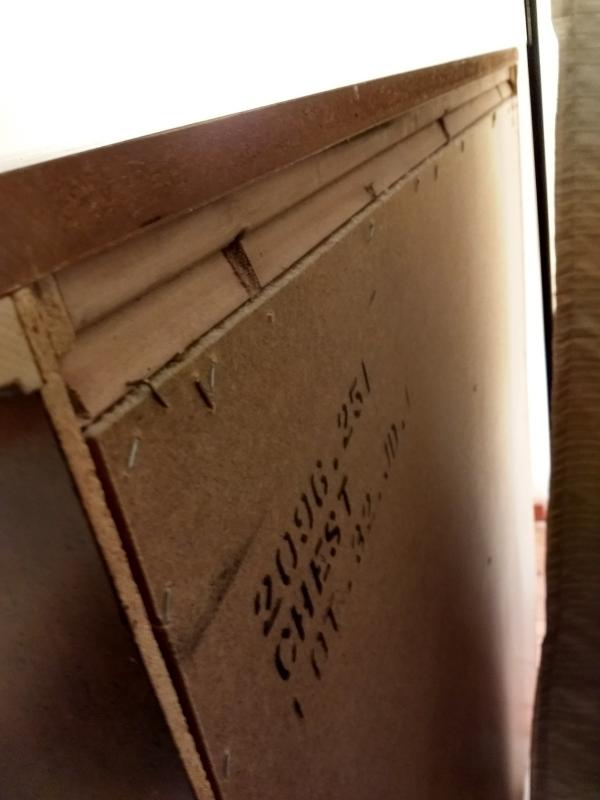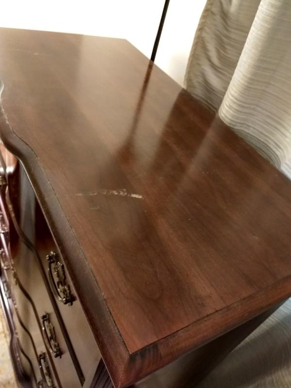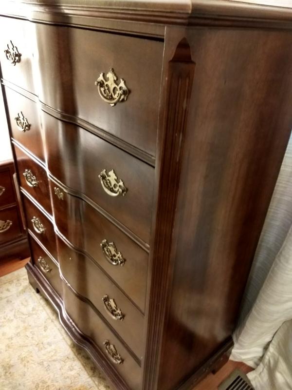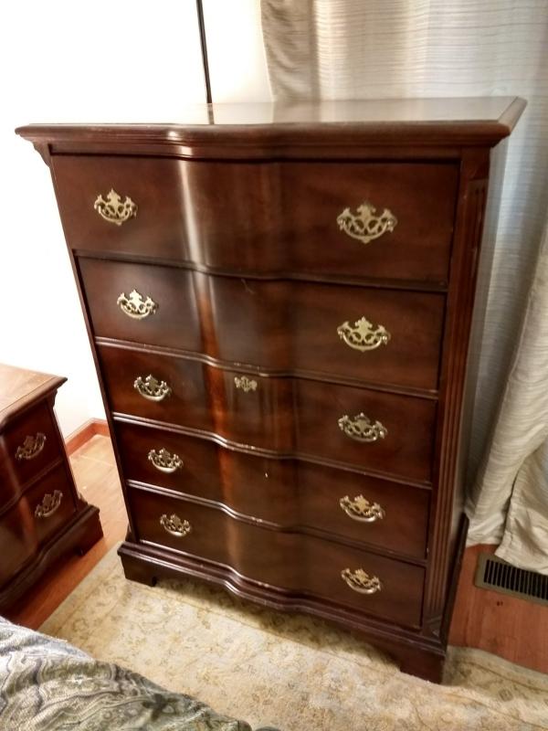 5 Drawer Mahogany Dresser Chest has some markings and scratches to surface.