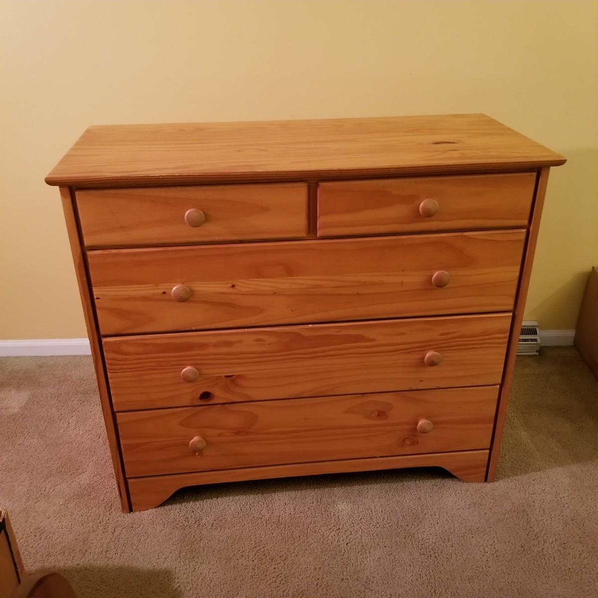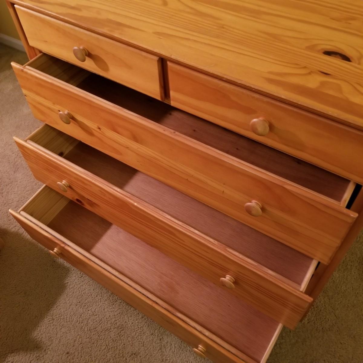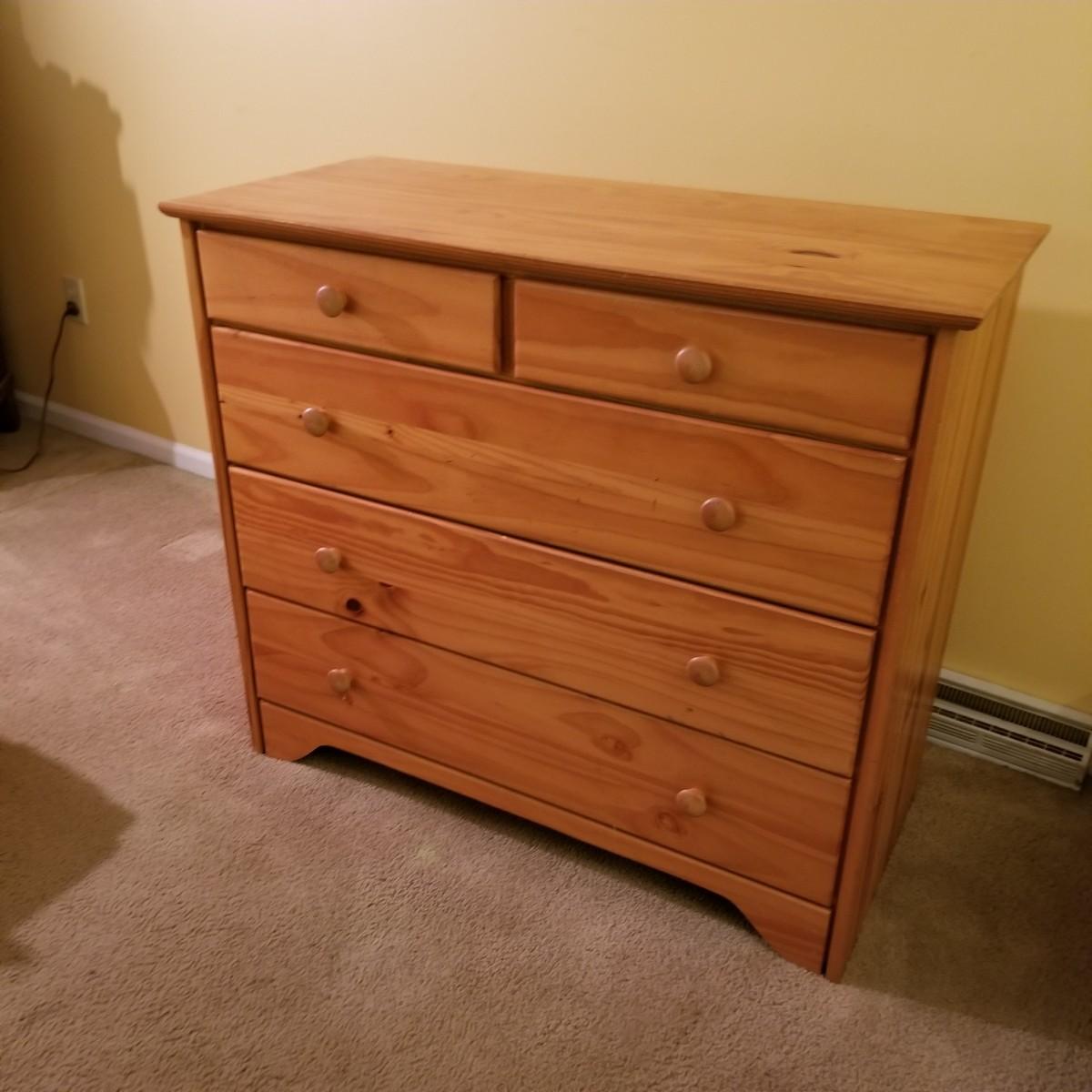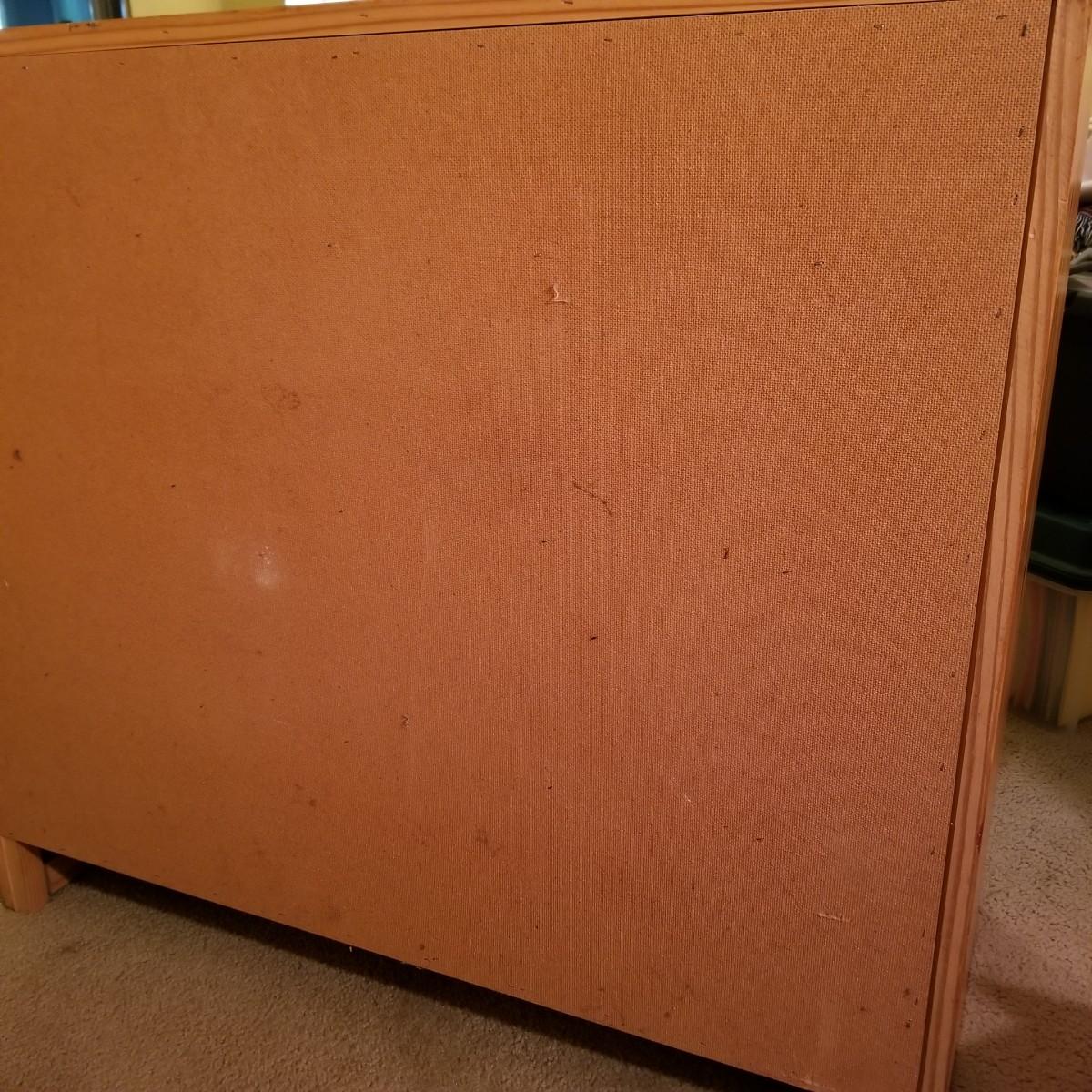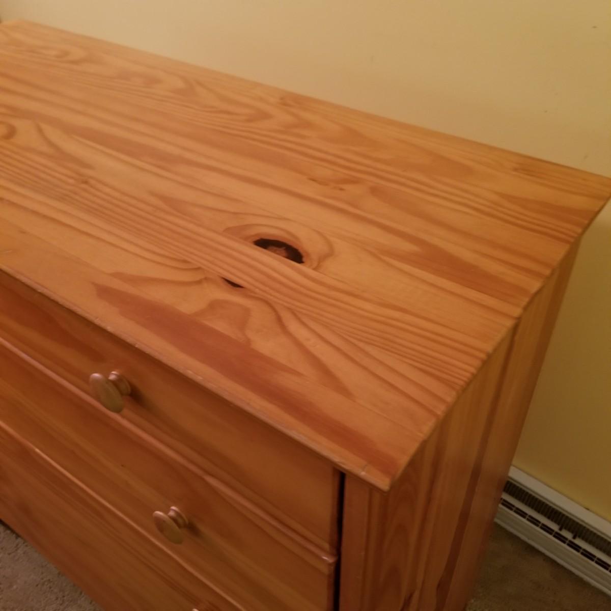 A five drawer pine dresser, done in a honey blonde finish. Wooden knobs and beveled edge top, this piece is 39"x17.5"x33.5". Masonite back, some slight discoloration on one end, see photos for details. Local pickup only.