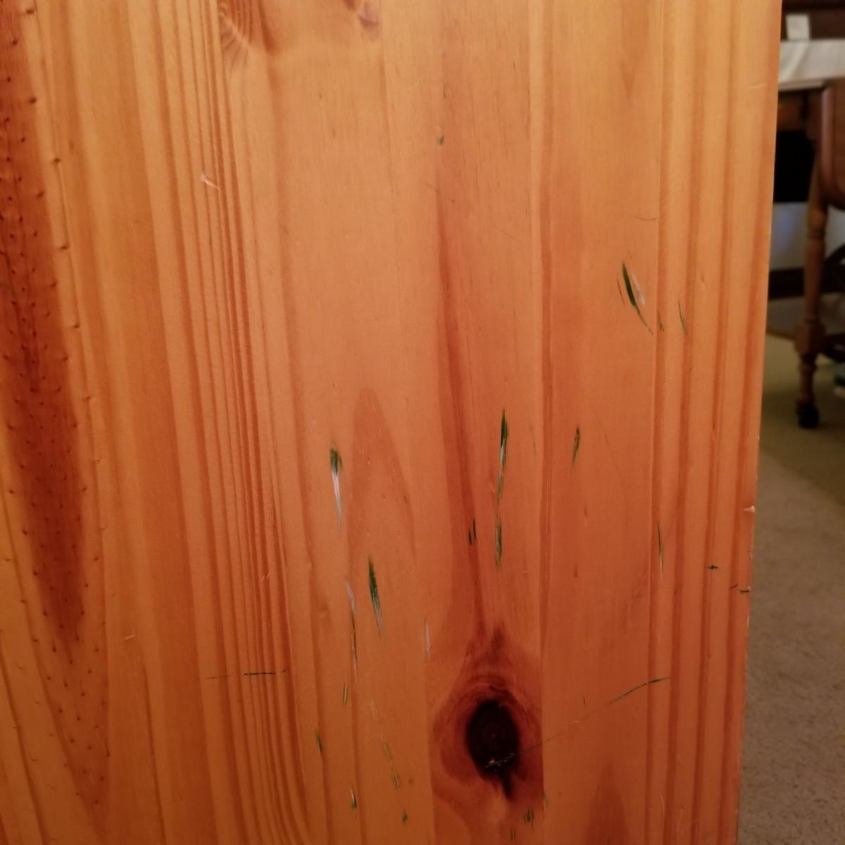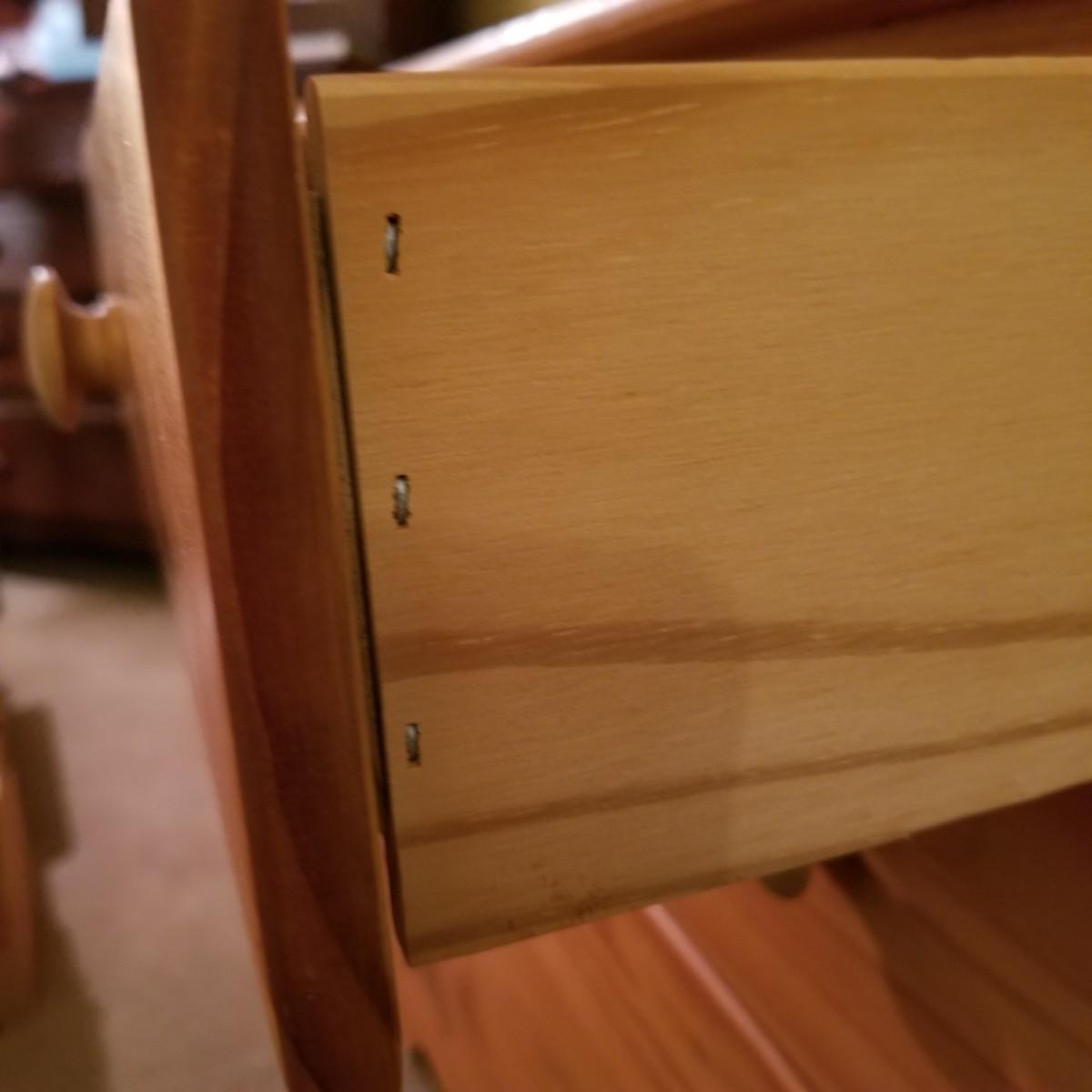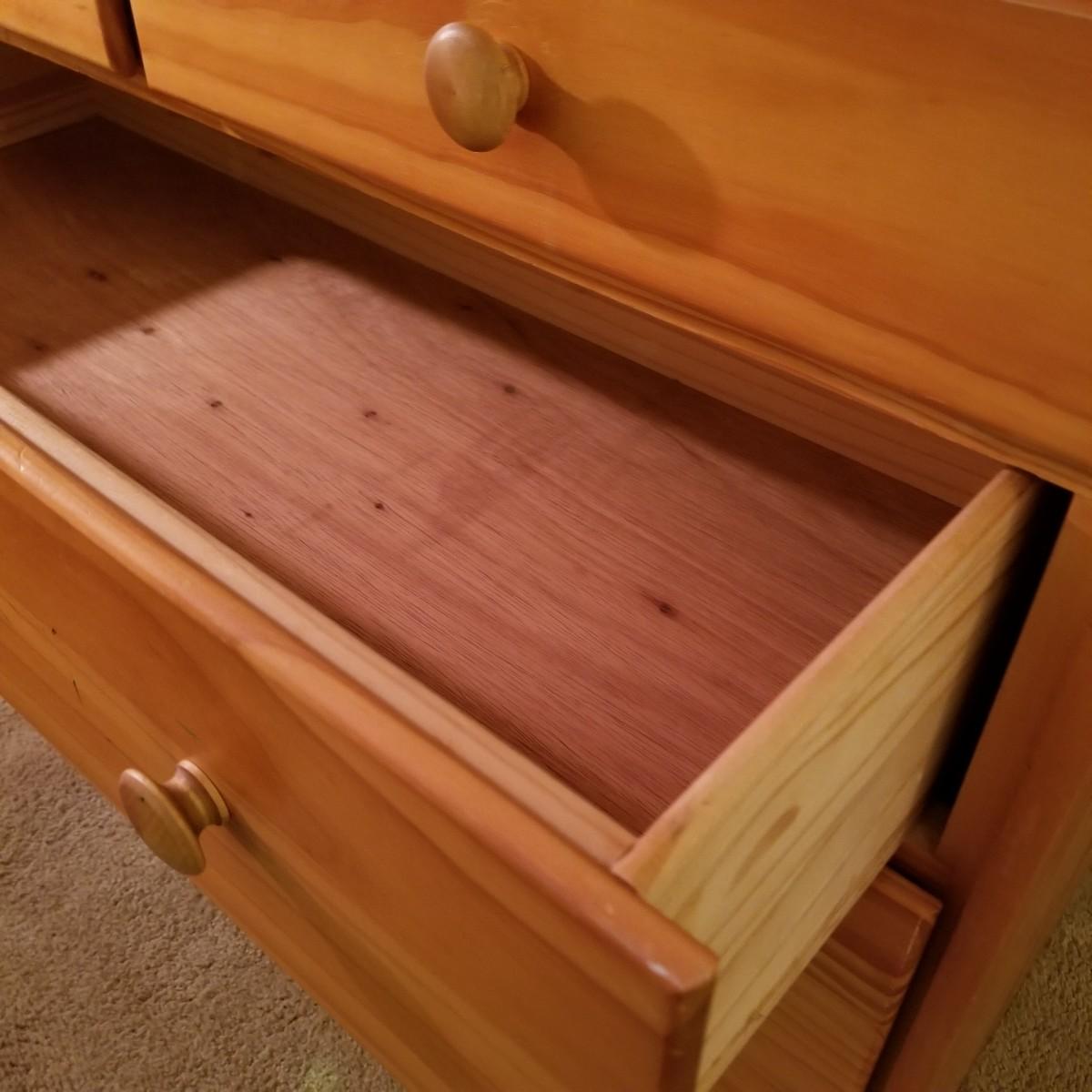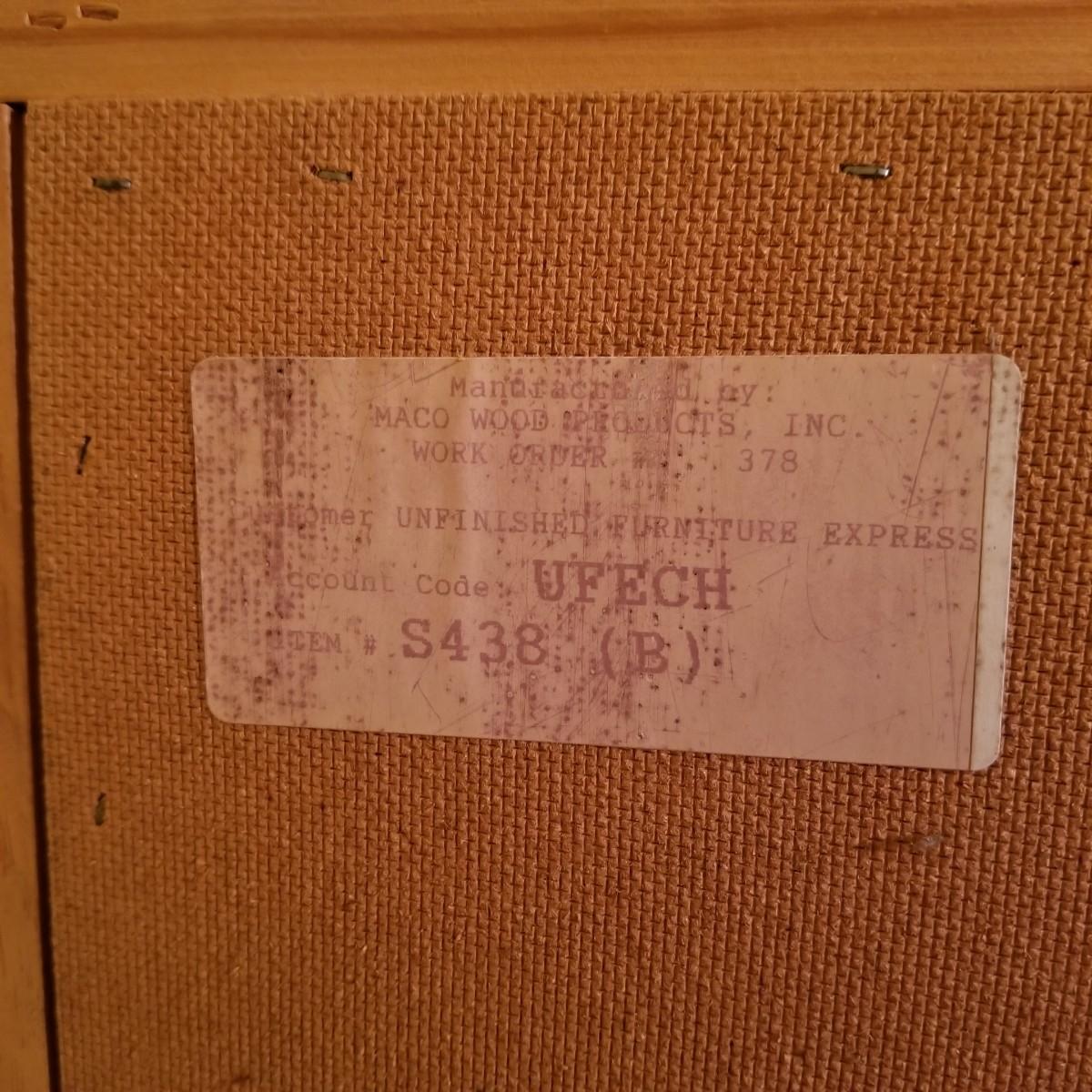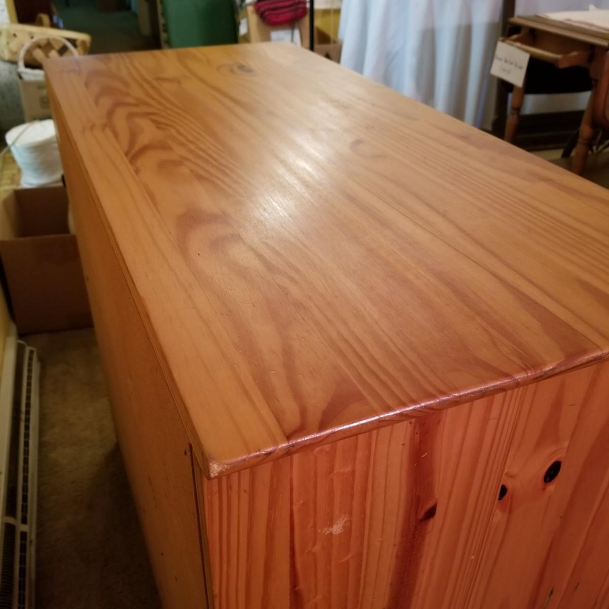 A five drawer pine dresser, done in a honey blonde finish. Wooden knobs and beveled edge top, this piece is 39"x17.5"x33.5". Masonite back, some slight discoloration on one end, see photos for details. Local pickup only.