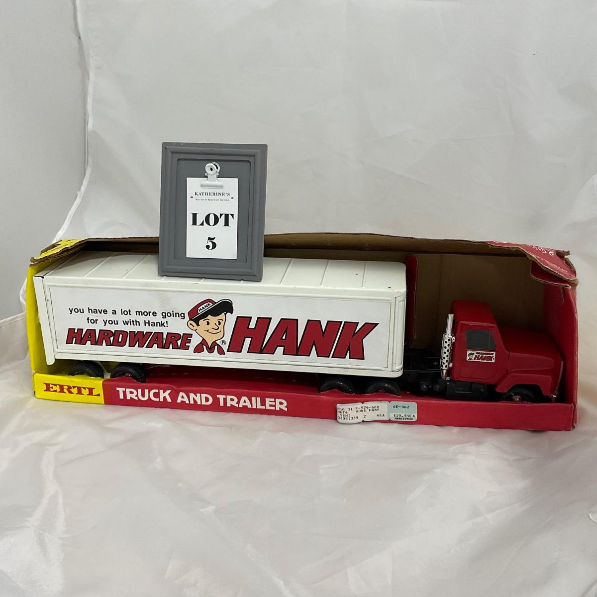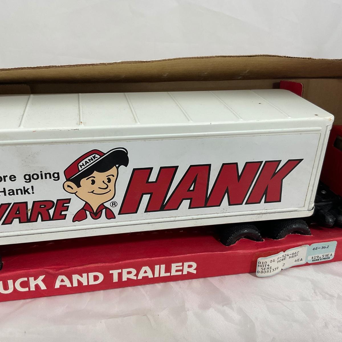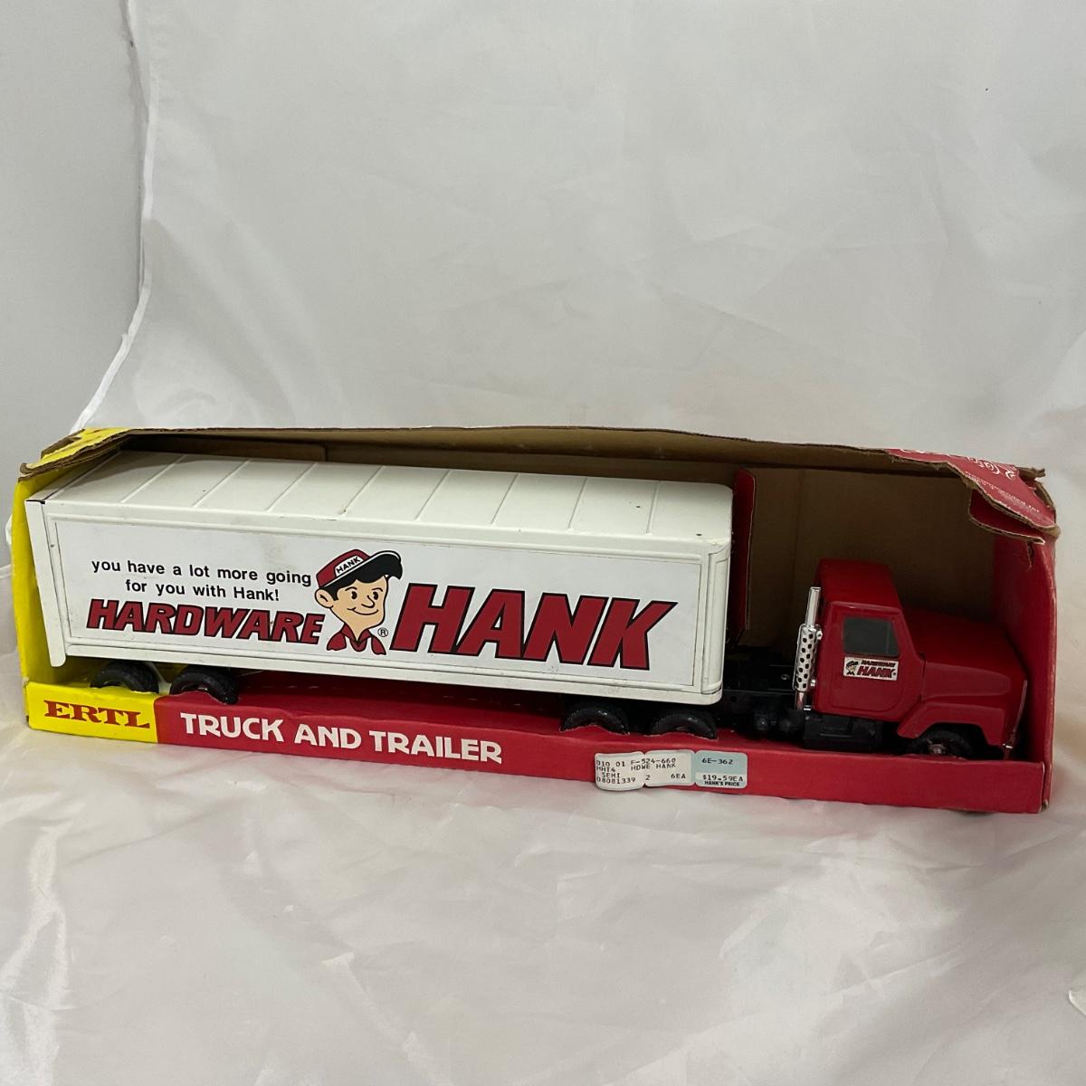 Ertl Hardware Hank semi truck in box. 21 inches by 5 inches. Please see photos for details and condition. ::: Shipping is available on this lot. If you require shipping you must let us know at the close of the auction. We will coordinate with you after the item has been won. Shipping fees will include insurance up to or exceeding the value of all items being mailed. If you have any questions regarding this lot please contact the auctioneer either via this website, by direct email or by phone. PICK UP TIMES and other important information can be found in the TERMS and DESCRIPTION of the auction. Please take a look for pertinent information. Thanks!