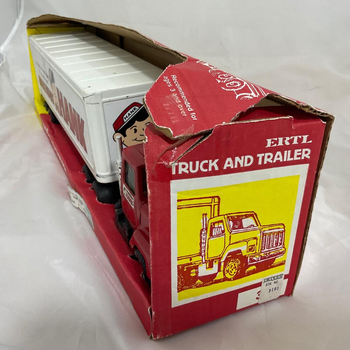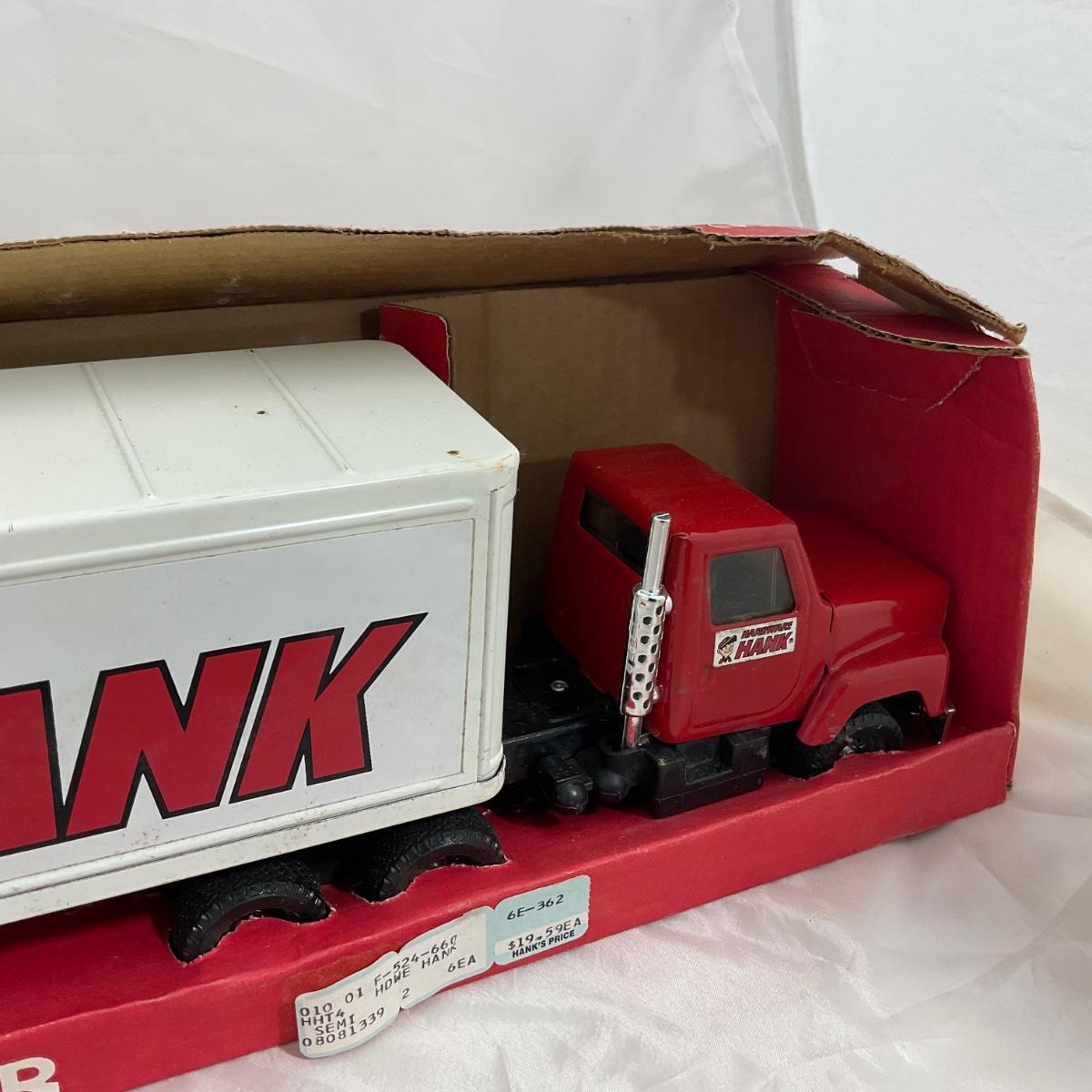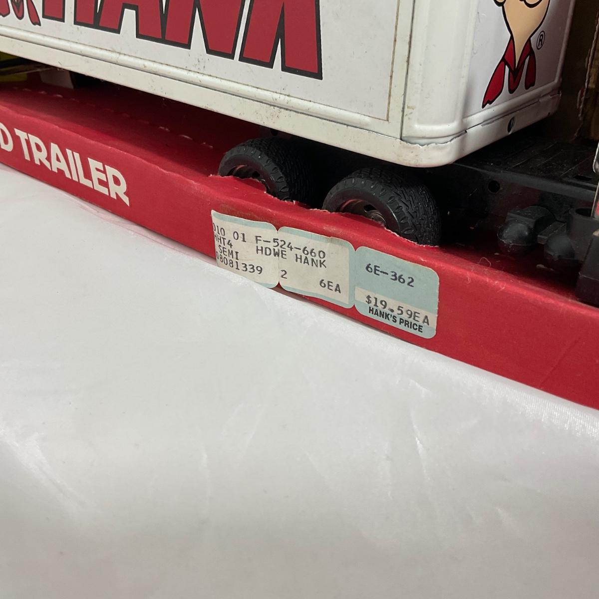 Ertl Hardware Hank semi truck in box. 21 inches by 5 inches. Please see photos for details and condition. ::: Shipping is available on this lot. If you require shipping you must let us know at the close of the auction. We will coordinate with you after the item has been won. Shipping fees will include insurance up to or exceeding the value of all items being mailed. If you have any questions regarding this lot please contact the auctioneer either via this website, by direct email or by phone. PICK UP TIMES and other important information can be found in the TERMS and DESCRIPTION of the auction. Please take a look for pertinent information. Thanks!