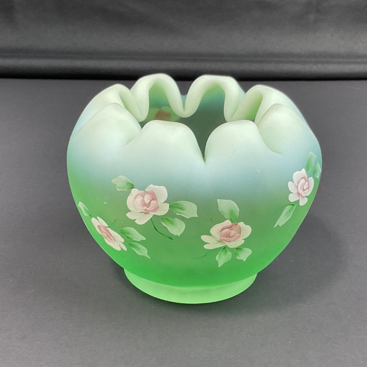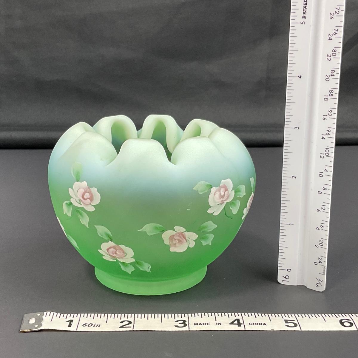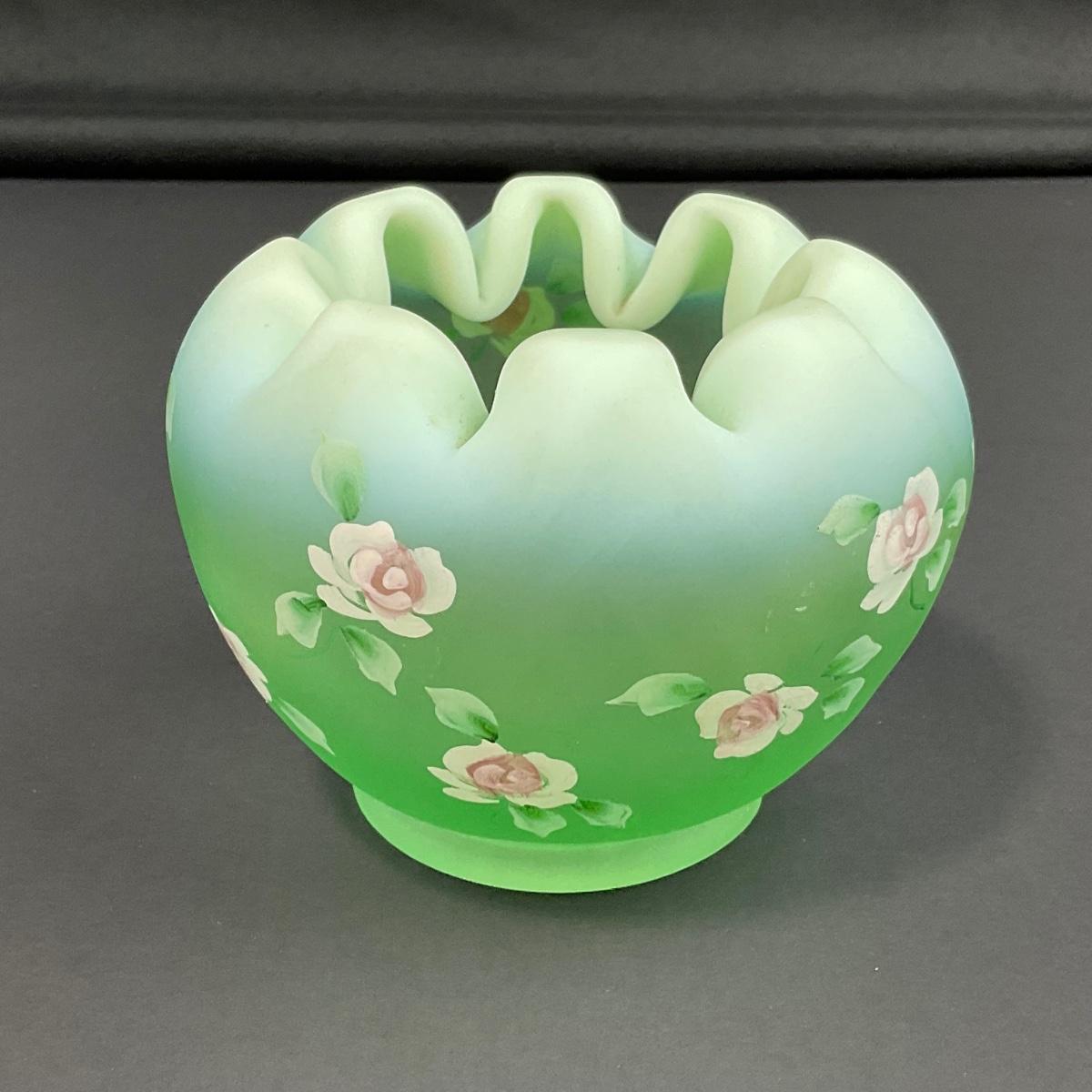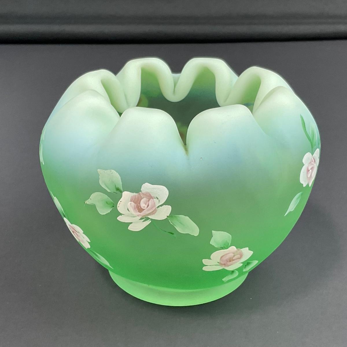 -5- FENTON | Hand Painted Diamond Optic Opalescent Statin Rose Bowl | Signed By Nancy Fenton