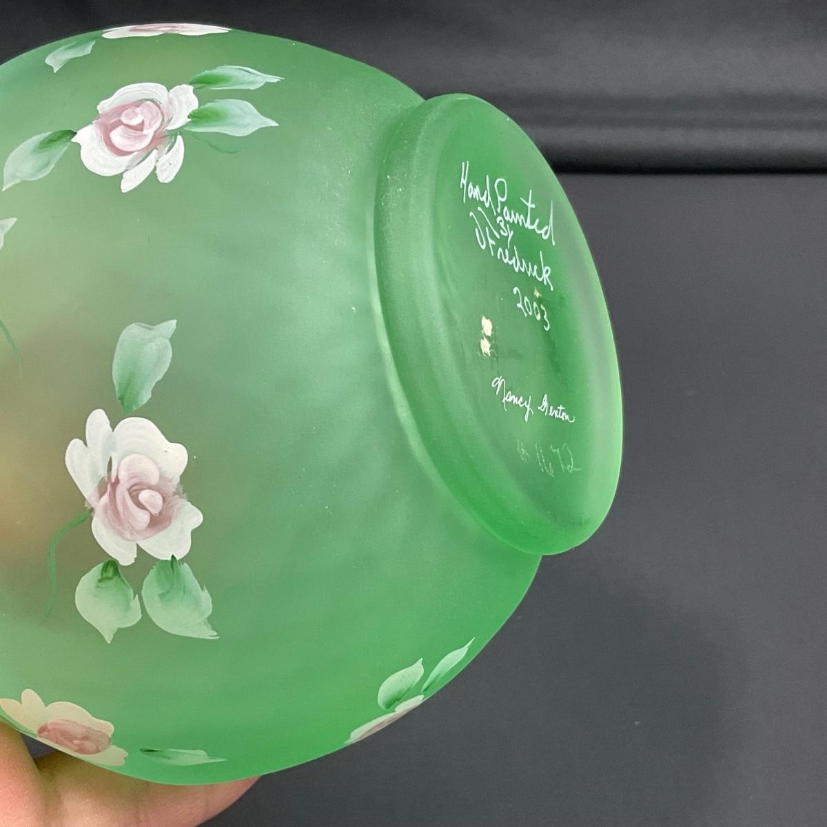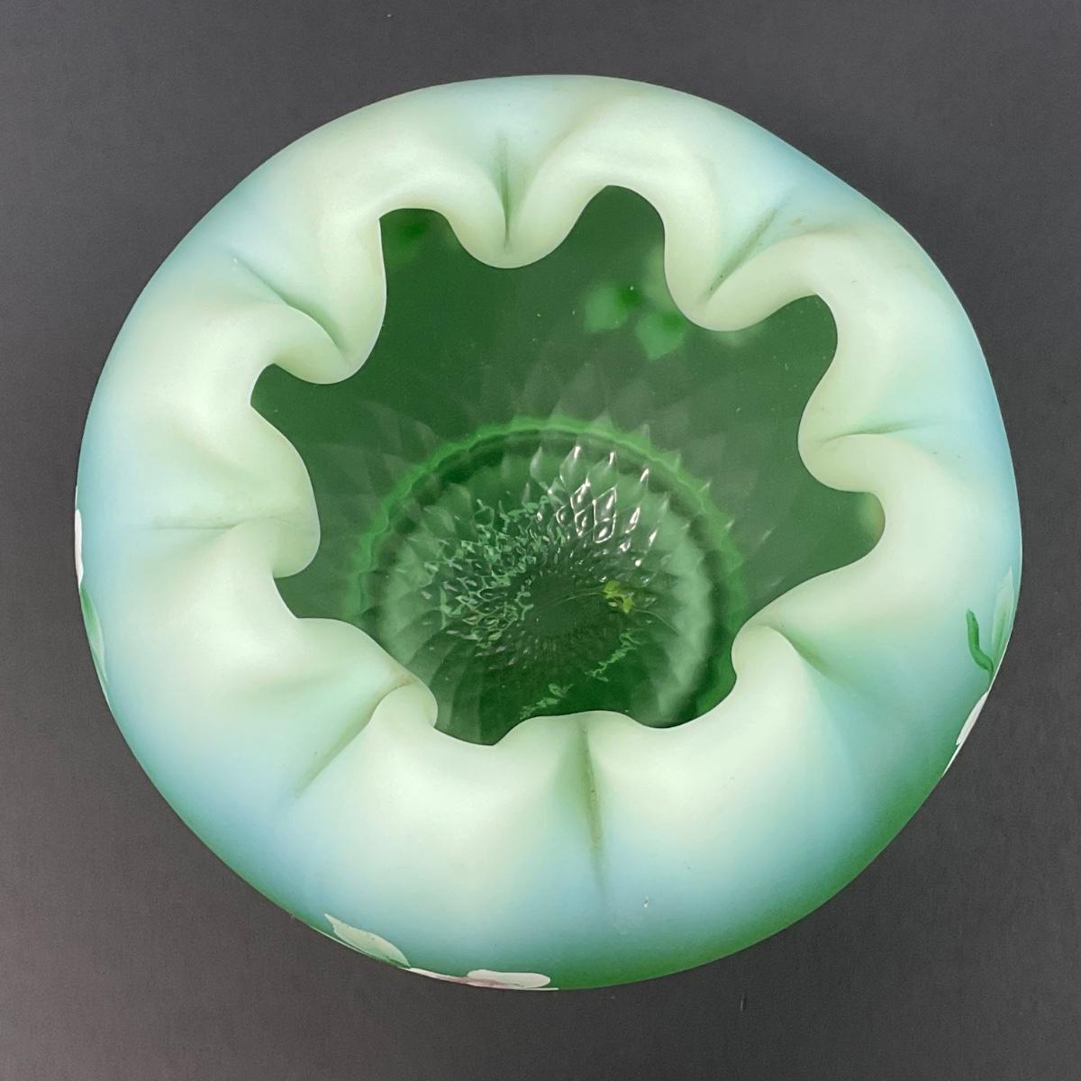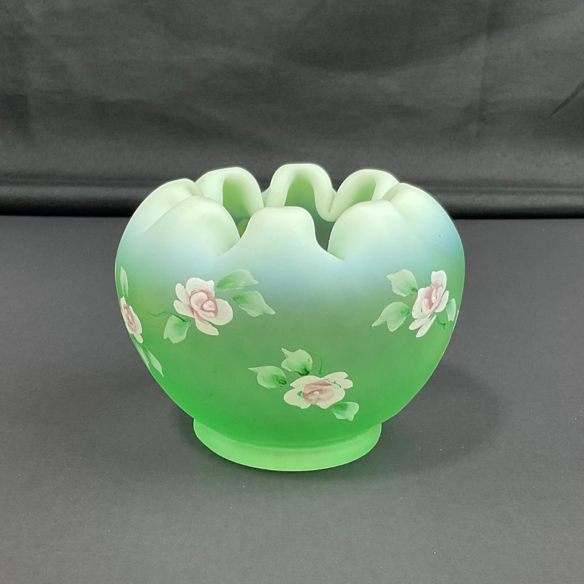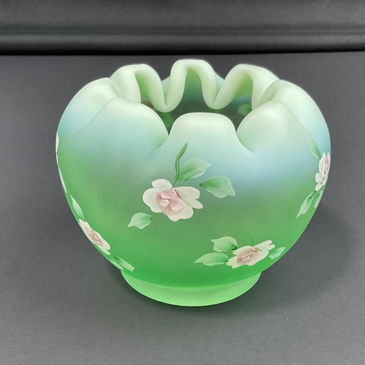 -5- FENTON | Hand Painted Diamond Optic Opalescent Statin Rose Bowl | Signed By Nancy Fenton