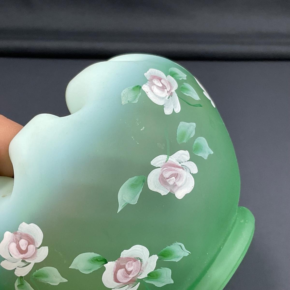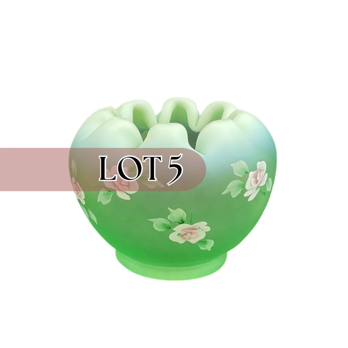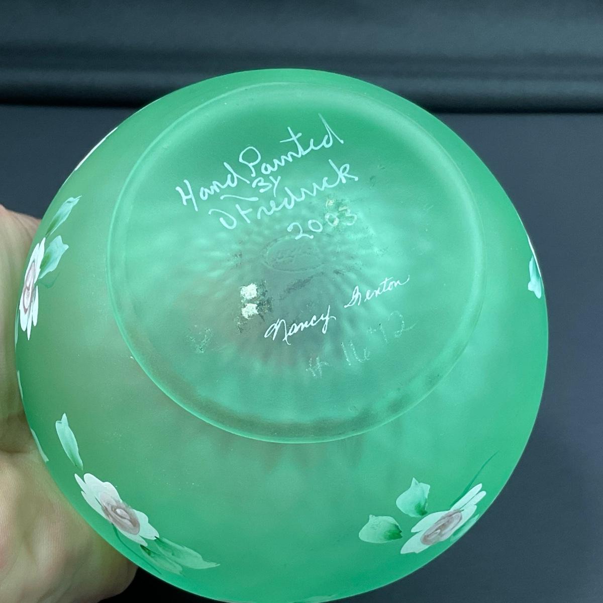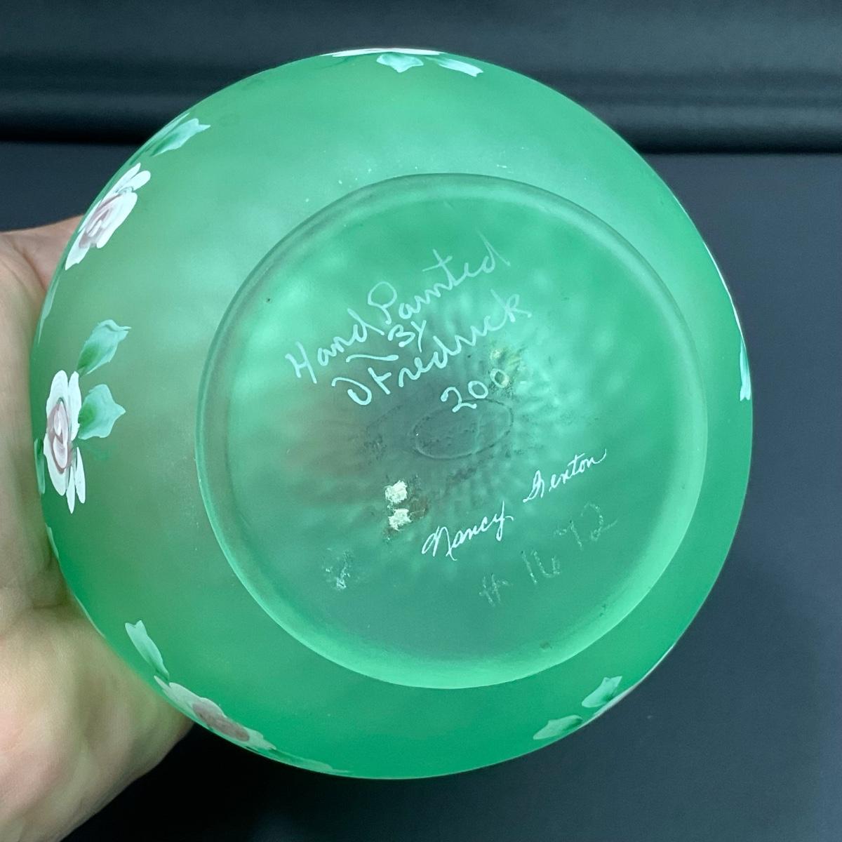 One Hand Painted Diamond Optic Opalescent Statin rose bowl signed by Nancy Fenton on the bottom. This piece does have some scuffs, scratches, marks, or slight damage, but otherwise appears to be in great shape. Please see photos for details and condition. Any condition statement is given as a courtesy to a client, is an opinion, and should not be treated as a statement of fact. Reference to condition written, oral or within a condition report shall not be regarded as a full account of condition and may not include all defects, alterations, or restorations. Absence of a condition report does not imply a lot is flawless or lacking imperfections or damage. Katherine’s Auction & Appraisal Service shall have no responsibility for any error or omission. Returns shall not be accepted on the basis of condition. ::: Shipping is available on this lot. If you require shipping you must let us know at the close of the auction. We will coordinate with you after the item has been won. Shipping fees will include insurance up to or exceeding the value of all items being mailed. If you have any questions regarding this lot please contact the auctioneer either via this website, by direct email or by phone. PICK UP TIMES and other important information can be found in the TERMS and DESCRIPTION of the auction. Please take a look for pertinent information. Thanks!