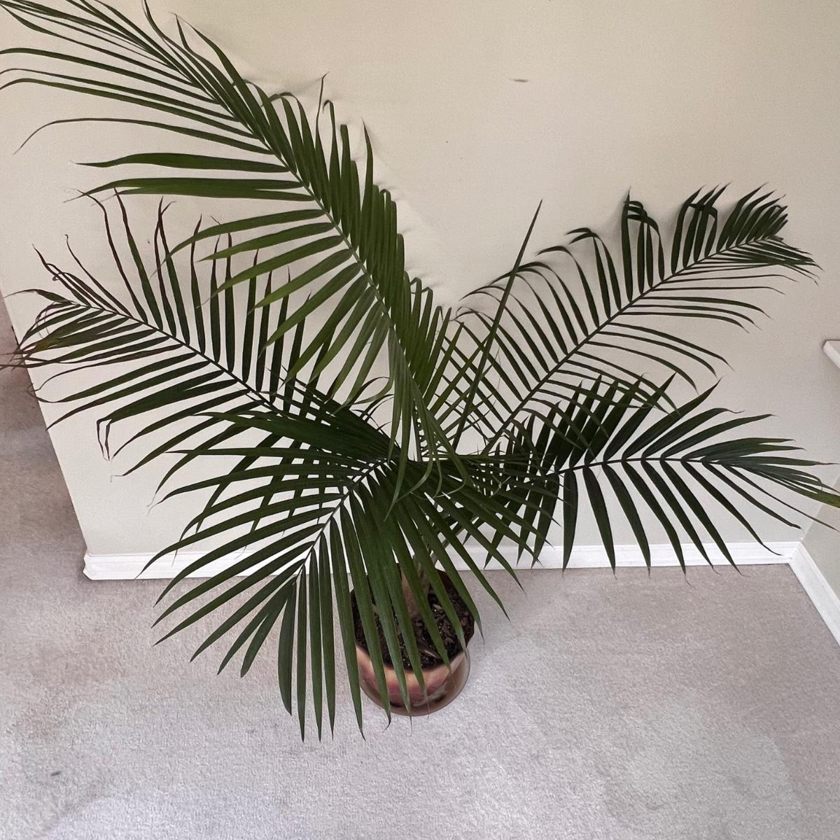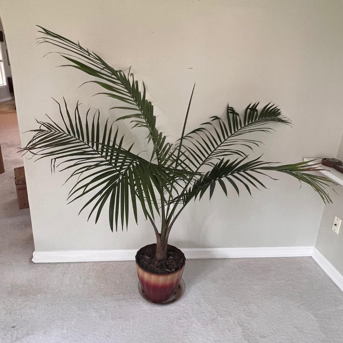 This large and healthy Areca palm stands 60” tall and is potted in an Allen + Roth plastic pot that measures 12”D x 11”H. Comes with plastic tray.
