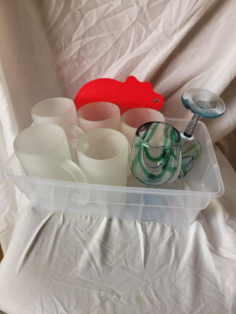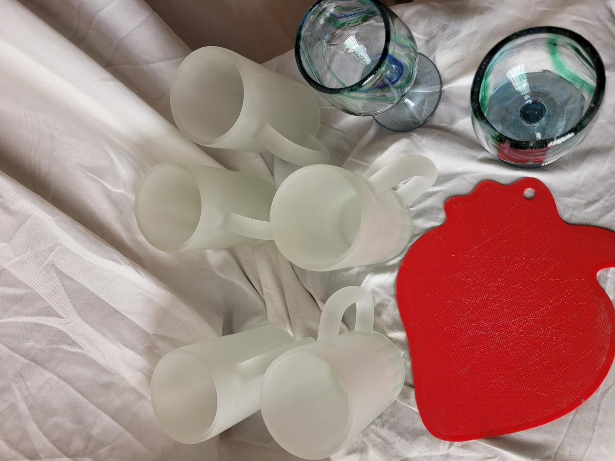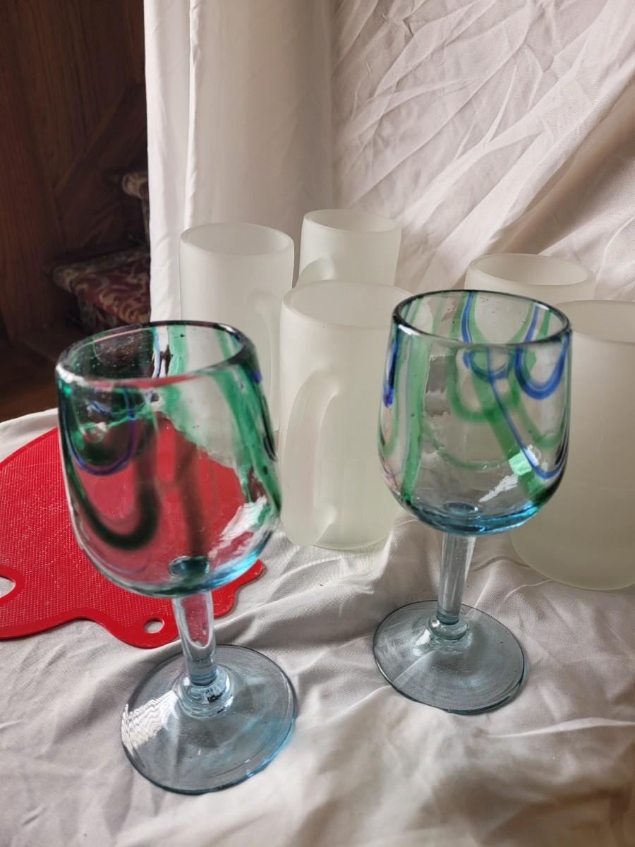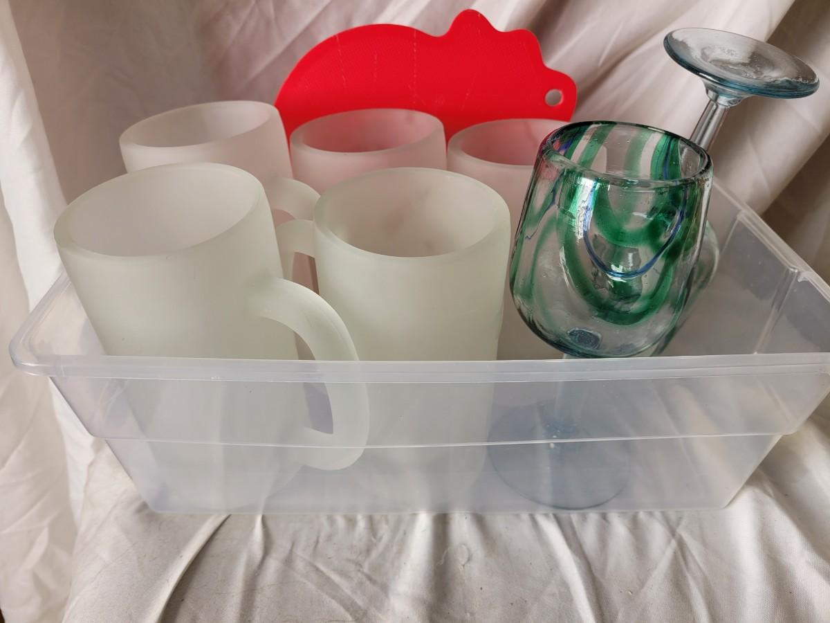 5 Frosted glasses for beer, 2 big wine/beer glasses & hotpad in a tubt