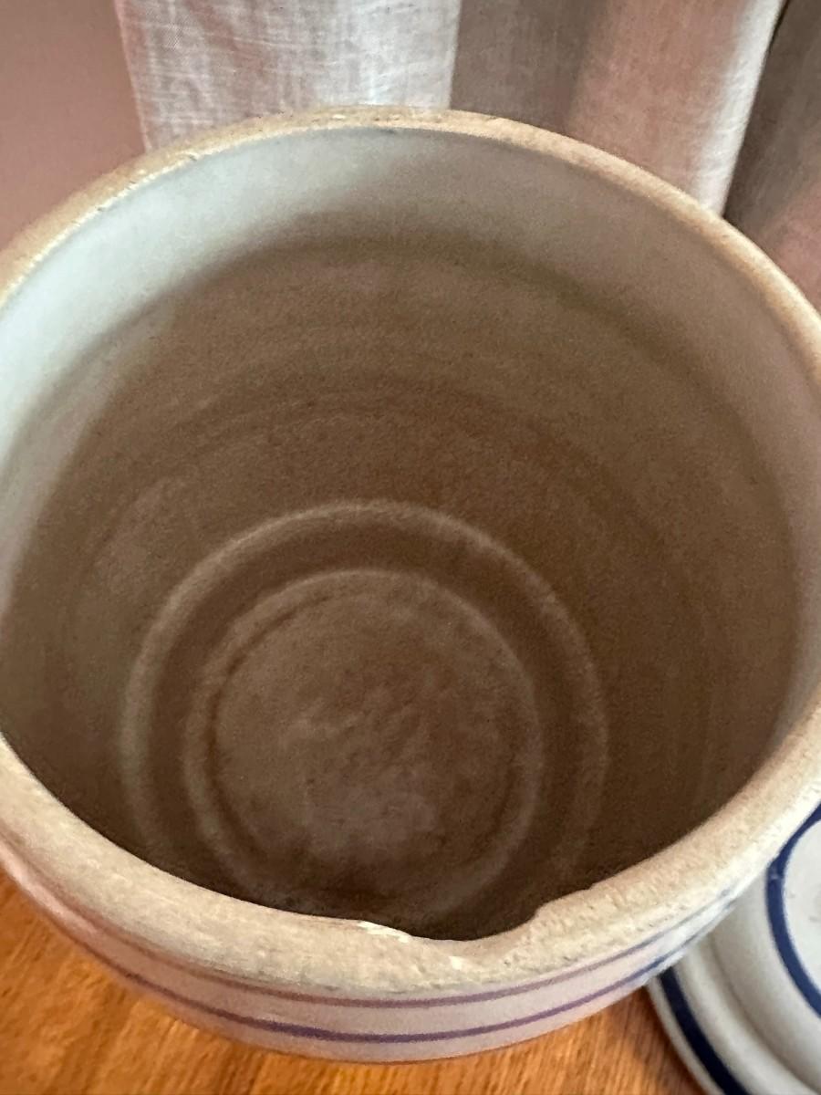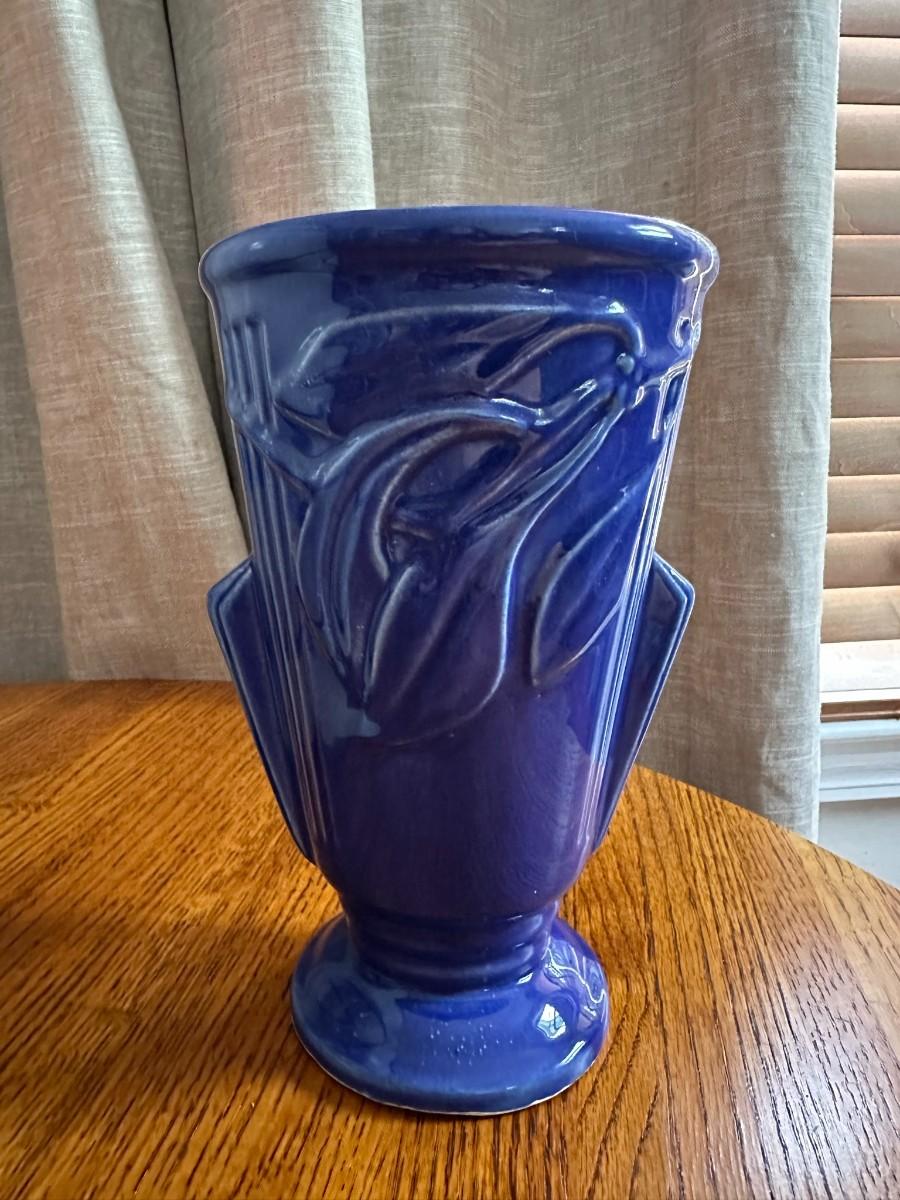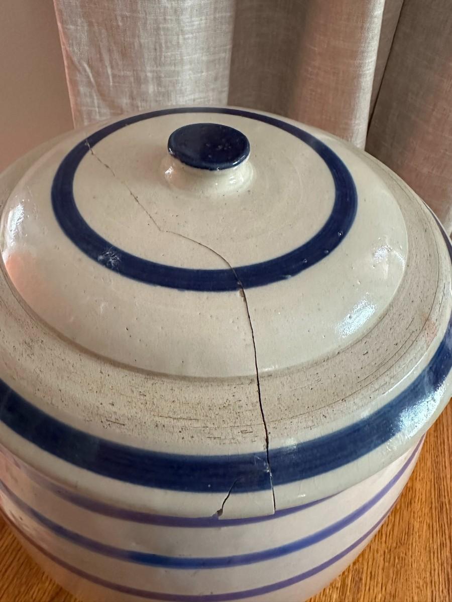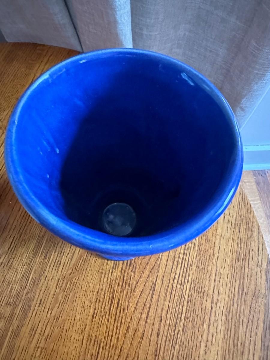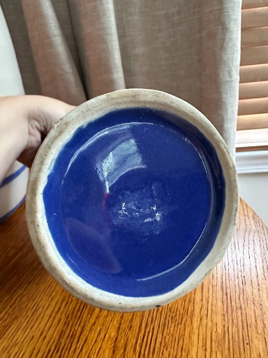 Heavy pottery jug water dispenser with hole for spicket and broken/repaired lid measures 12"w x 15"h w/o lid. Lovely blue vase, marked USA on bottom measures 8"h