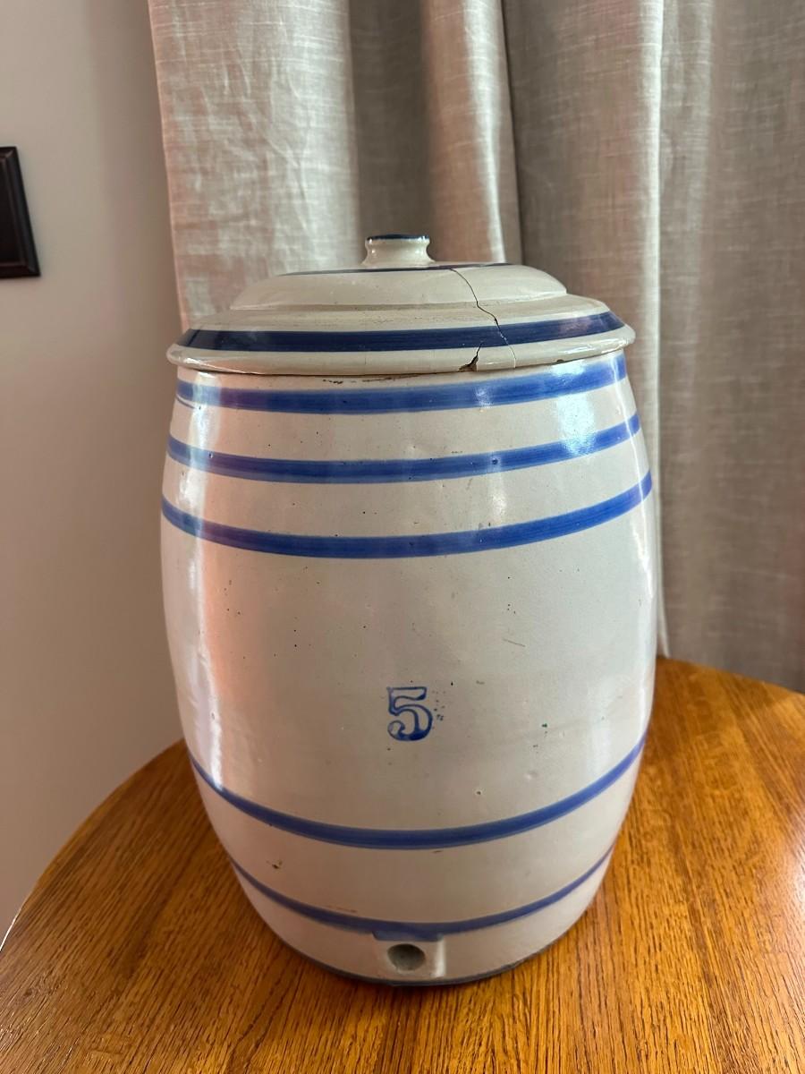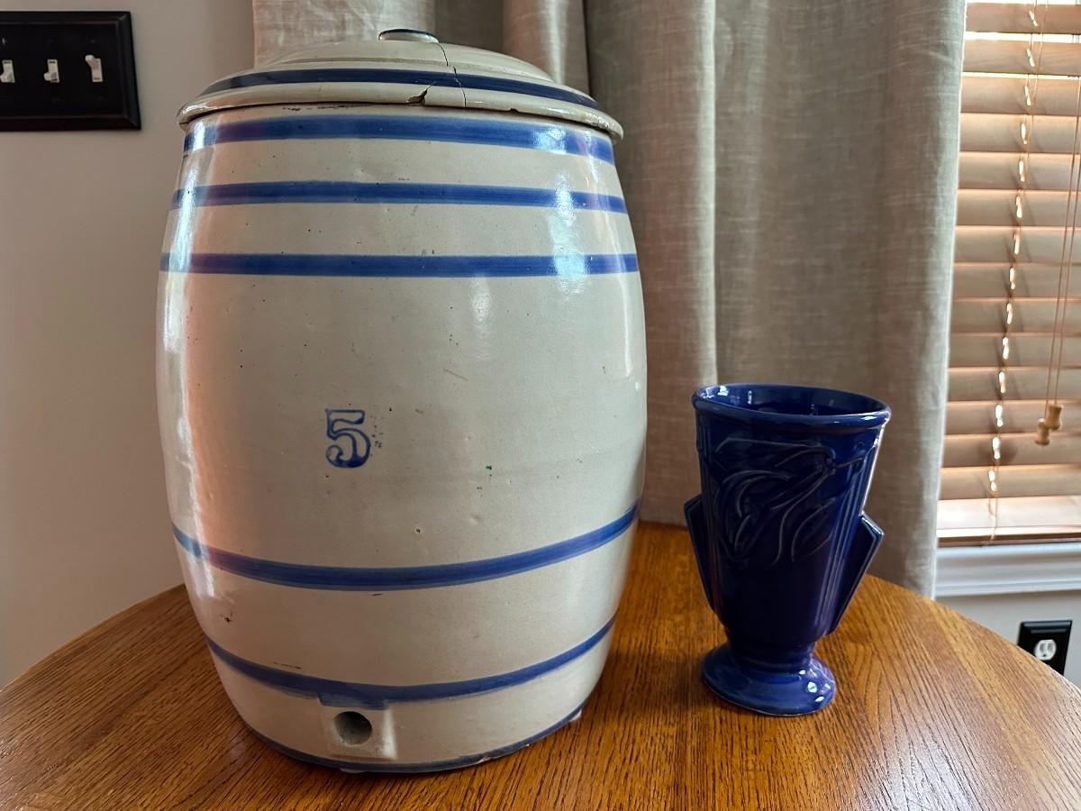 5 Gal. Pottery Water Dispenser/Jug and Blue Vase