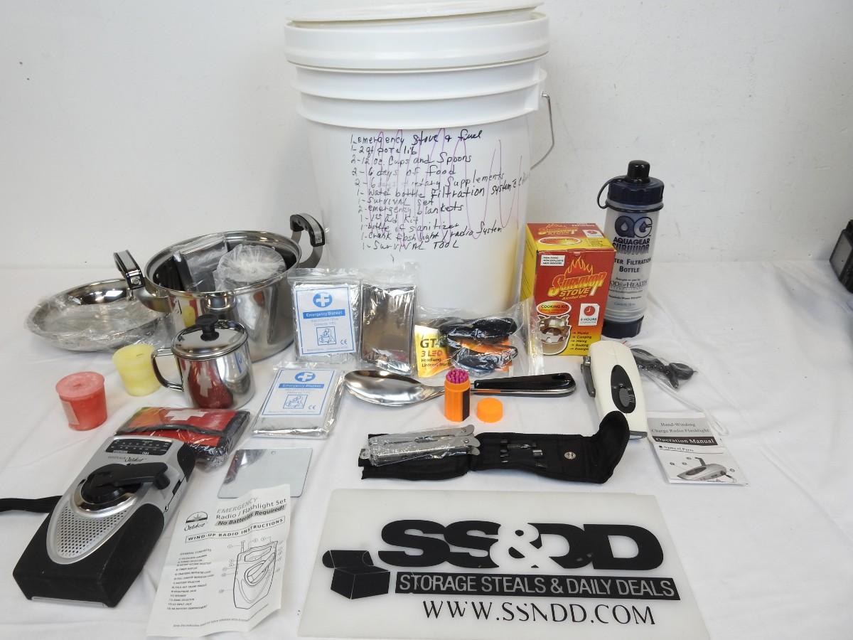5 Gallon Bucket: Complete Survival Kit: Pan, Stove, Wind up Flashlight & Radio