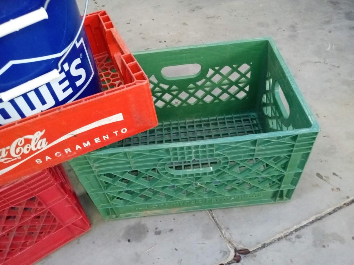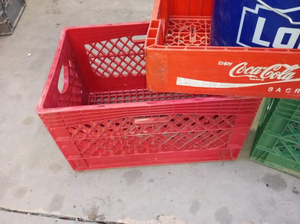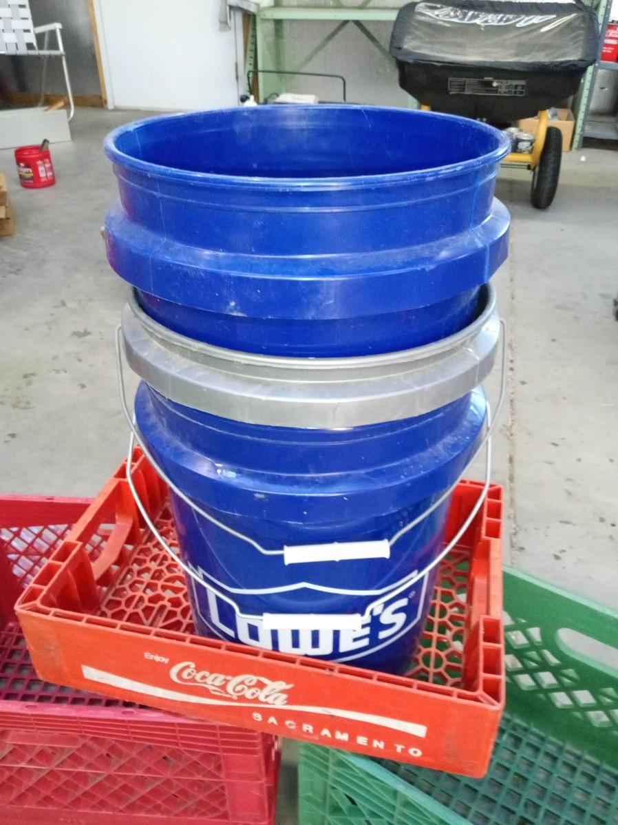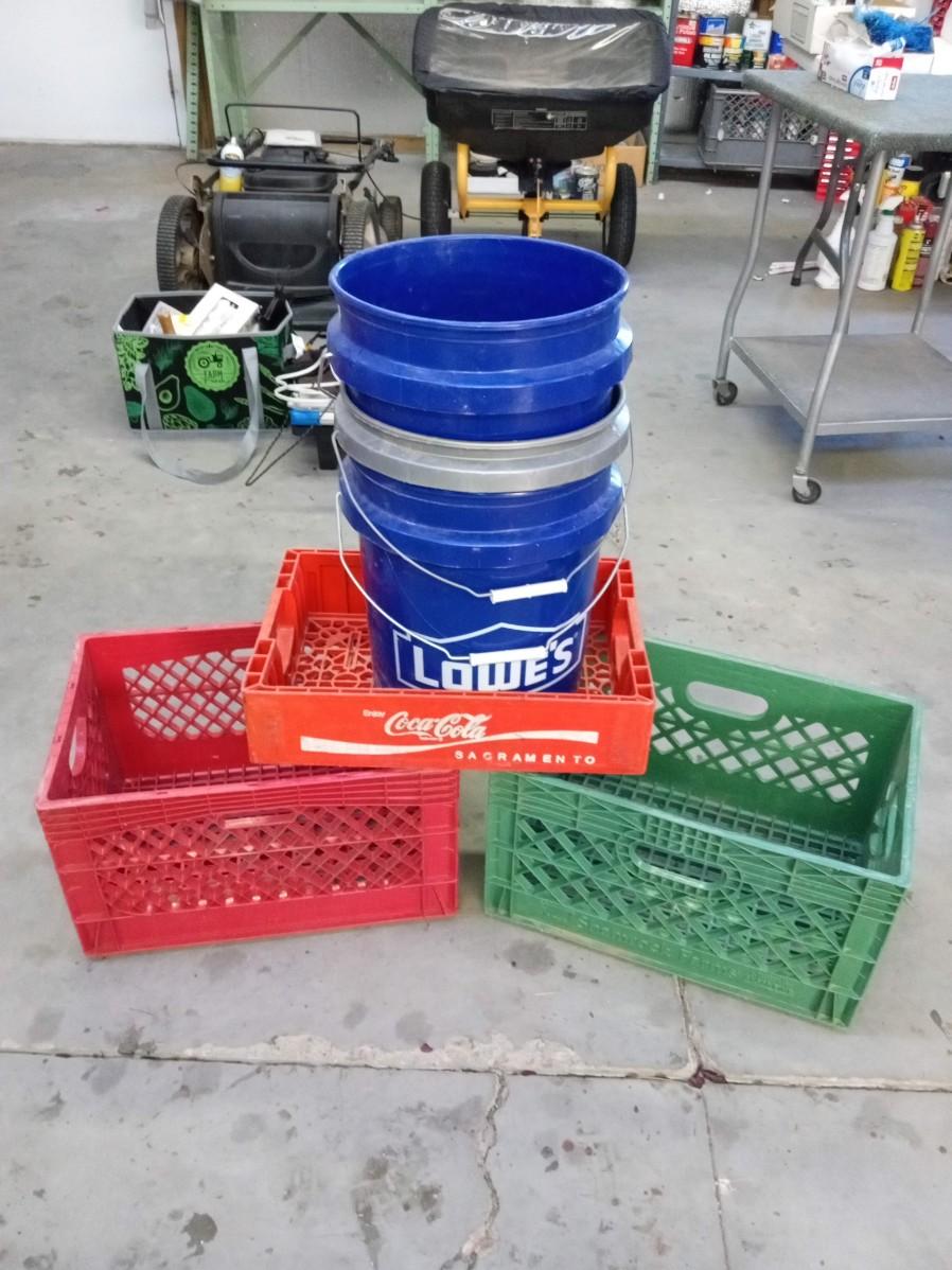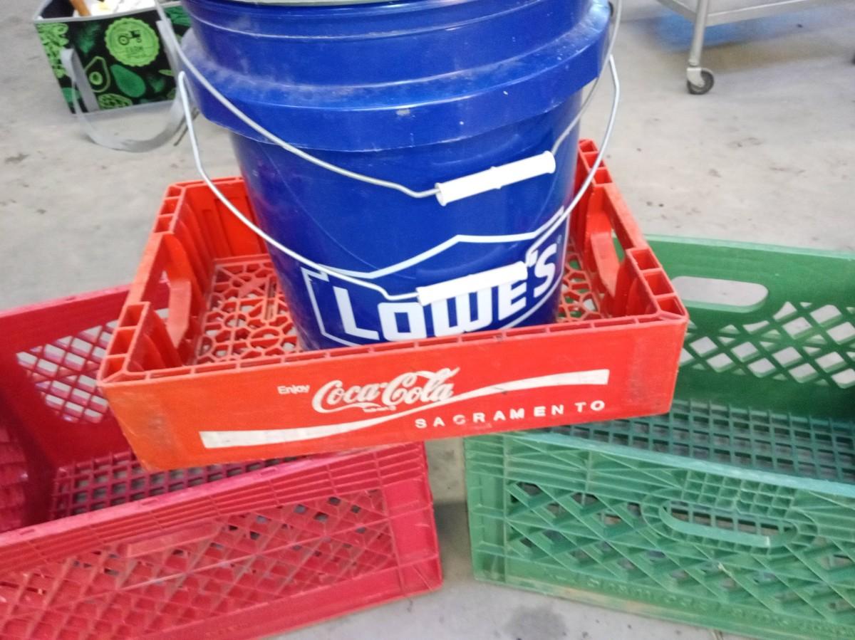 5 GALLON BUCKETS, MILK CRATES AND COCA-COLA CRATE
