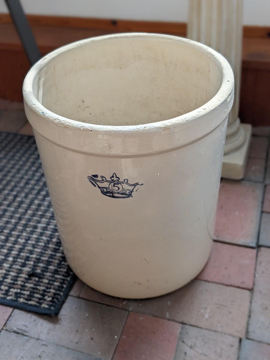 5 Gallon Stoneware Crock, Robinson Ransbottom, Blue Crown