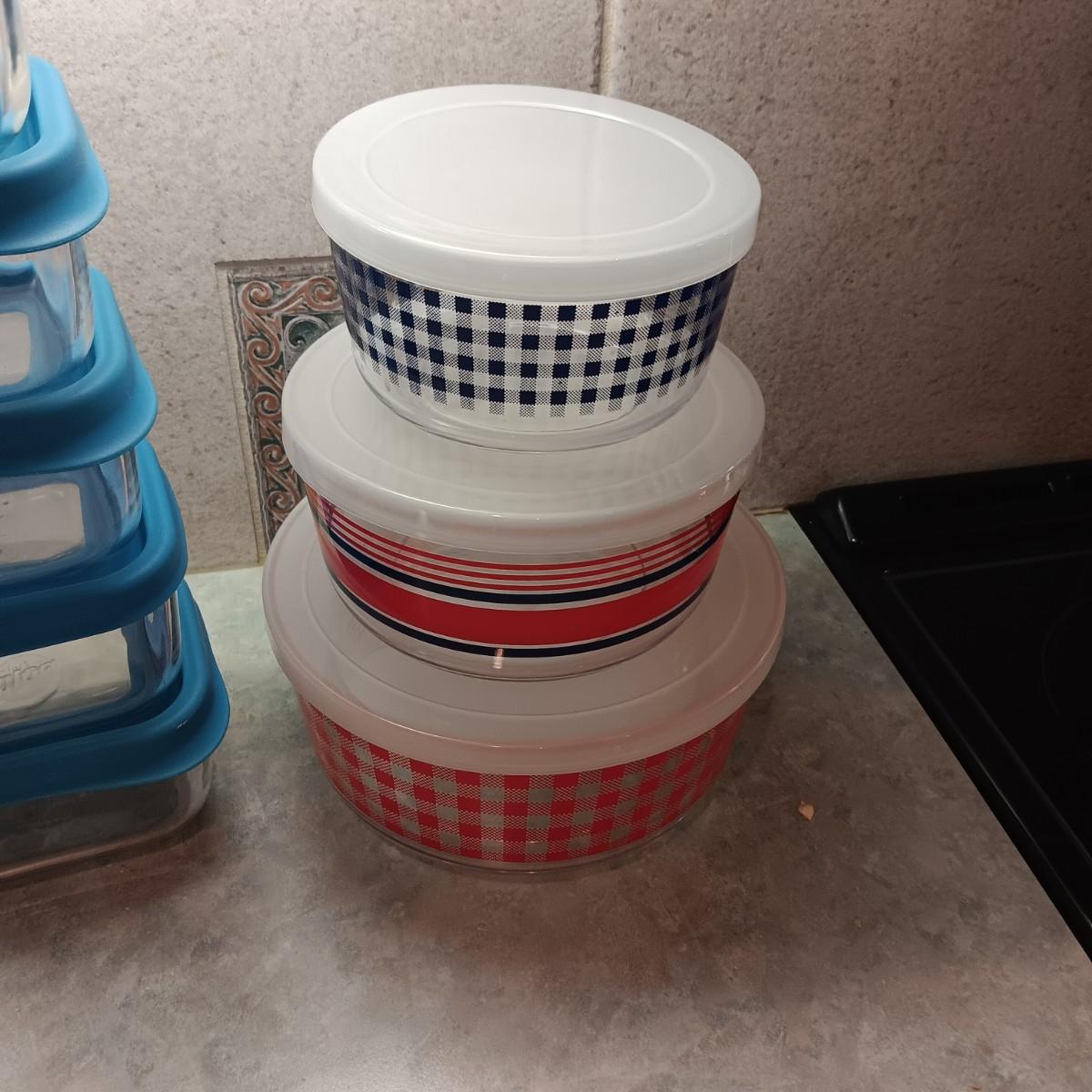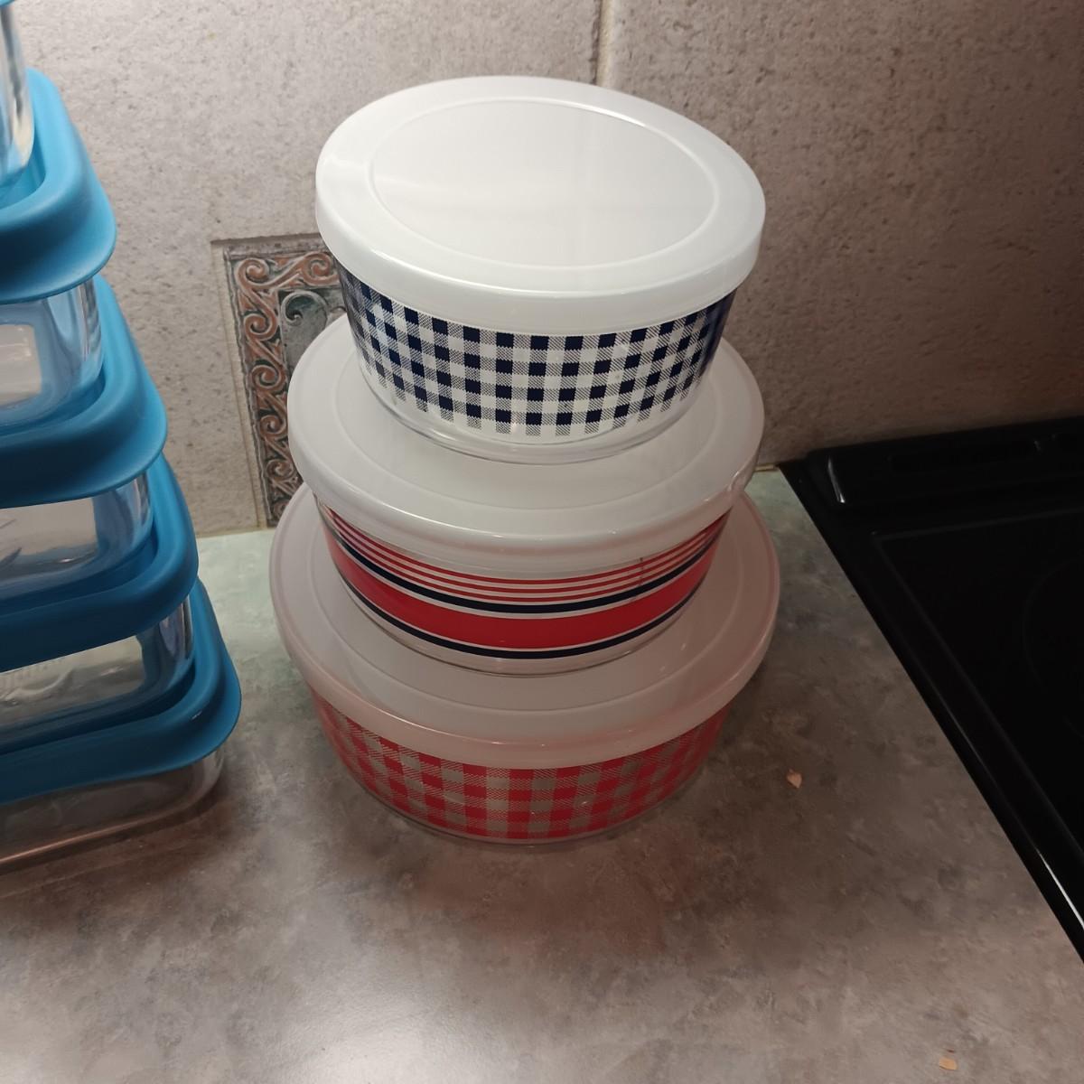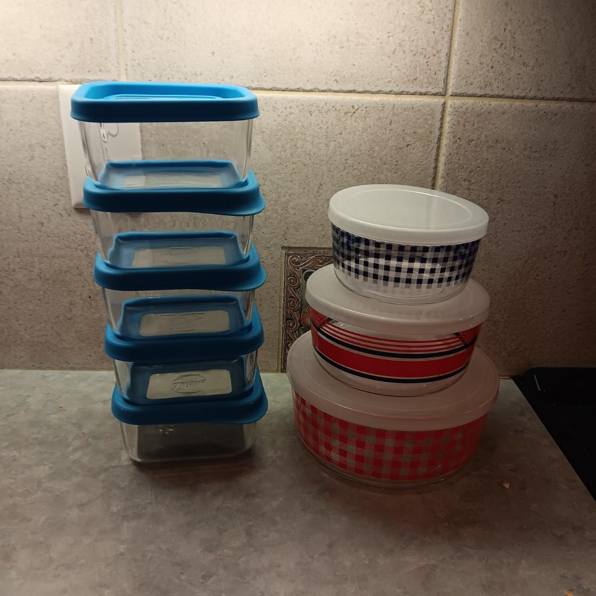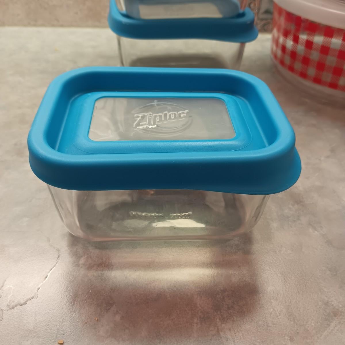 5 GLASS ZIPLOC CONTAINERS WITH LIDS AND 3 PLASTIC BOWLS WITH LIDS