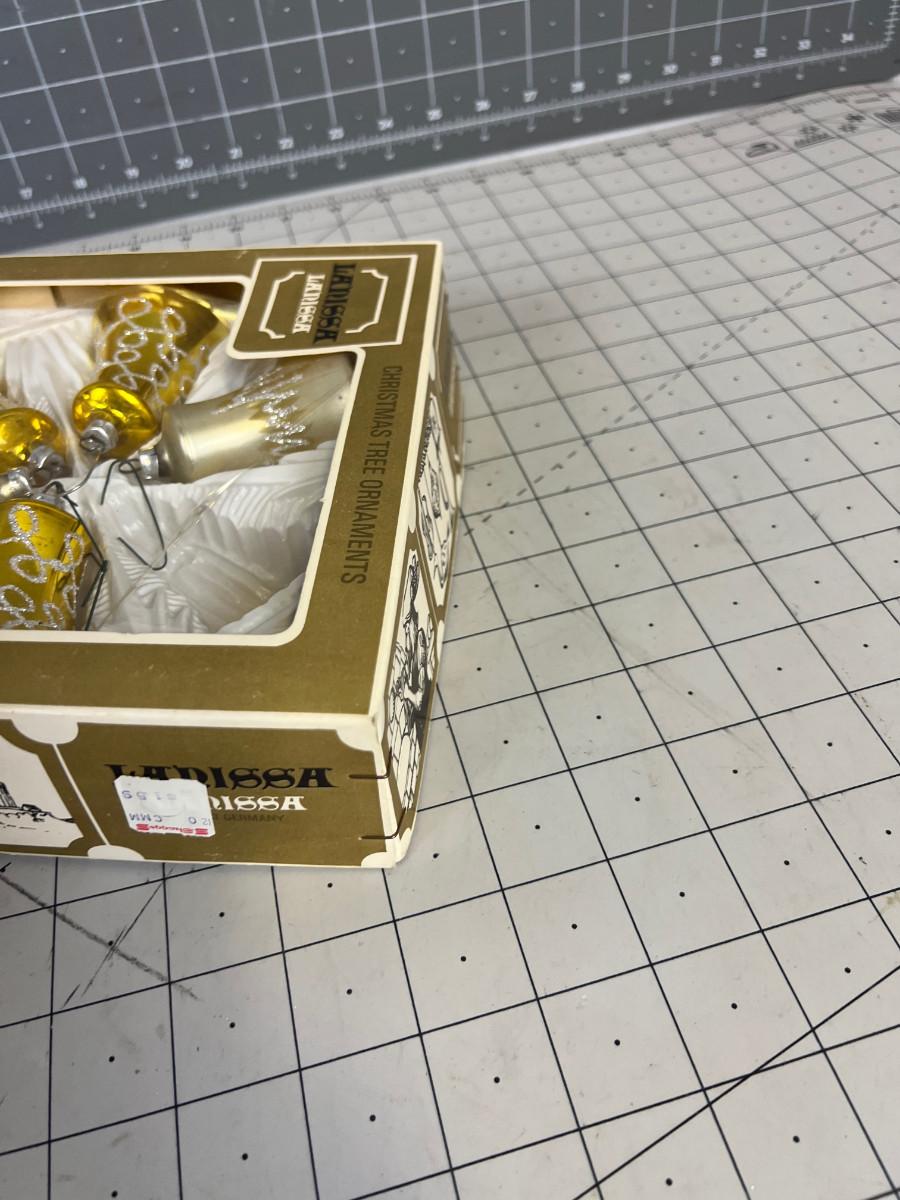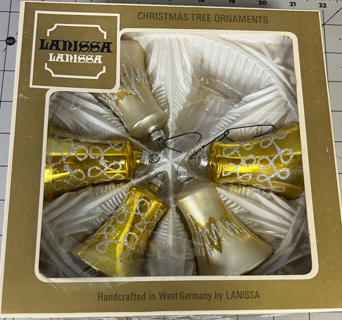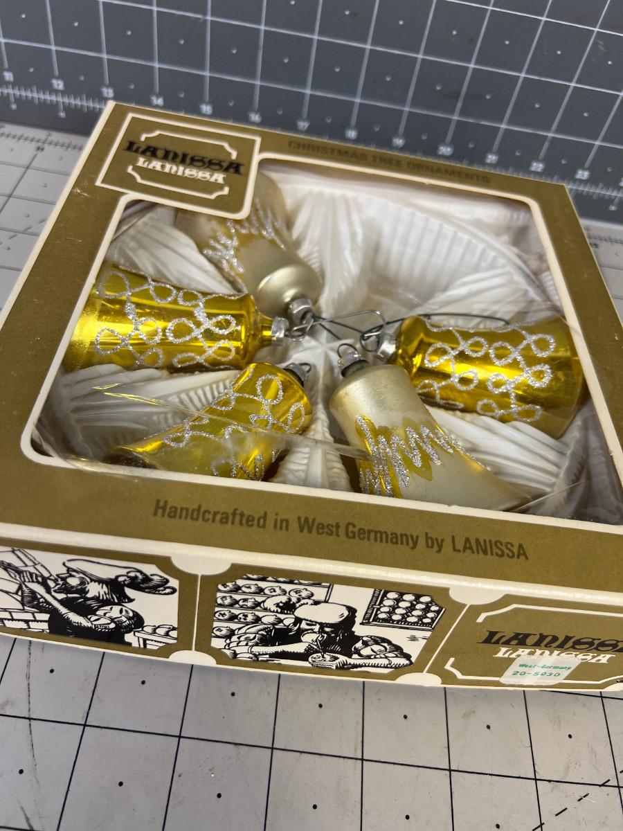 5 Gold and White Glass Bell Ornaments, From West Germany