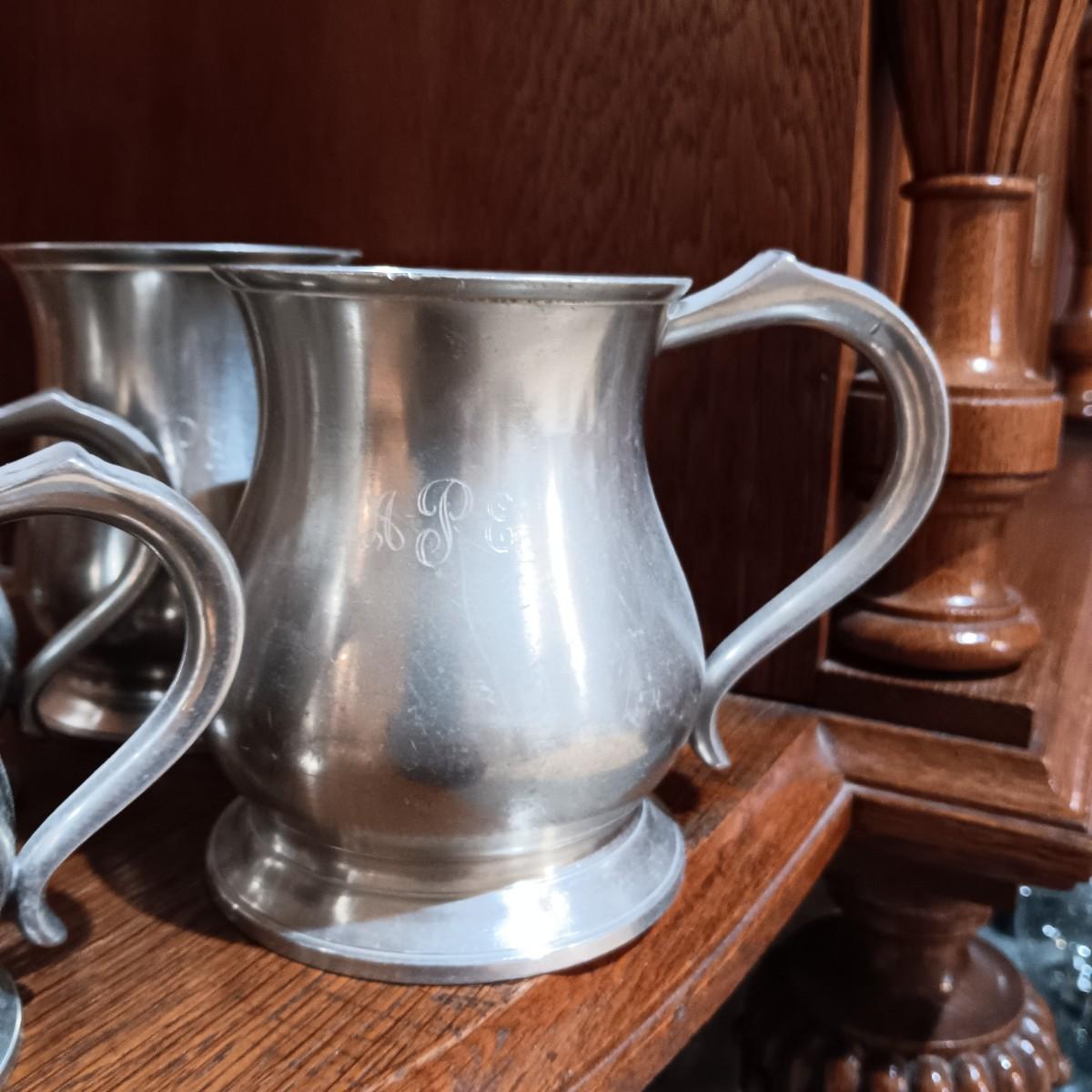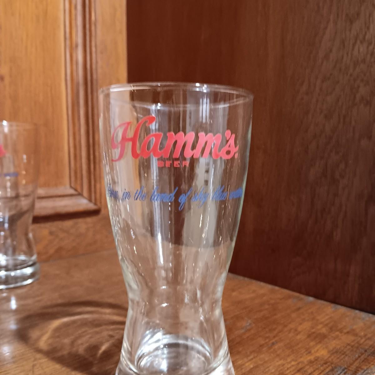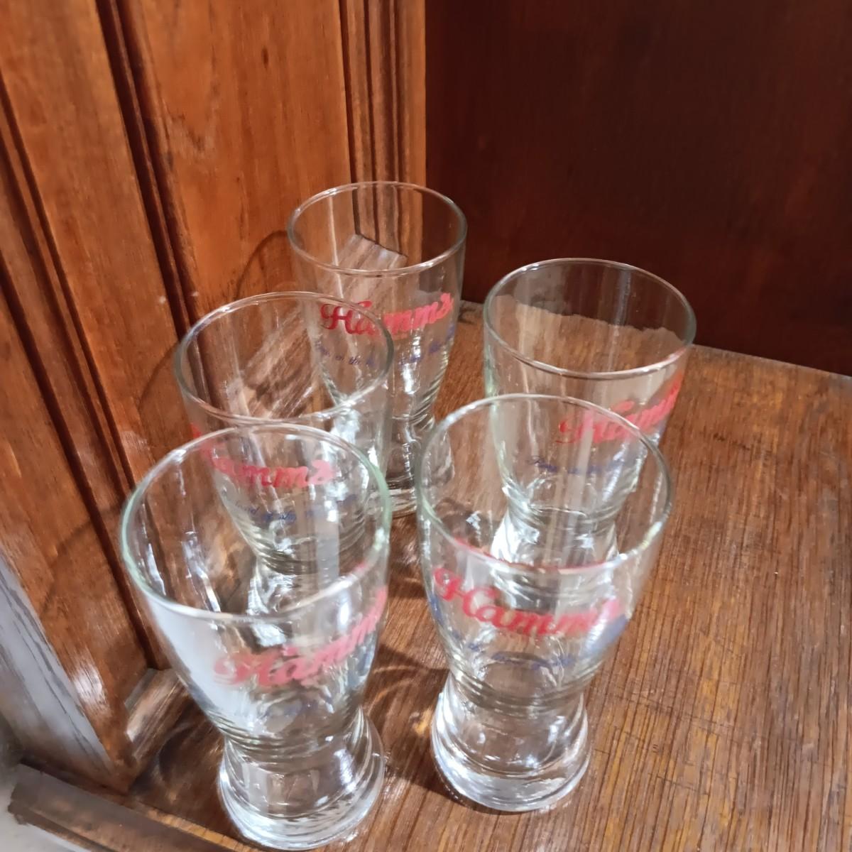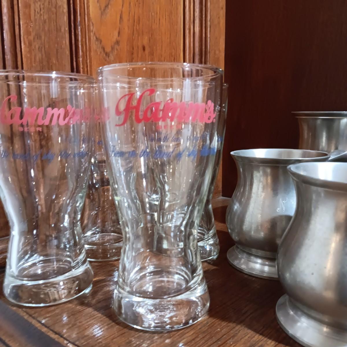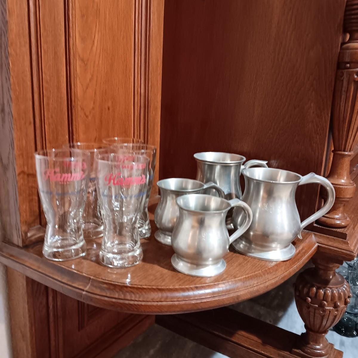 5 HAMM'S GLASSES AND 4 HEAVY PEWTER MUGS MADE IN LONDON